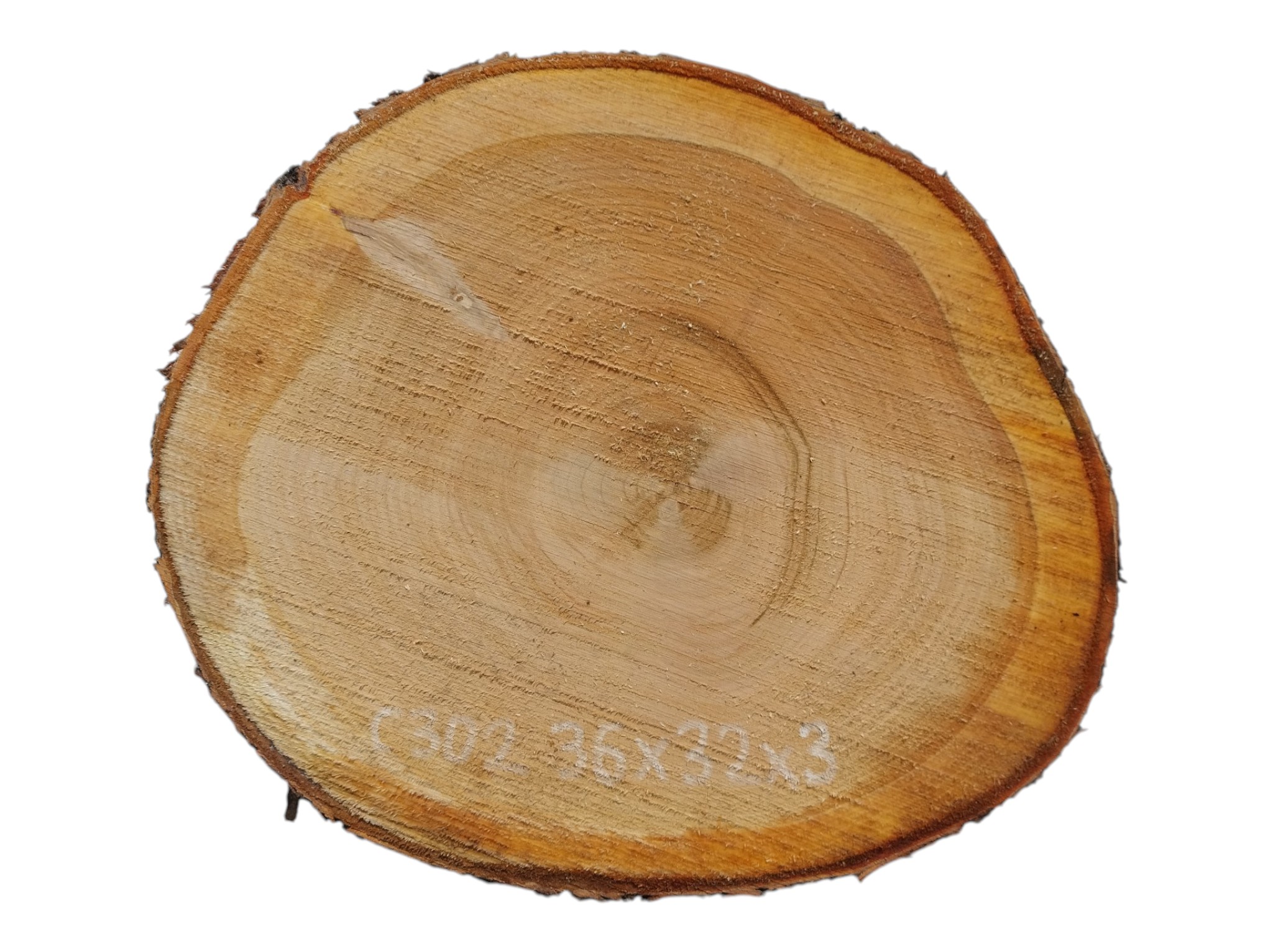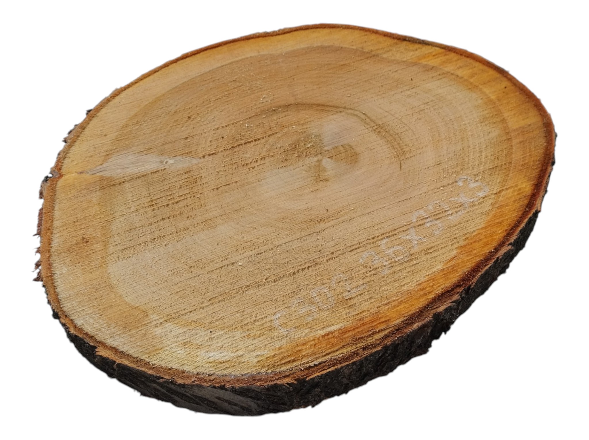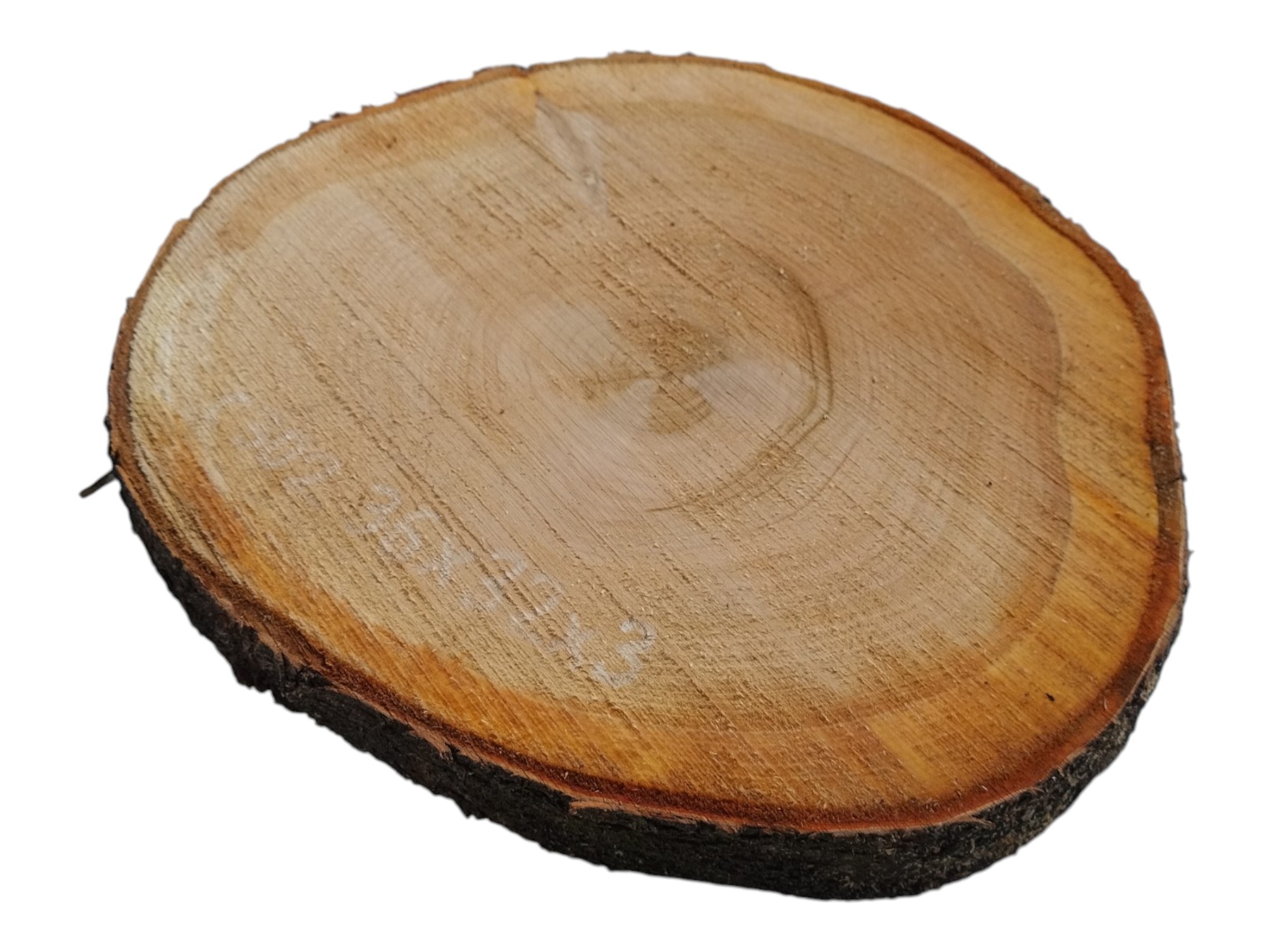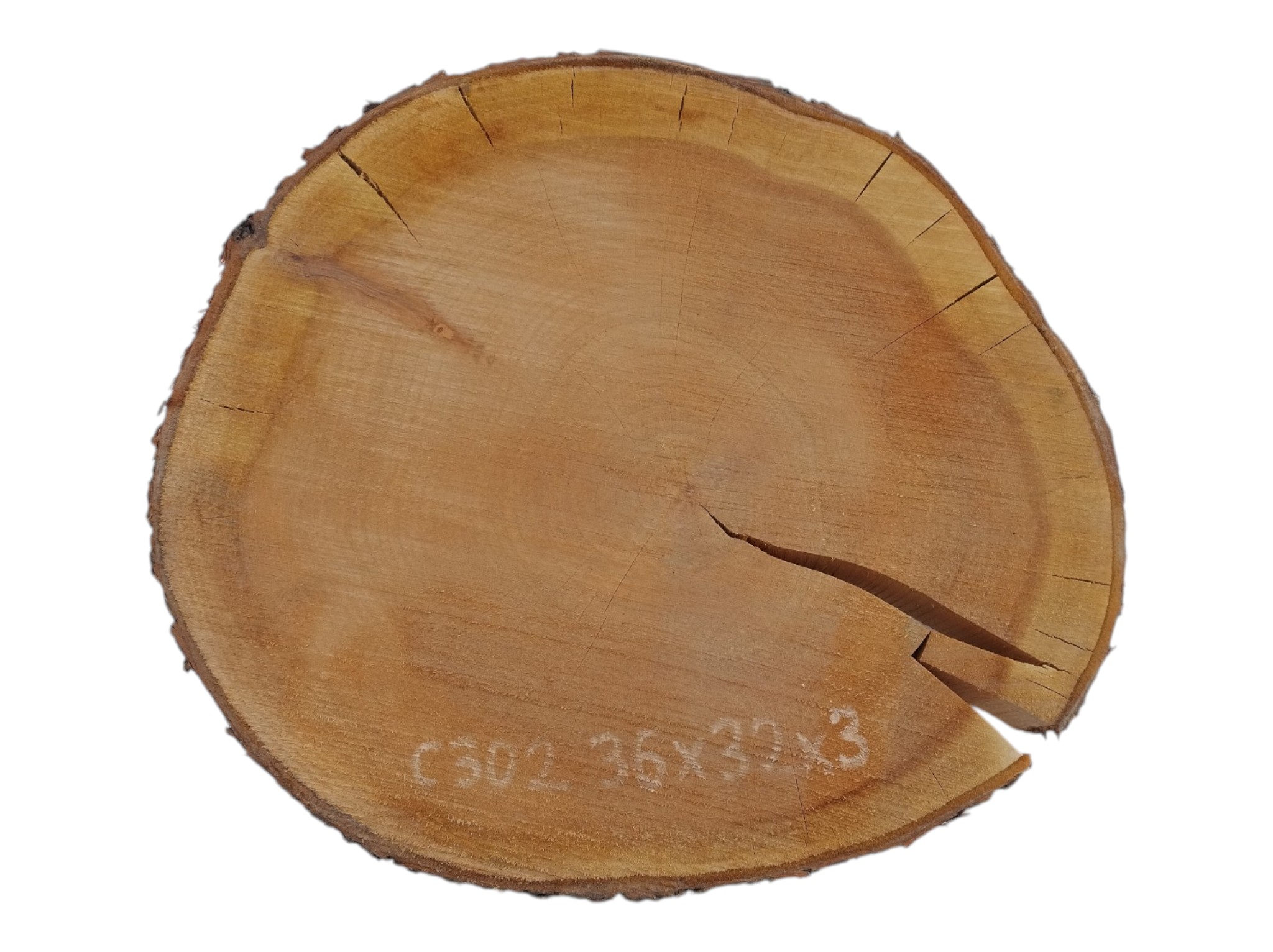 Zdjęcia robimy od razu po przecięciu, żeby jak najlepiej pokazać w jaki sposób można wyprowadzić plaster i podkreślić jego strukturę. W procesie suszenia naturalną rzeczą są pęknięcia materiału powstałe w skutek oddawania wilgoci oraz powierzchowna zmiana barwy. Zdjęcie nr 2 w galerii przedstawia stan plastra z kwietnia 2026 – wtedy została zmierzona podana wilgotność.