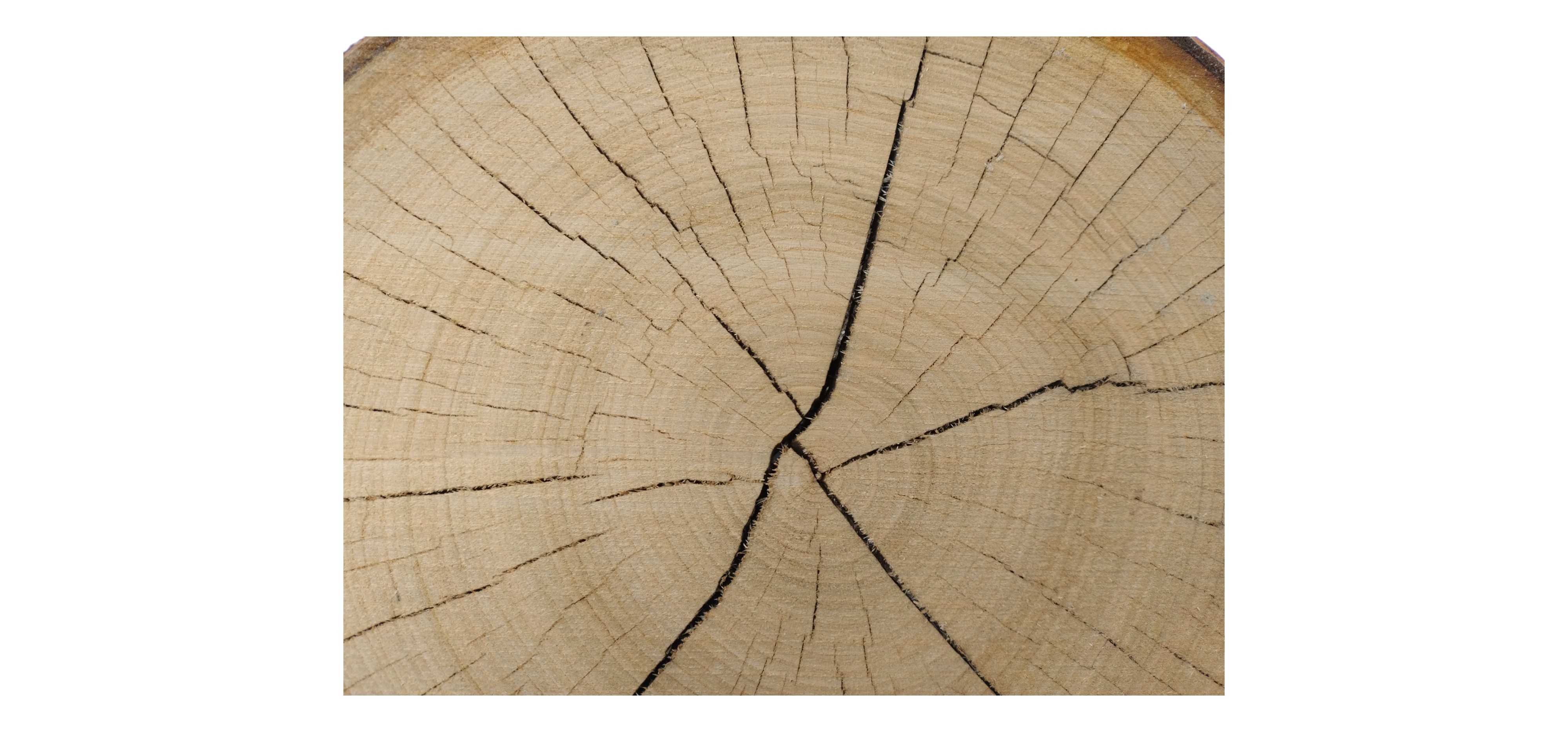 Zdjęcia robimy od razu po przecięciu, żeby jak najlepiej pokazać w jaki sposób można wyprowadzić plaster i podkreślić jego strukturę. W procesie suszenia naturalną rzeczą są pęknięcia materiału powstałe w skutek oddawania wilgoci oraz powierzchowna zmiana barwy. Zdjęcie nr 2 w galerii przedstawia stan plastra z grudnia 2025 – wtedy została zmierzona podana wilgotność.