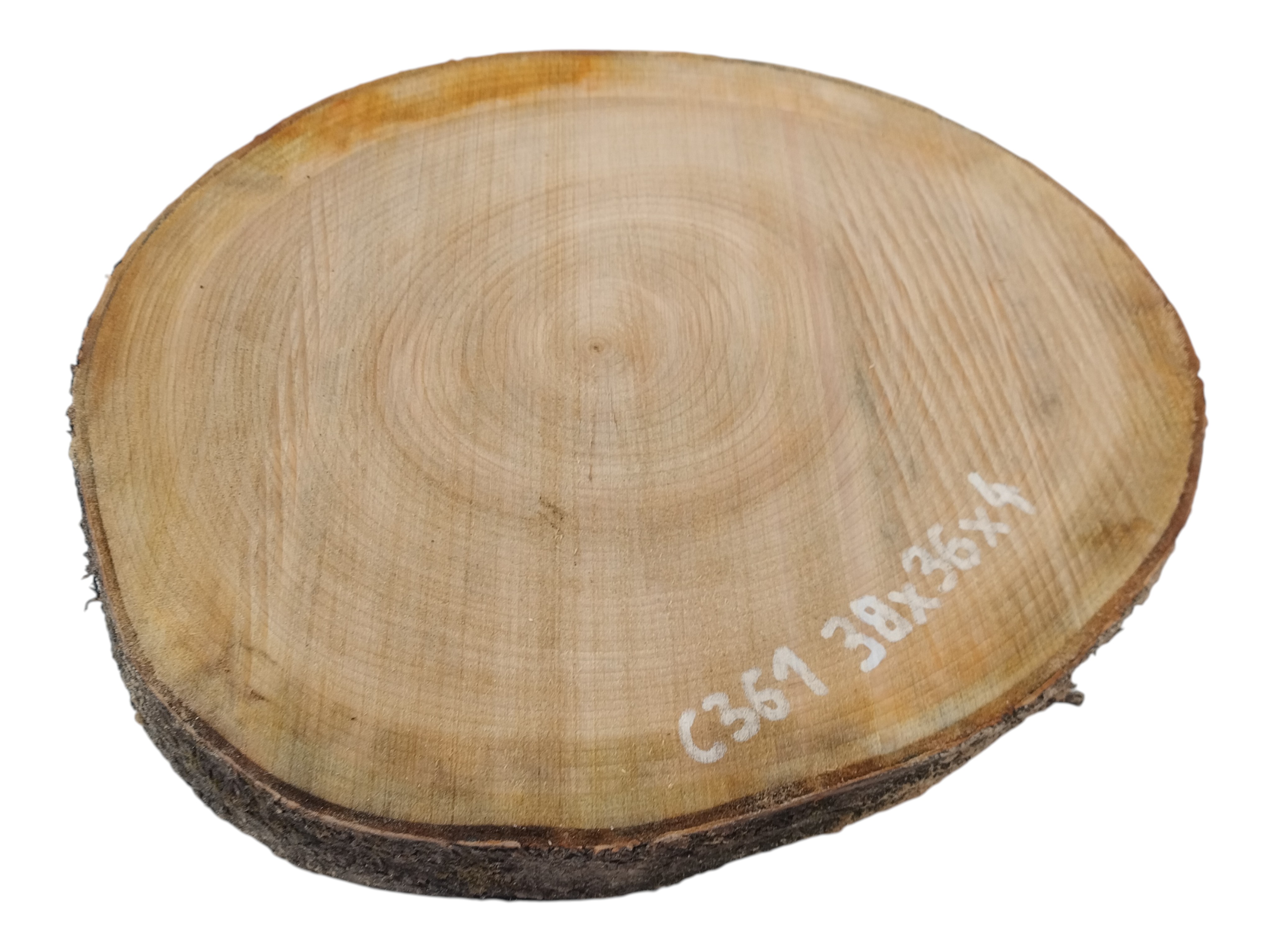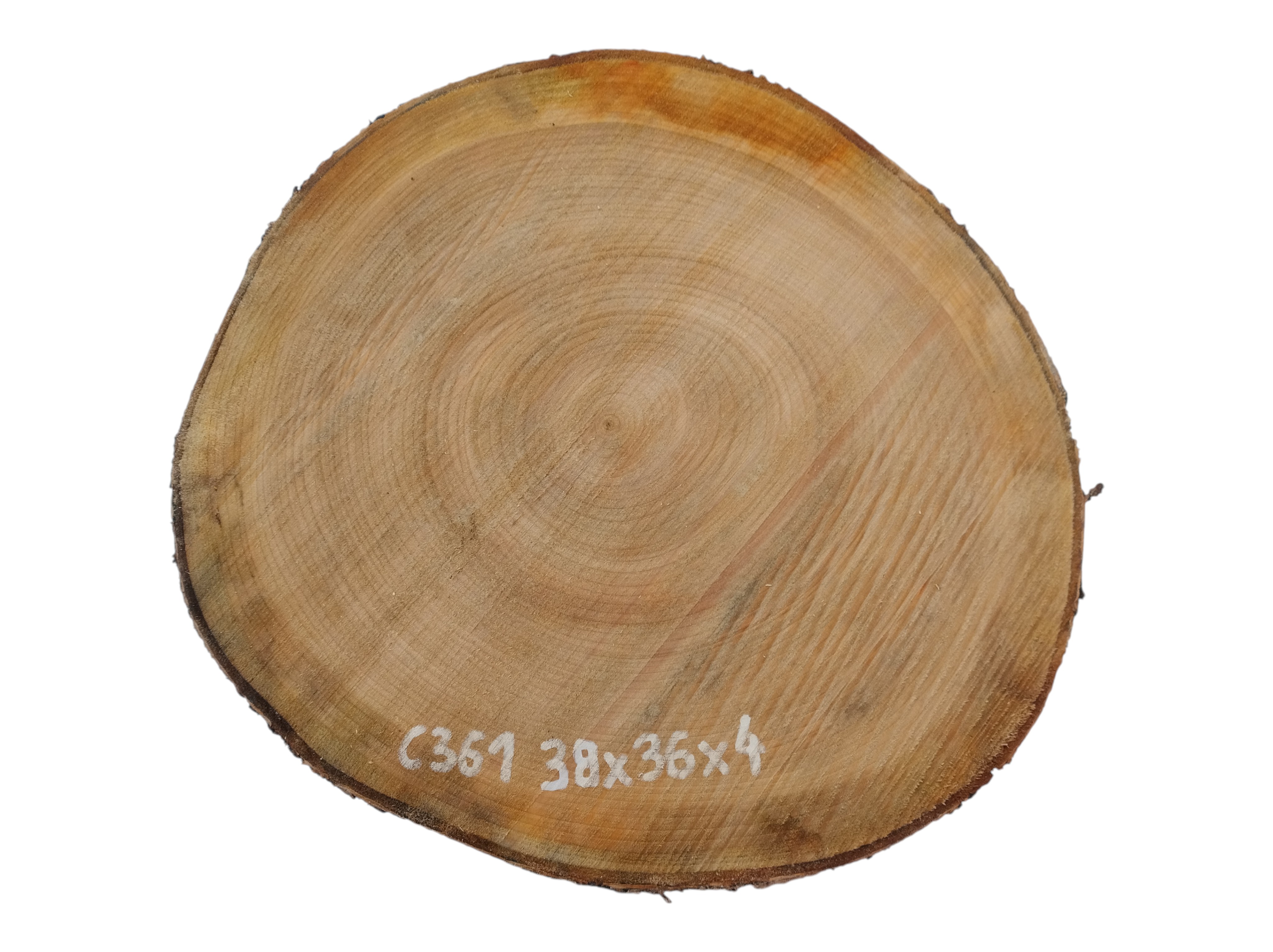 Zdjęcia robimy od razu po przecięciu, żeby jak najlepiej pokazać w jaki sposób można wyprowadzić plaster i podkreślić jego strukturę. W procesie suszenia naturalną rzeczą są pęknięcia materiału powstałe w skutek oddawania wilgoci oraz powierzchowna zmiana barwy. Zdjęcie nr 2 w galerii przedstawia stan plastra z lutego 2026 – wtedy została zmierzona podana wilgotność.