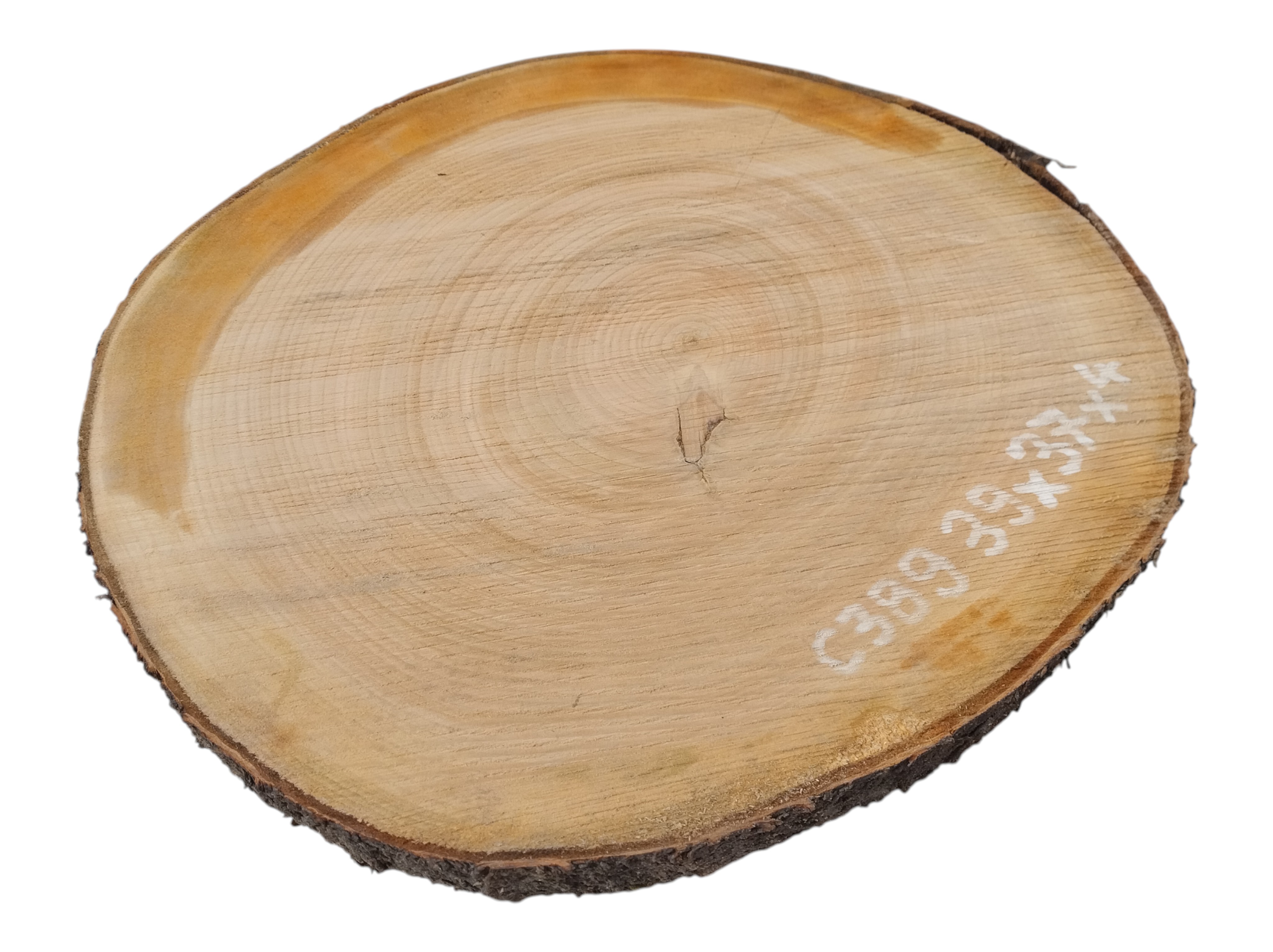 Zdjęcia robimy od razu po przecięciu, żeby jak najlepiej pokazać w jaki sposób można wyprowadzić plaster i podkreślić jego strukturę. W procesie suszenia naturalną rzeczą są pęknięcia materiału powstałe w skutek oddawania wilgoci oraz powierzchowna zmiana barwy. Zdjęcie nr 2 w galerii przedstawia stan plastra z lutego 2026 – wtedy została zmierzona podana wilgotność.