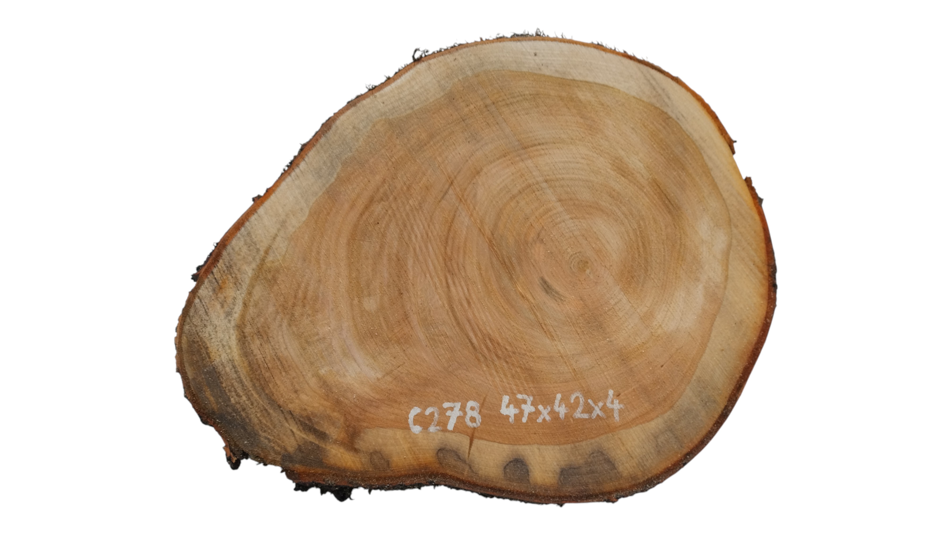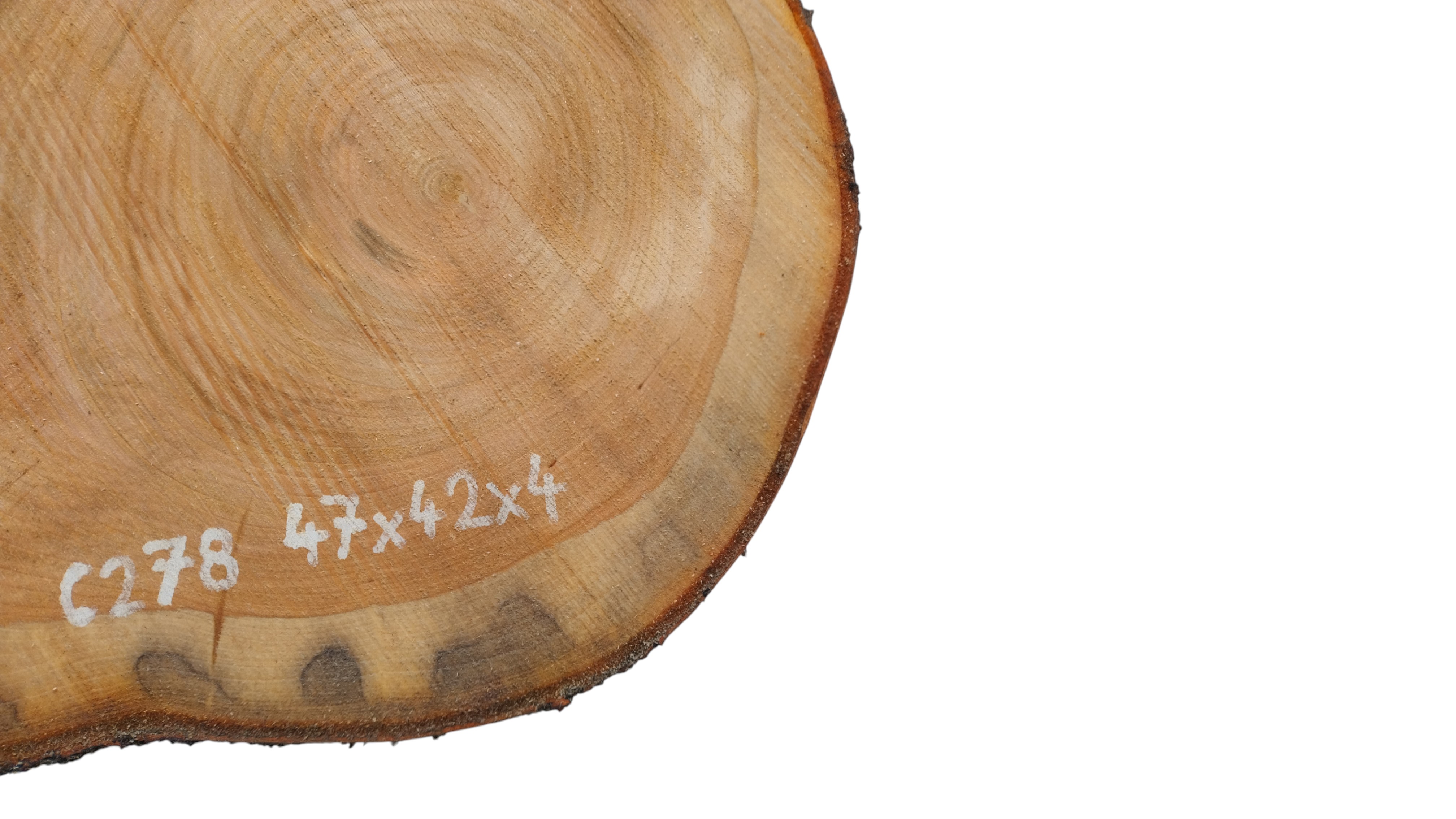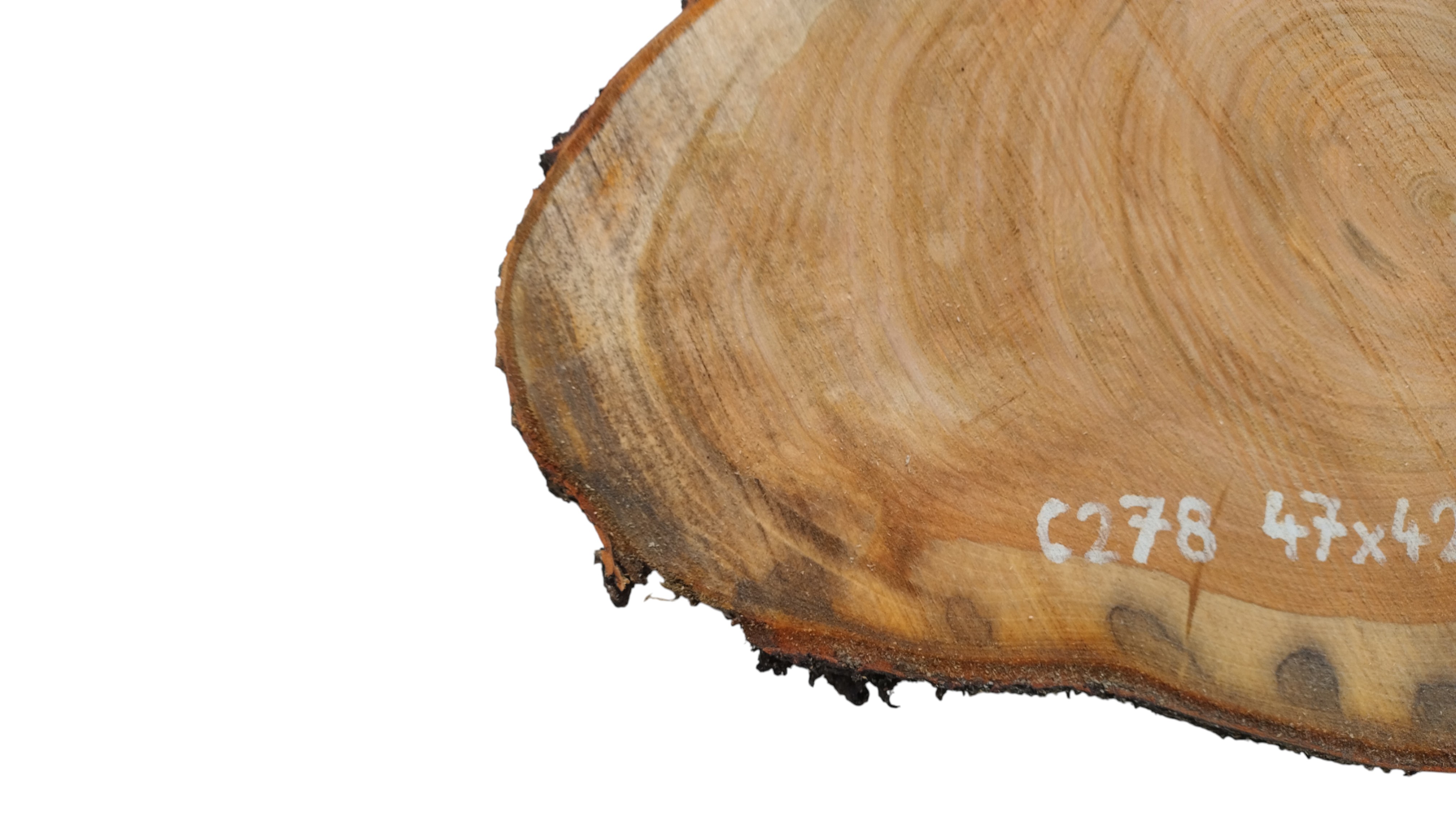 Zdjęcia robimy od razu po przecięciu, żeby jak najlepiej pokazać w jaki sposób można wyprowadzić plaster i podkreślić jego strukturę. W procesie suszenia naturalną rzeczą są pęknięcia materiału powstałe w skutek oddawania wilgoci oraz powierzchowna zmiana barwy. Zdjęcie nr 2 w galerii przedstawia stan plastra z października 2025 – wtedy została zmierzona podana wilgotność.