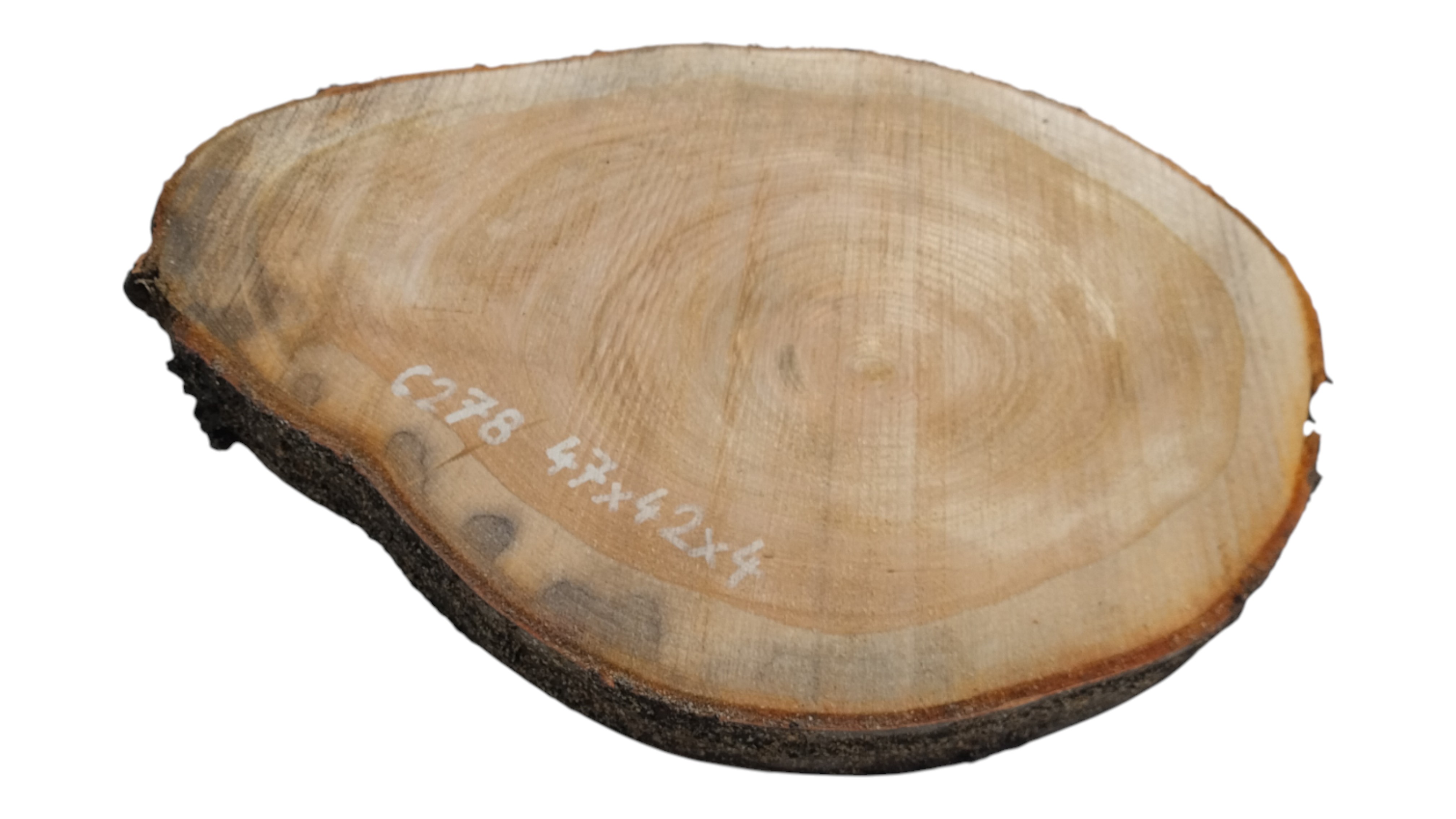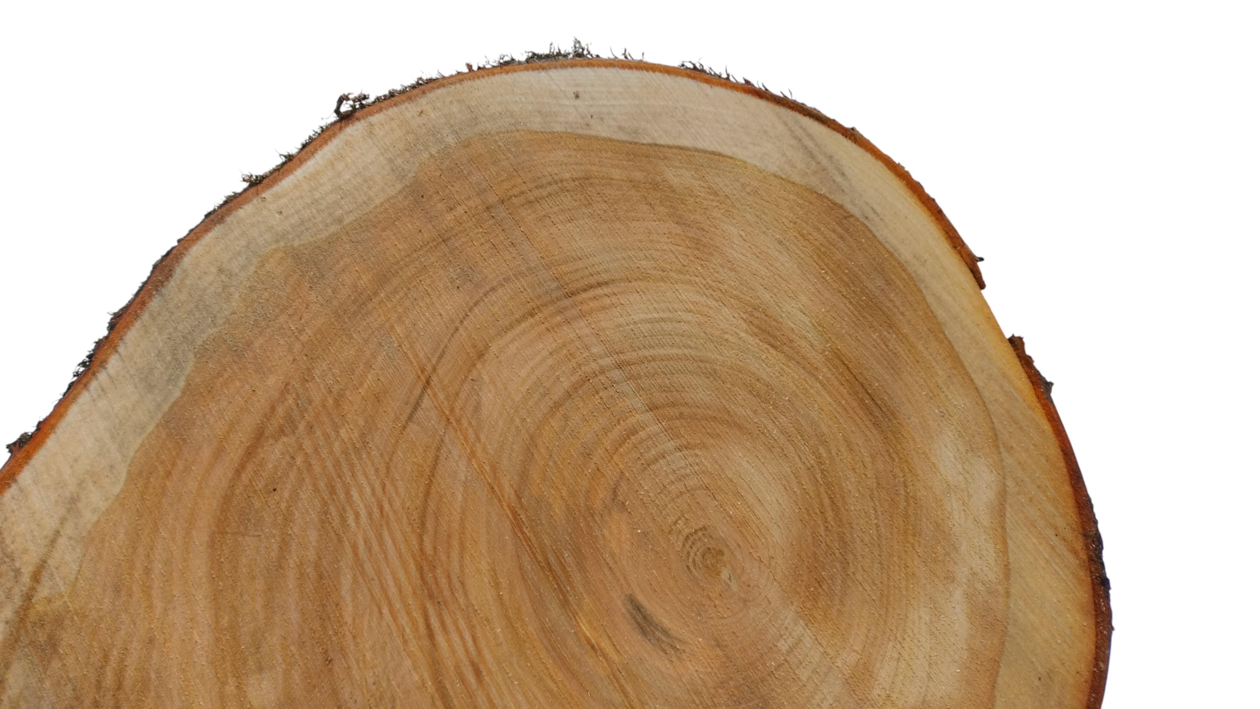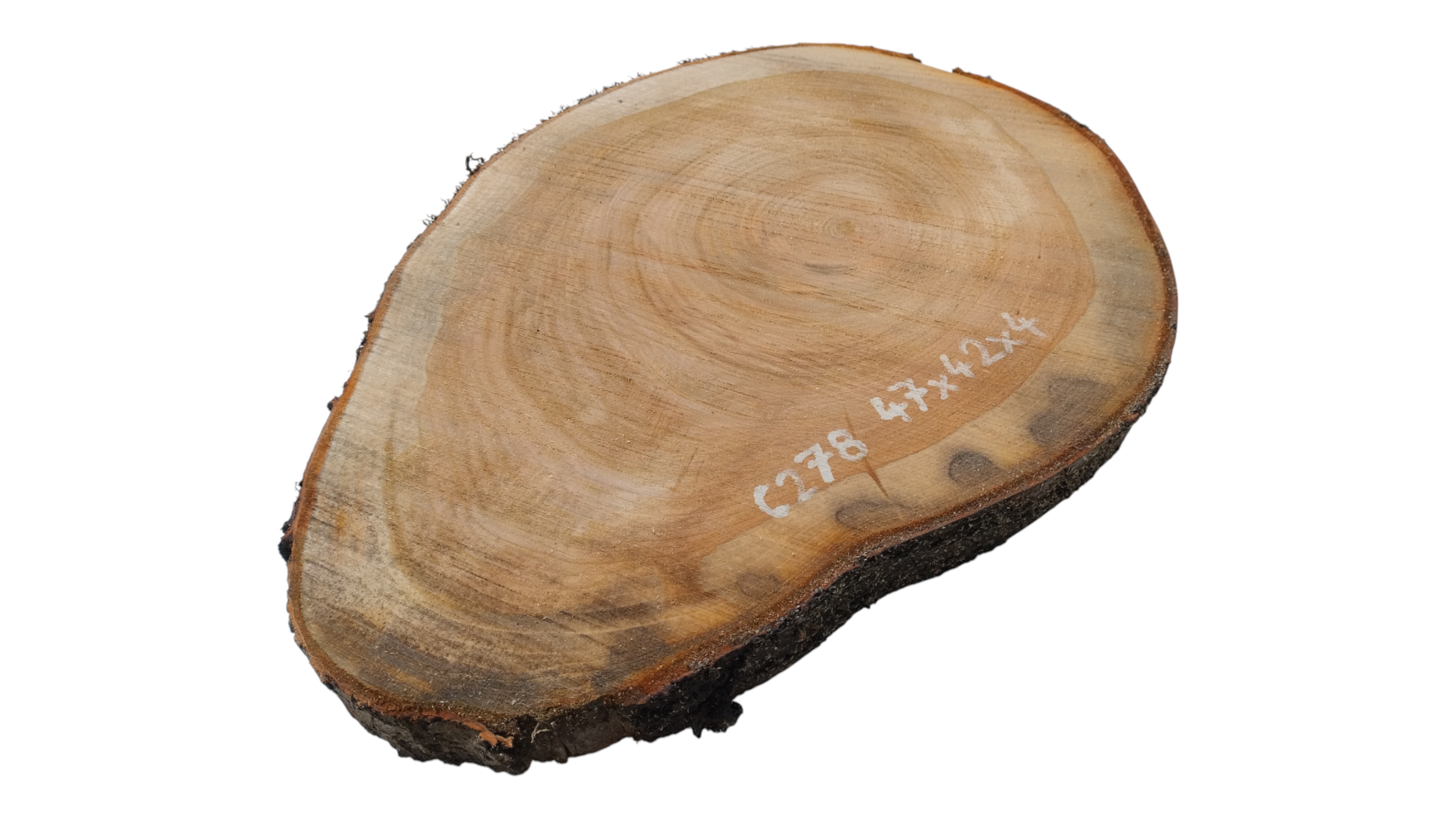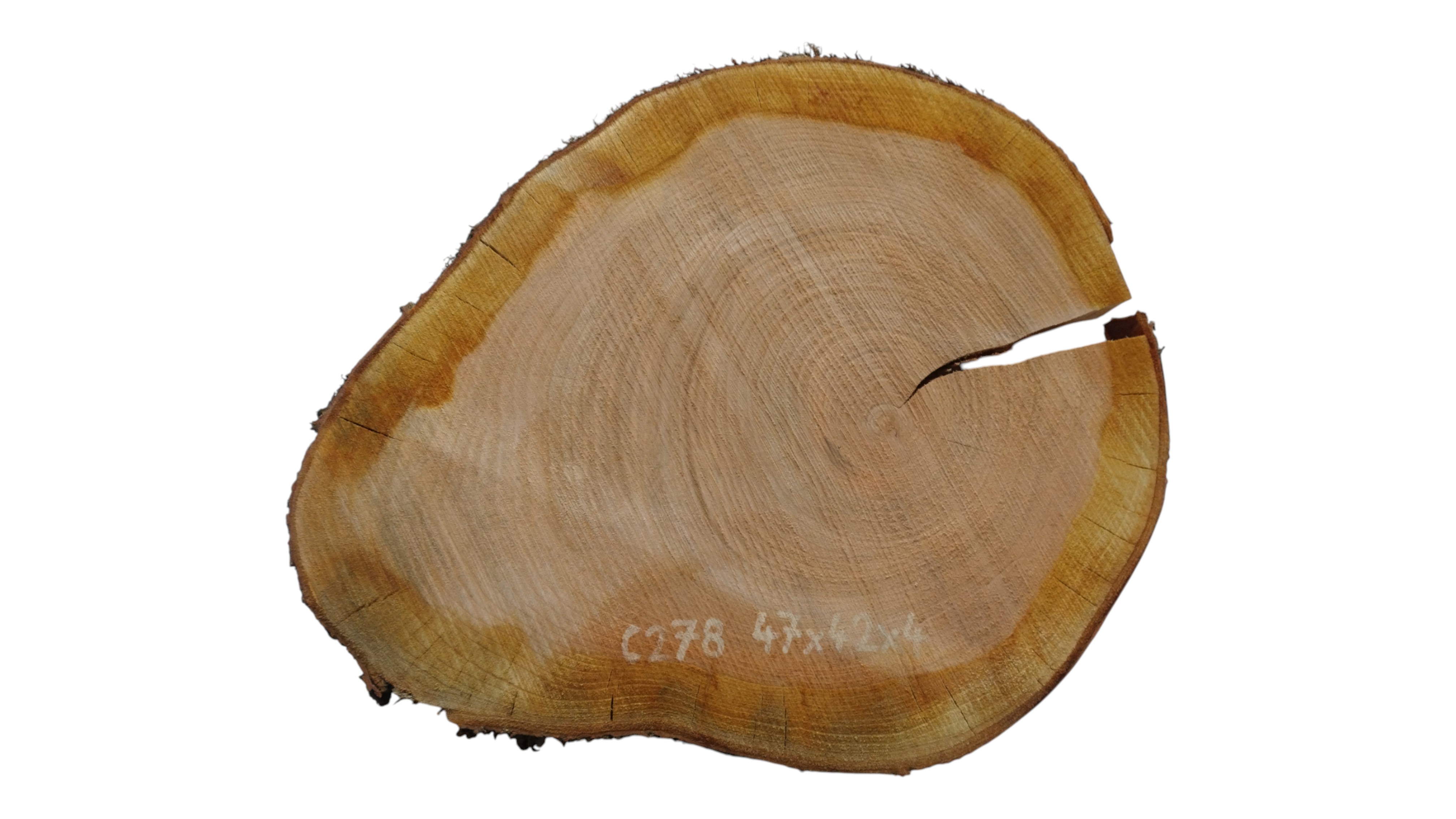 Zdjęcia robimy od razu po przecięciu, żeby jak najlepiej pokazać w jaki sposób można wyprowadzić plaster i podkreślić jego strukturę. W procesie suszenia naturalną rzeczą są pęknięcia materiału powstałe w skutek oddawania wilgoci oraz powierzchowna zmiana barwy. Zdjęcie nr 2 w galerii przedstawia stan plastra z października 2025 – wtedy została zmierzona podana wilgotność.