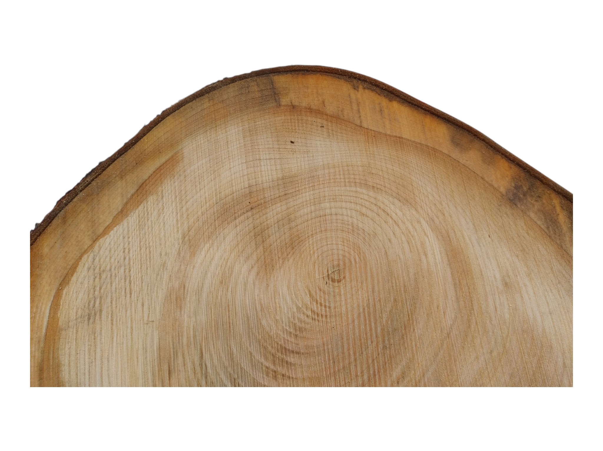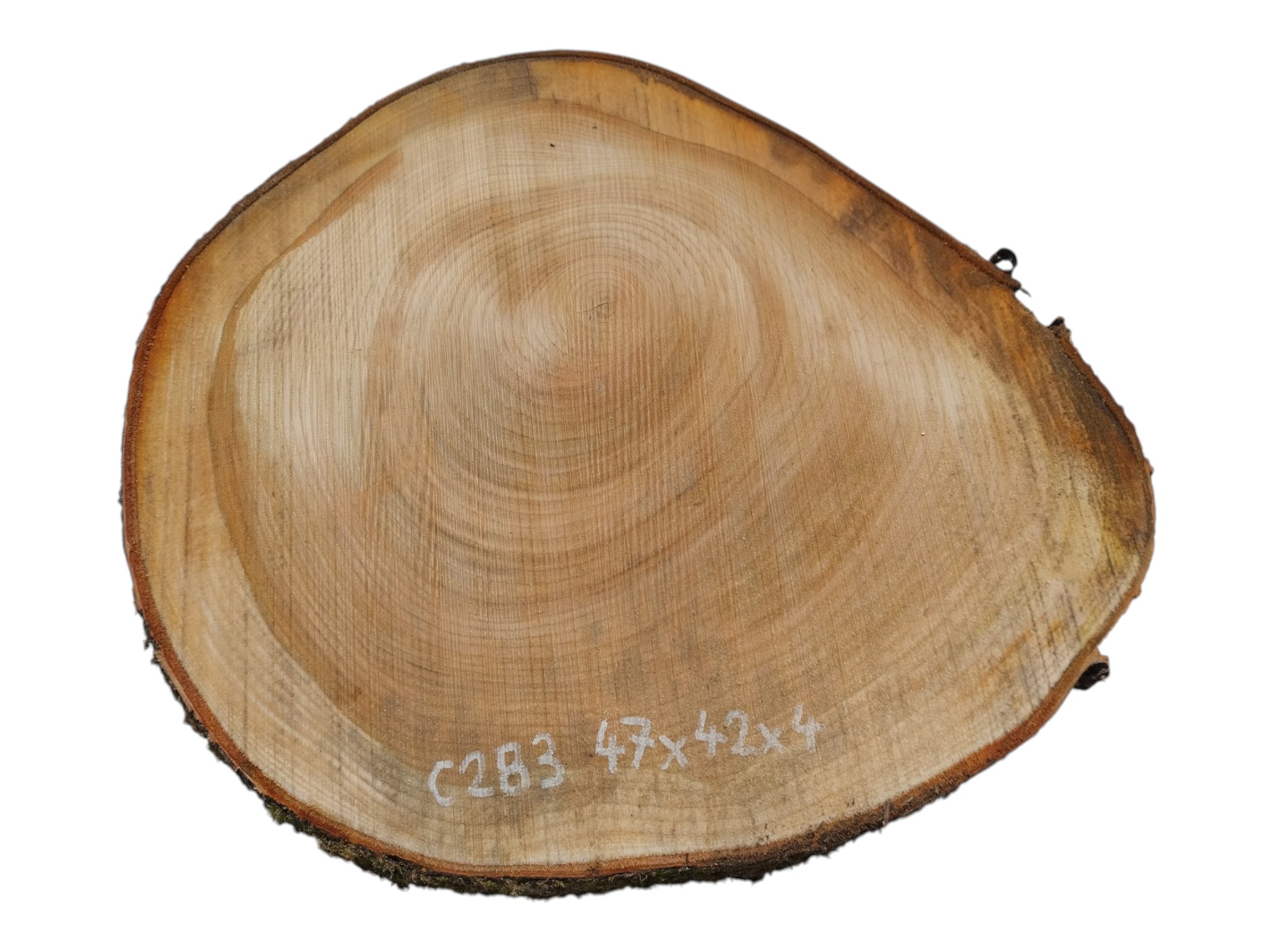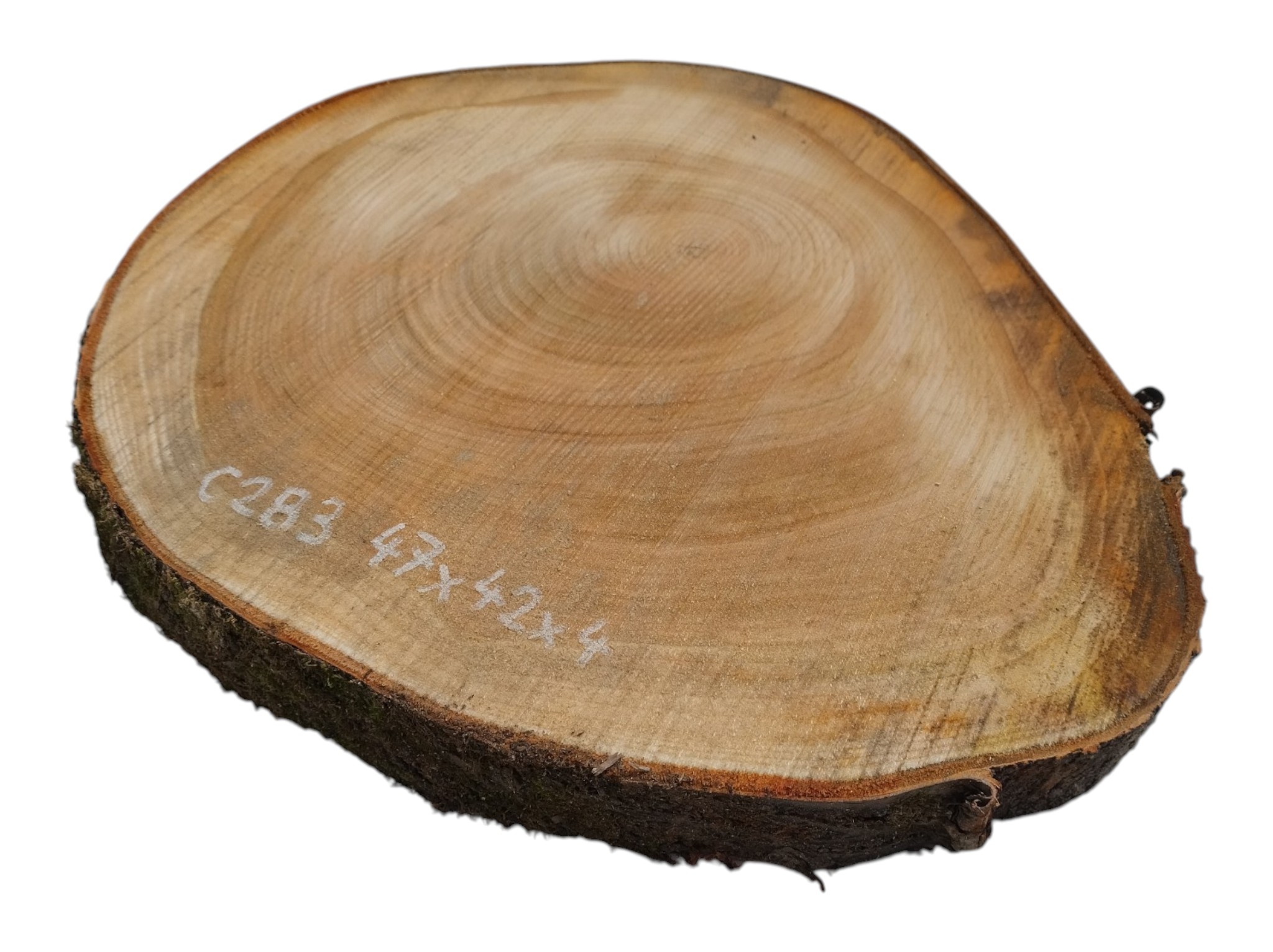 Zdjęcia robimy od razu po przecięciu, żeby jak najlepiej pokazać w jaki sposób można wyprowadzić plaster i podkreślić jego strukturę. W procesie suszenia naturalną rzeczą są pęknięcia materiału powstałe w skutek oddawania wilgoci oraz powierzchowna zmiana barwy. Zdjęcie nr 2 w galerii przedstawia stan plastra z kwietnia 2026 – wtedy została zmierzona podana wilgotność.