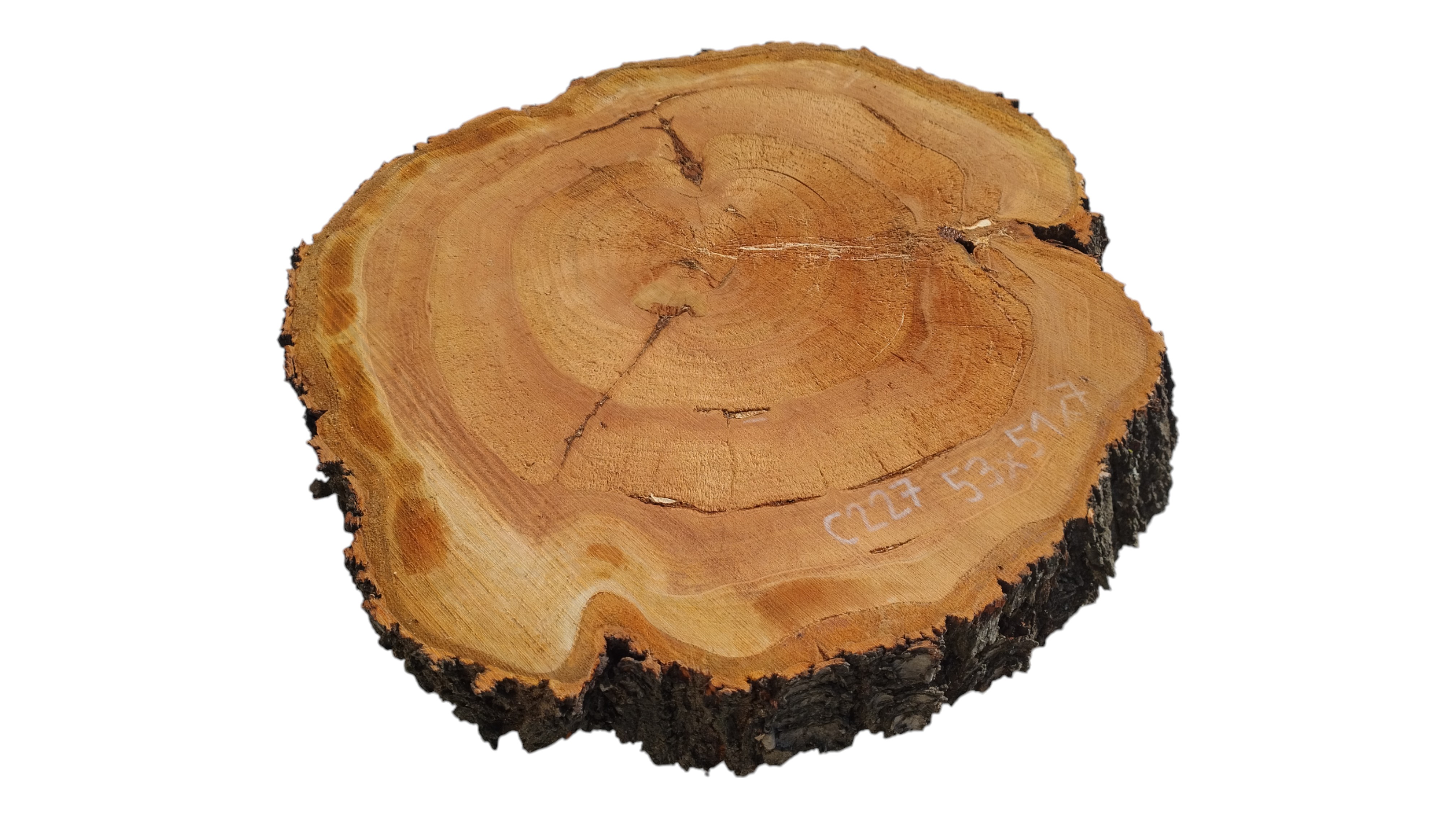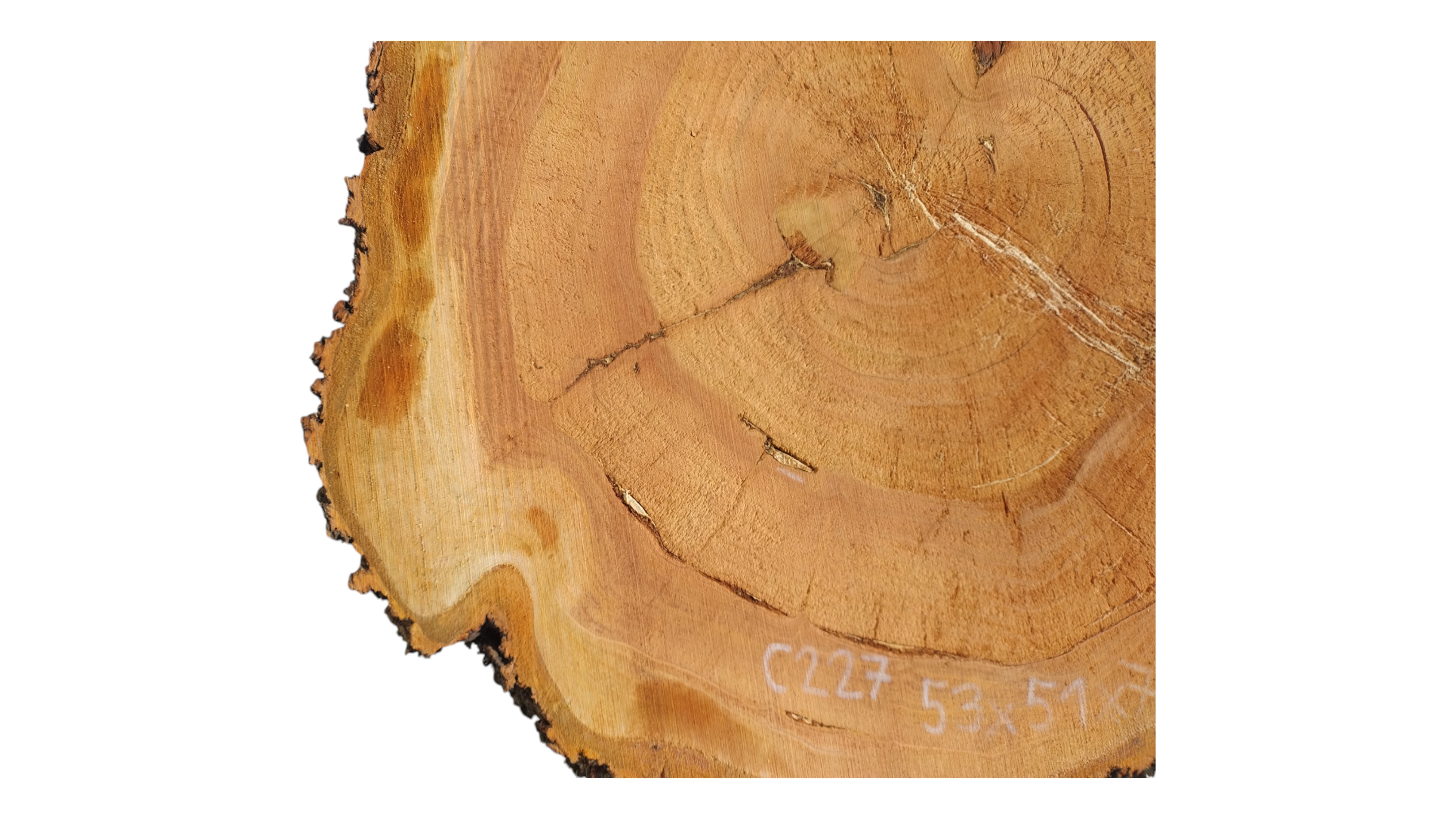 Zdjęcia robimy od razu po przecięciu, żeby jak najlepiej pokazać w jaki sposób można wyprowadzić plaster i podkreślić jego strukturę. W procesie suszenia naturalną rzeczą są pęknięcia materiału powstałe w skutek oddawania wilgoci oraz powierzchowna zmiana barwy. Zdjęcie nr 2 w galerii przedstawia stan plastra z maja 2025 – wtedy została zmierzona podana wilgotność.