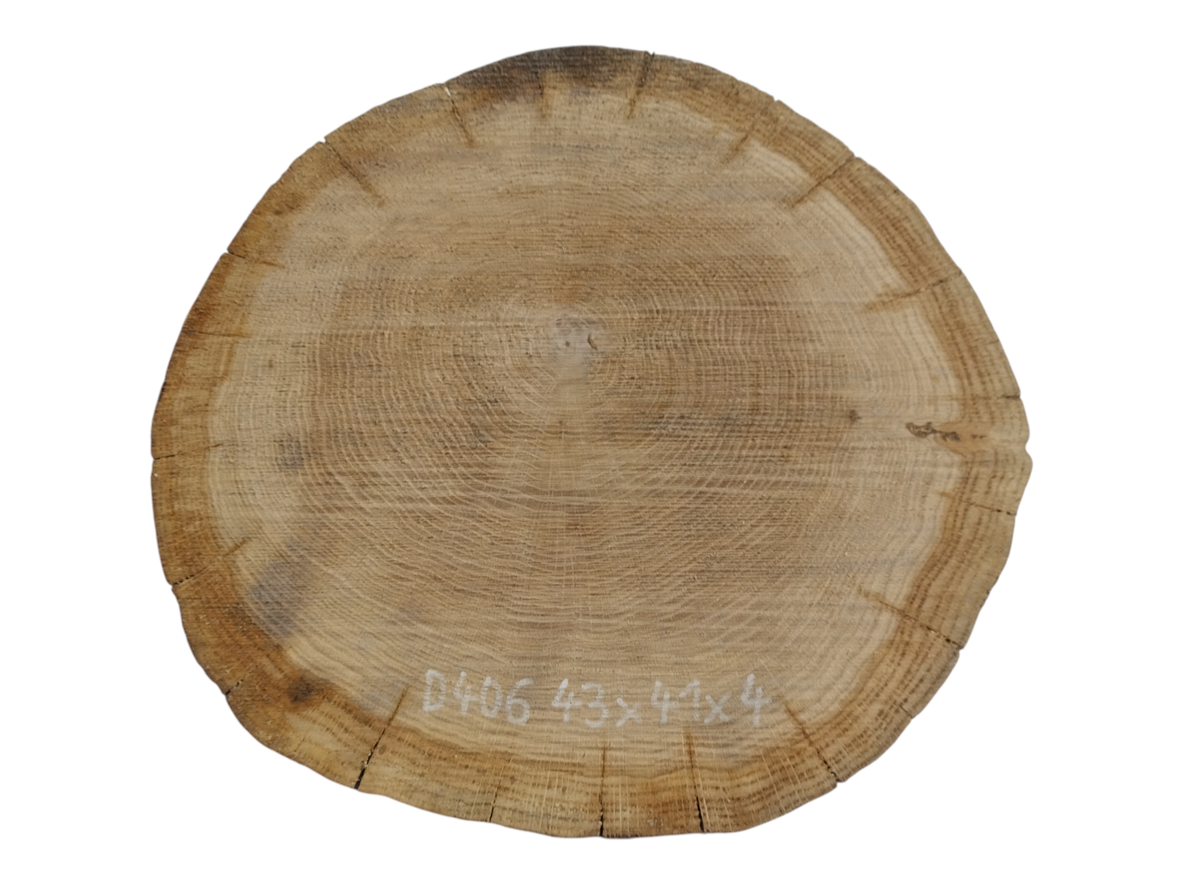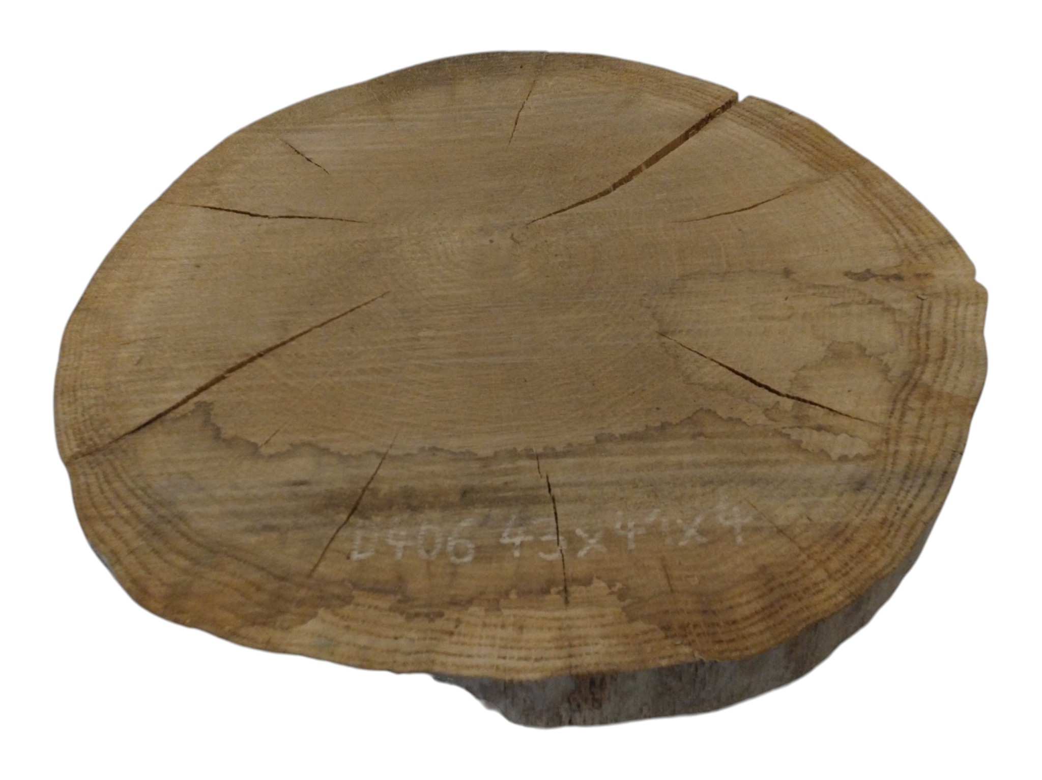 Zdjęcia robimy od razu po przecięciu, żeby jak najlepiej pokazać w jaki sposób można wyprowadzić plaster i podkreślić jego strukturę. W procesie suszenia naturalną rzeczą są pęknięcia materiału powstałe w skutek oddawania wilgoci oraz powierzchowna zmiana barwy. Zdjęcie nr 2 w galerii przedstawia stan plastra z lutego 2026 – wtedy została zmierzona podana wilgotność.