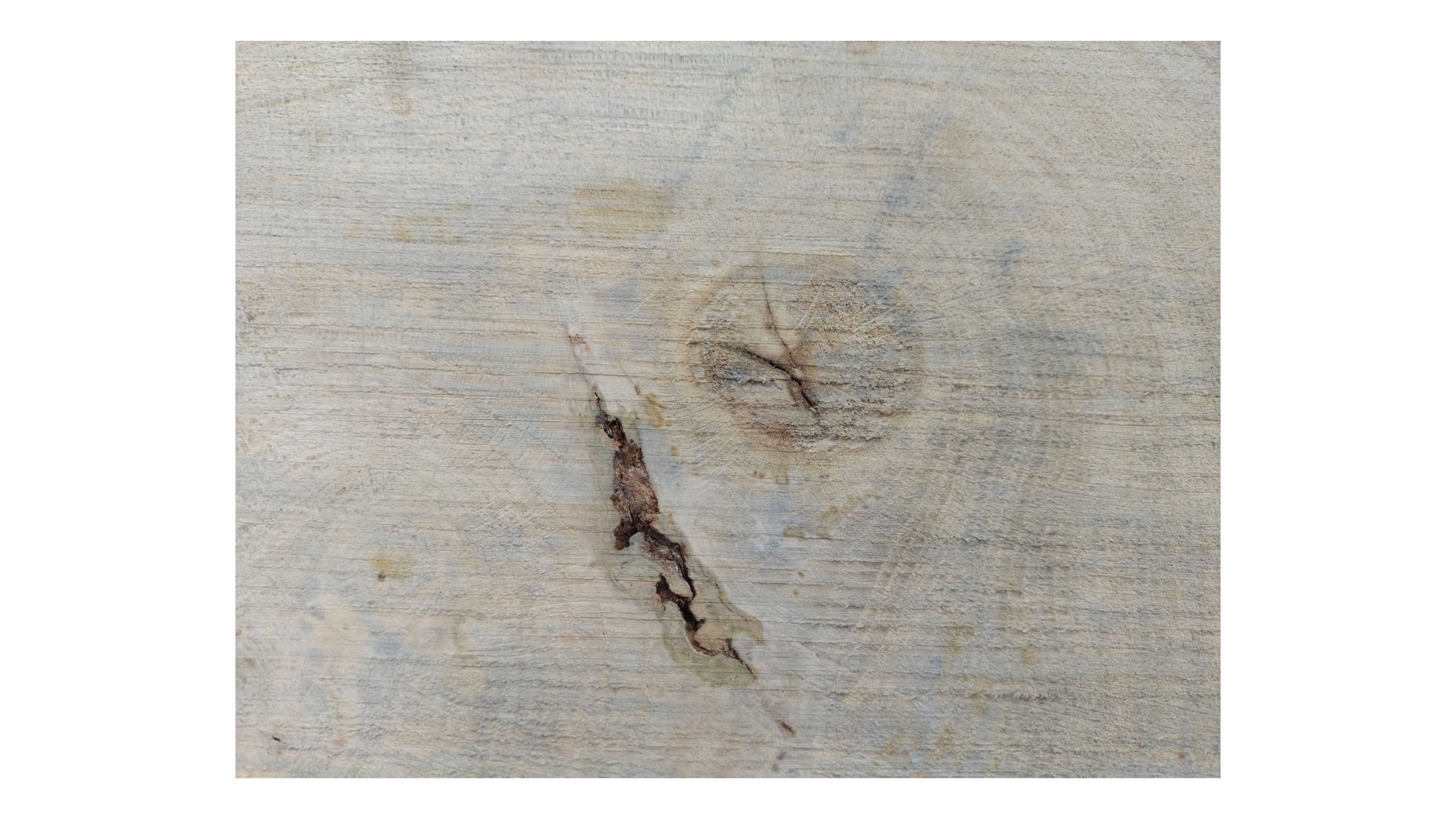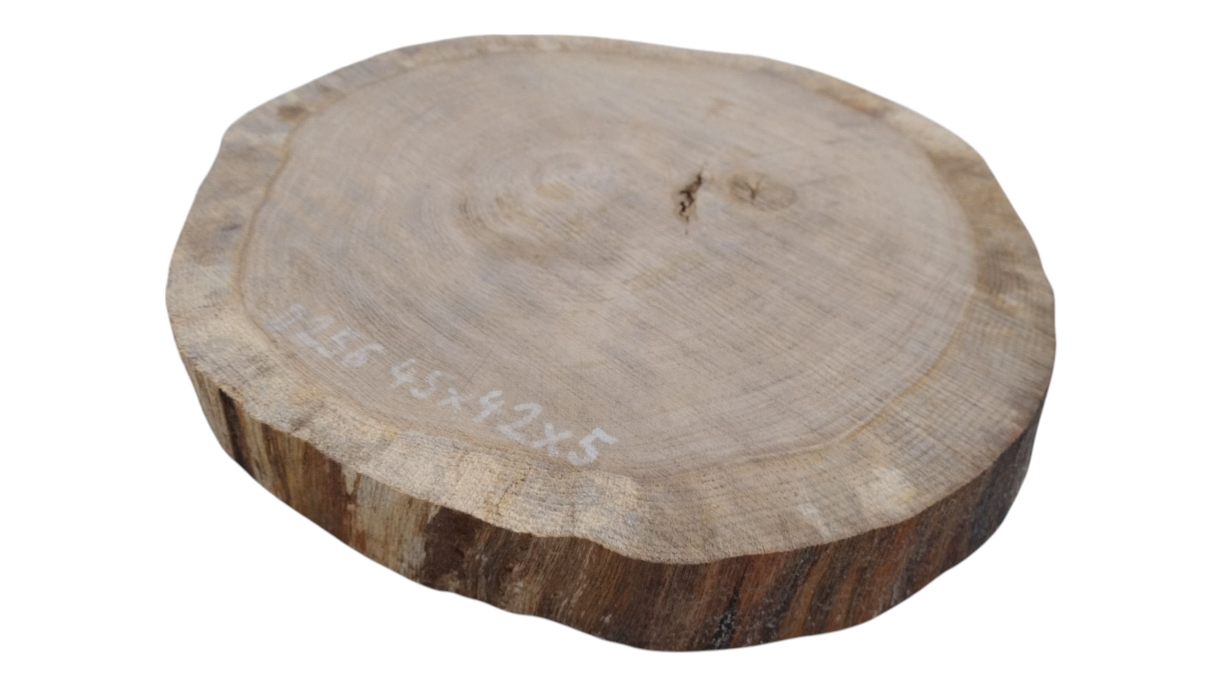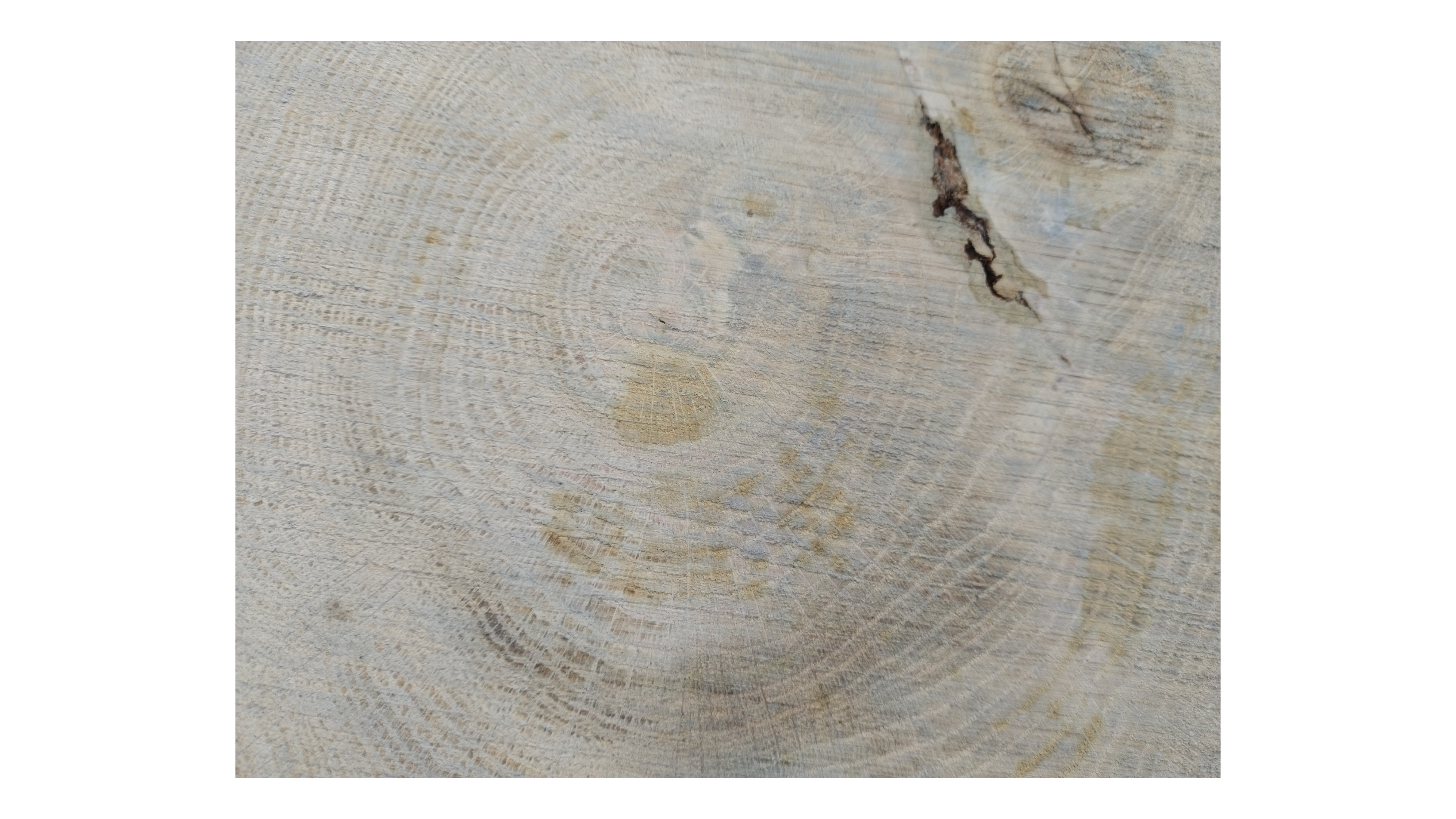 Zdjęcia robimy od razu po przecięciu, żeby jak najlepiej pokazać w jaki sposób można wyprowadzić plaster i podkreślić jego strukturę. W procesie suszenia naturalną rzeczą są pęknięcia materiału powstałe w skutek oddawania wilgoci oraz powierzchowna zmiana barwy. Zdjęcie nr 2 w galerii przedstawia stan plastra z maja 2025 – wtedy została zmierzona podana wilgotność.