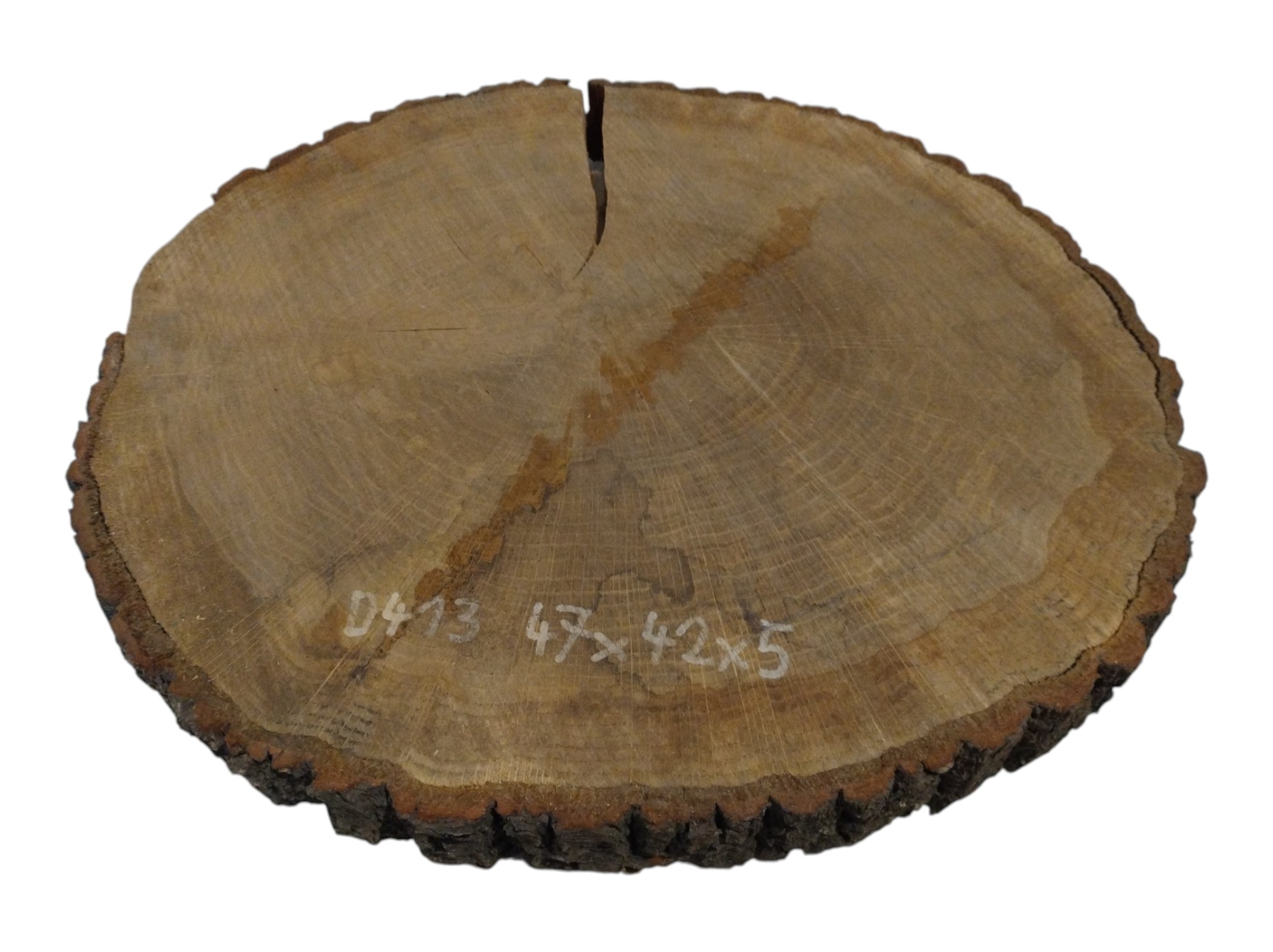Zdjęcia robimy od razu po przecięciu, żeby jak najlepiej pokazać w jaki sposób można wyprowadzić plaster i podkreślić jego strukturę. W procesie suszenia naturalną rzeczą są pęknięcia materiału powstałe w skutek oddawania wilgoci oraz powierzchowna zmiana barwy. Zdjęcie nr 2 w galerii przedstawia stan plastra z lutego 2026 – wtedy została zmierzona podana wilgotność.
