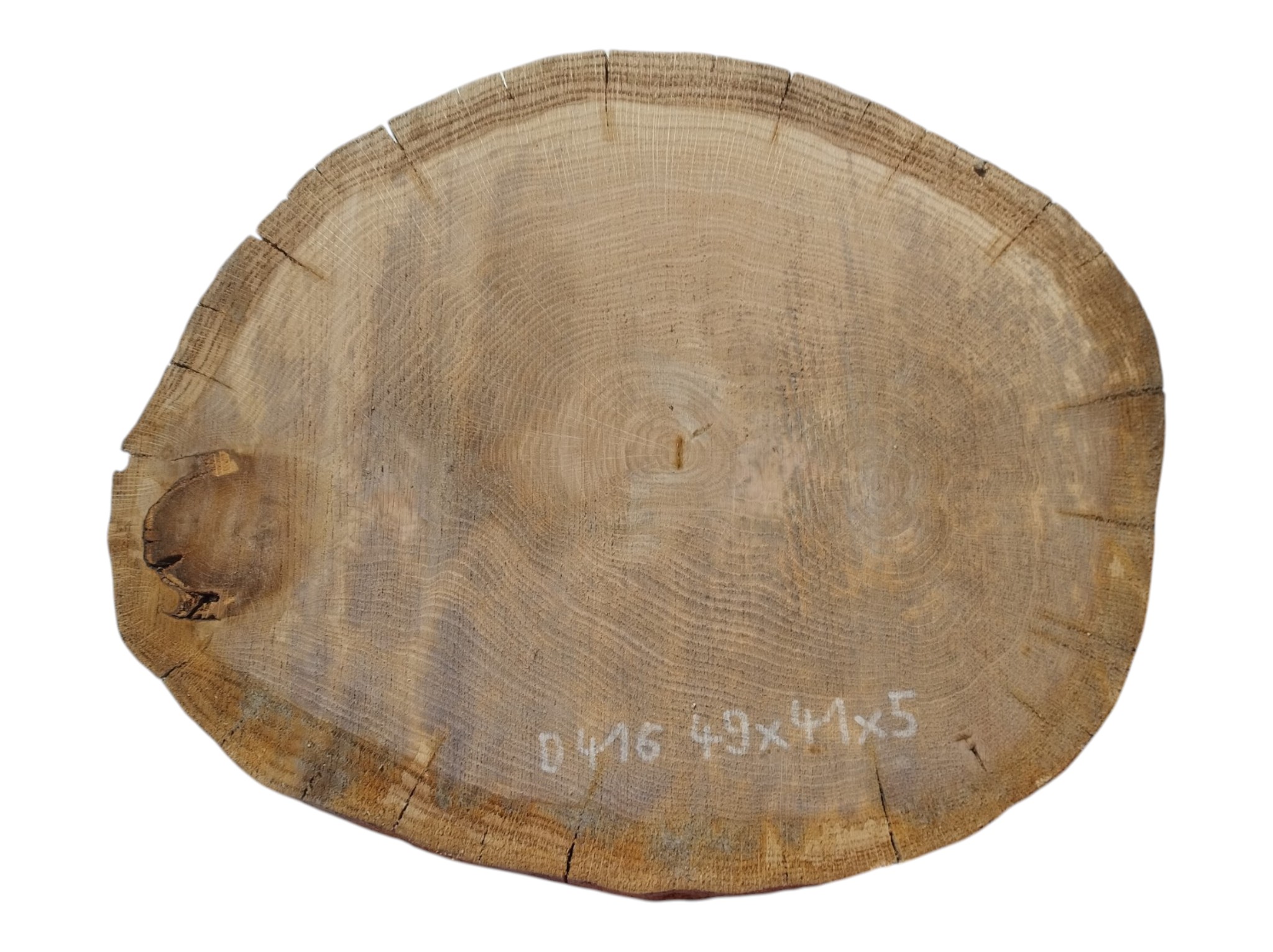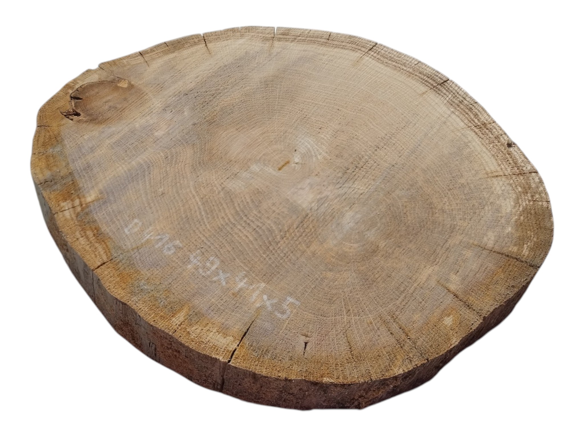 Zdjęcia robimy od razu po przecięciu, żeby jak najlepiej pokazać w jaki sposób można wyprowadzić plaster i podkreślić jego strukturę. W procesie suszenia naturalną rzeczą są pęknięcia materiału powstałe w skutek oddawania wilgoci oraz powierzchowna zmiana barwy. Zdjęcie nr 2 w galerii przedstawia stan plastra z kwietnia 2026 – wtedy została zmierzona podana wilgotność.