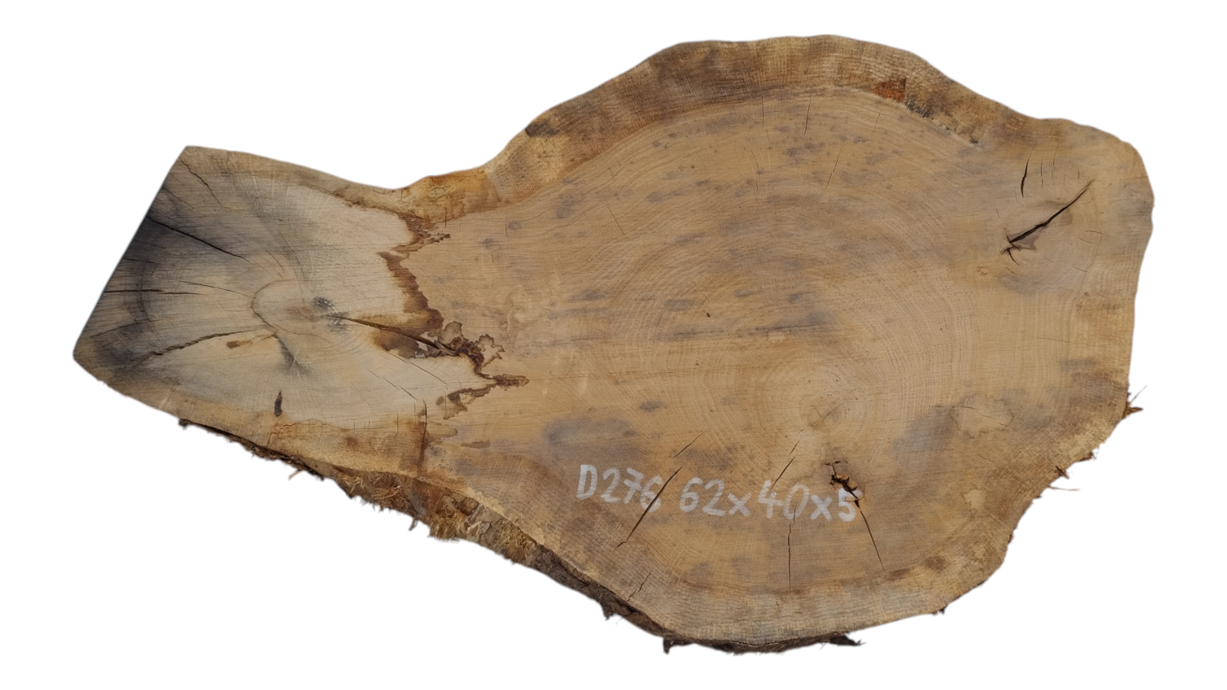 Zdjęcia robimy od razu po przecięciu, żeby jak najlepiej pokazać w jaki sposób można wyprowadzić plaster i podkreślić jego strukturę. W procesie suszenia naturalną rzeczą są pęknięcia materiału powstałe w skutek oddawania wilgoci oraz powierzchowna zmiana barwy. Zdjęcie nr 2 w galerii przedstawia stan plastra z maja 2025 – wtedy została zmierzona podana wilgotność.