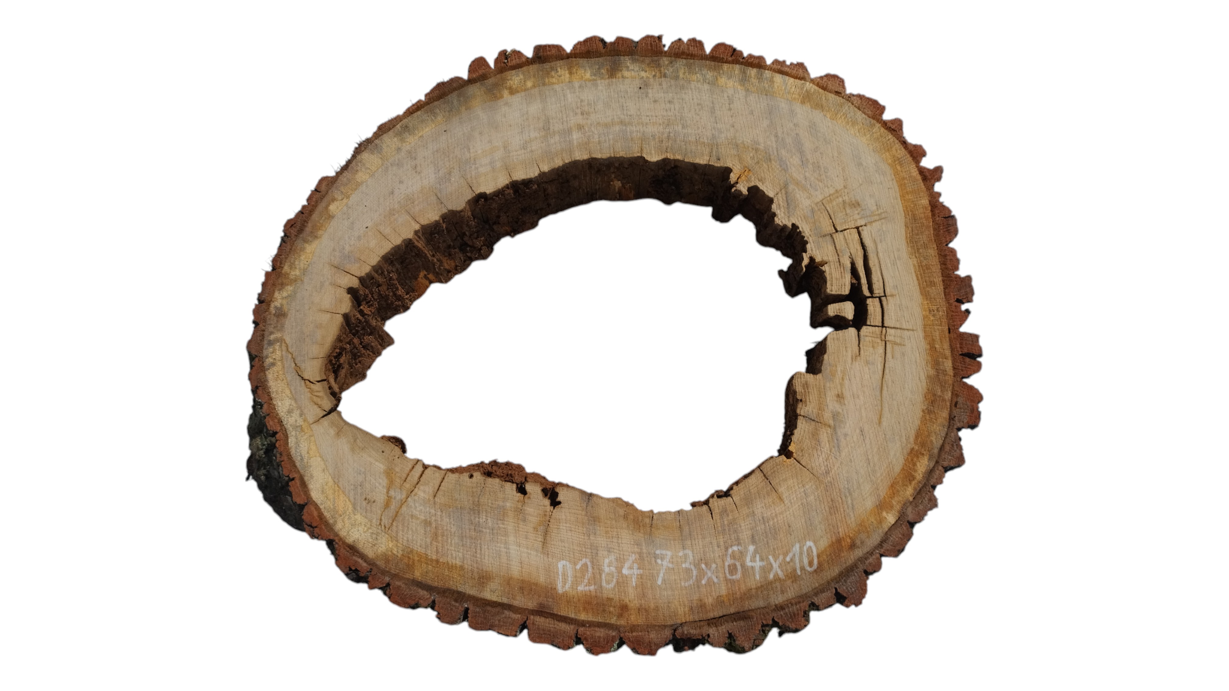 Zdjęcia robimy od razu po przecięciu, żeby jak najlepiej pokazać w jaki sposób można wyprowadzić plaster i podkreślić jego strukturę. W procesie suszenia naturalną rzeczą są pęknięcia materiału powstałe w skutek oddawania wilgoci oraz powierzchowna zmiana barwy. Zdjęcie nr 2 w galerii przedstawia stan plastra z sierpnia 2025 – wtedy została zmierzona podana wilgotność.