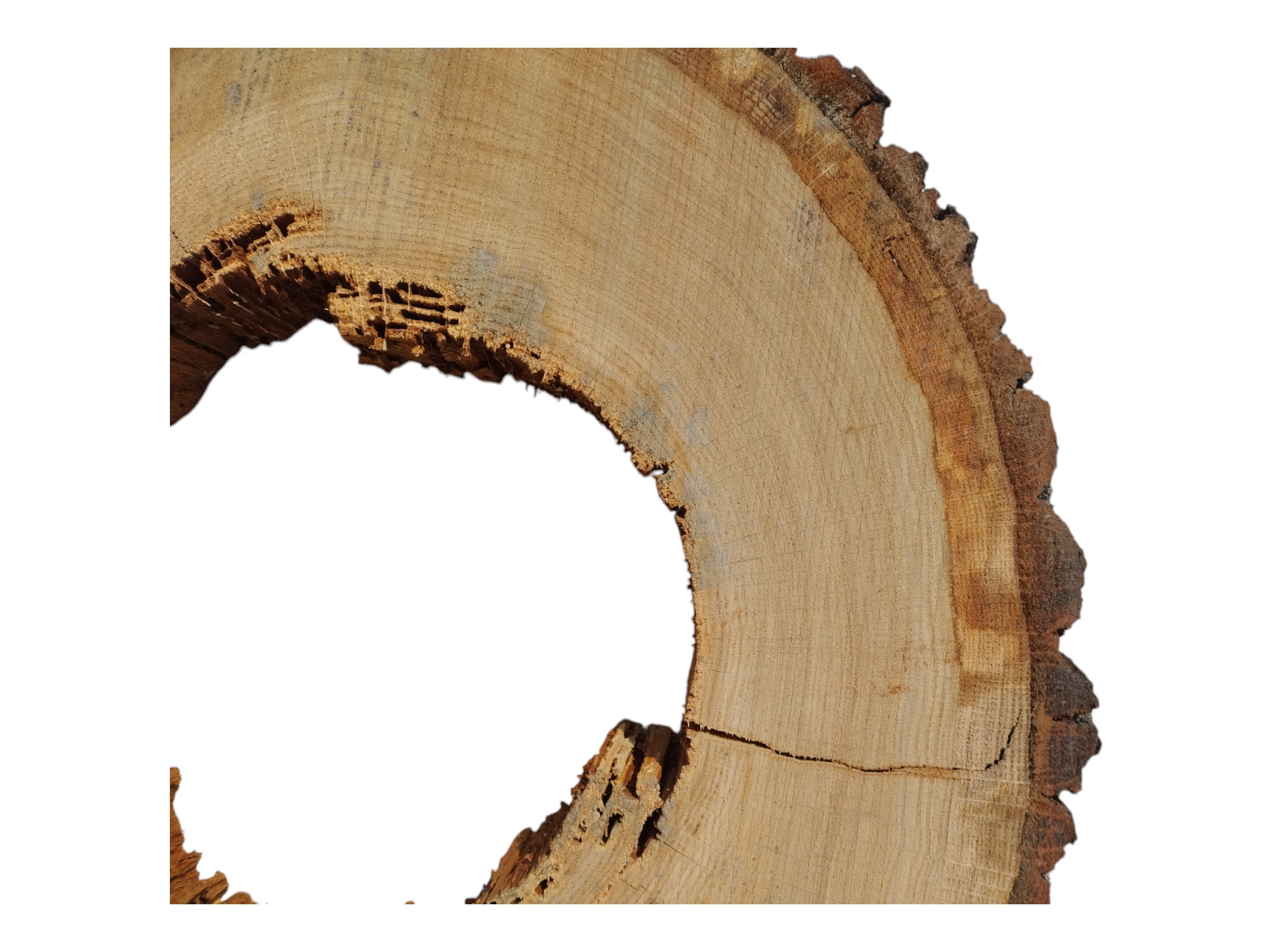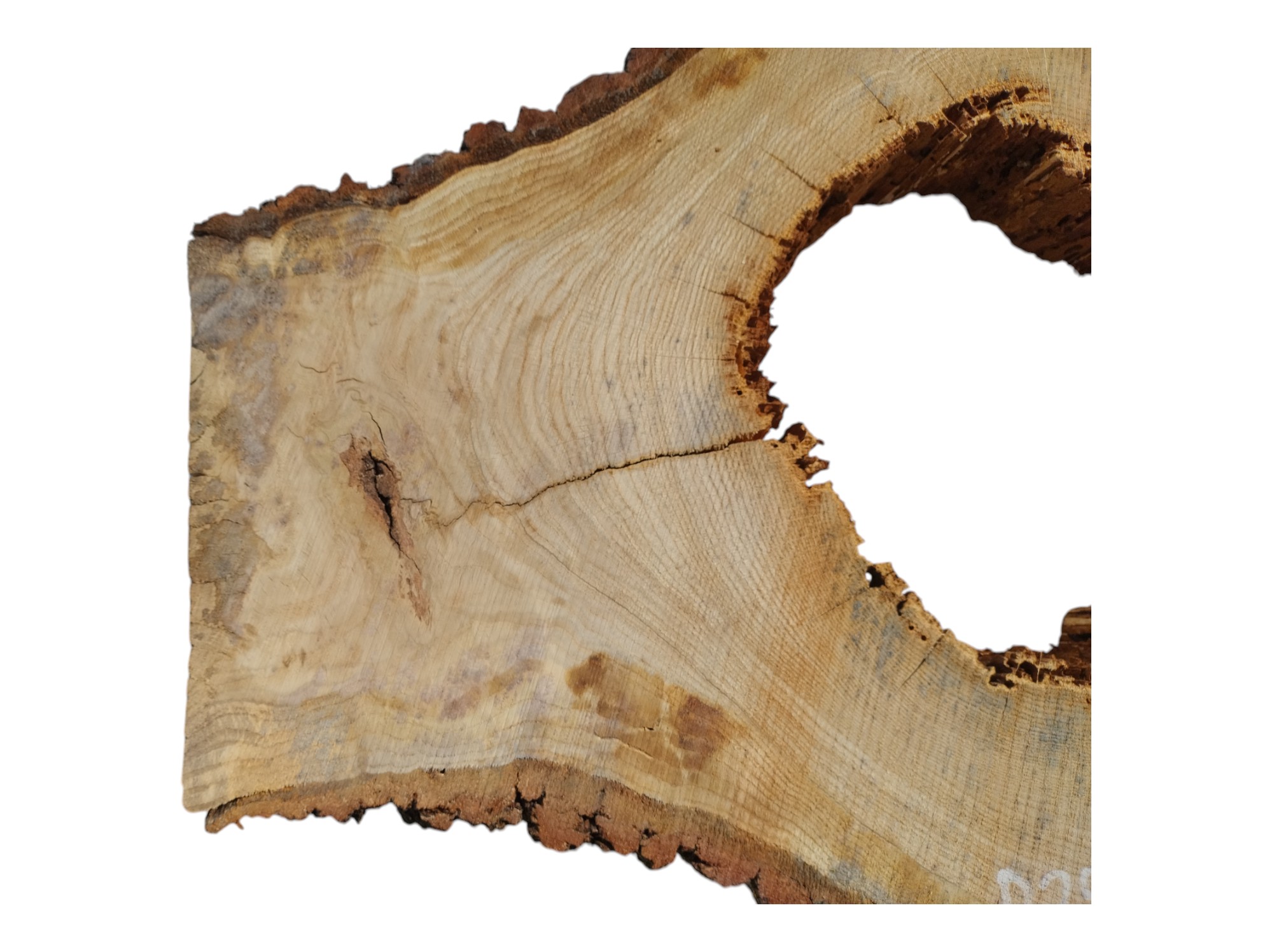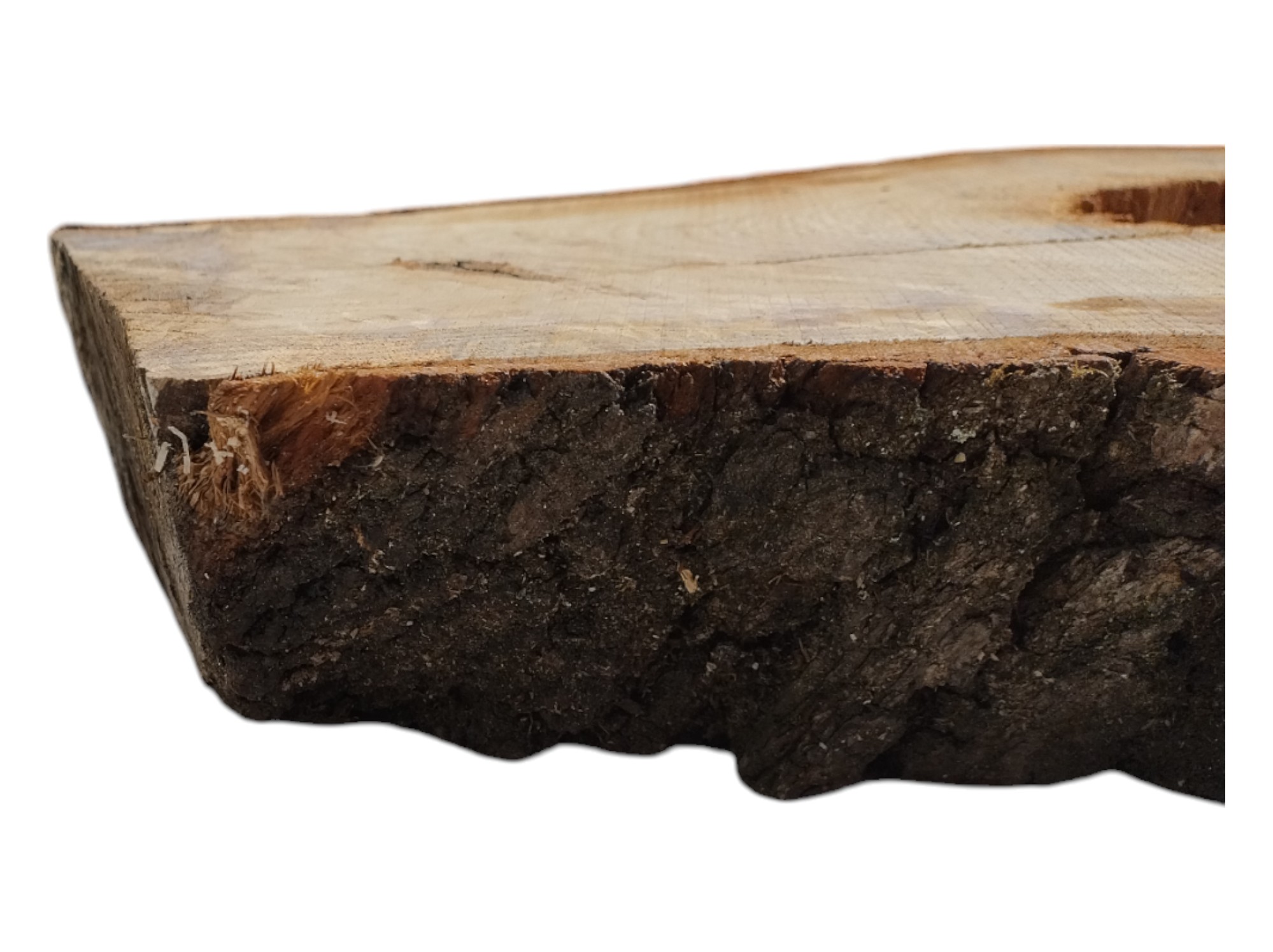 Zdjęcia robimy od razu po przecięciu, żeby jak najlepiej pokazać w jaki sposób można wyprowadzić plaster i podkreślić jego strukturę. W procesie suszenia naturalną rzeczą są pęknięcia materiału powstałe w skutek oddawania wilgoci oraz powierzchowna zmiana barwy. Zdjęcie nr 2 w galerii prezentuje aktualny stan plastra - po wyjęciu z suszarni.