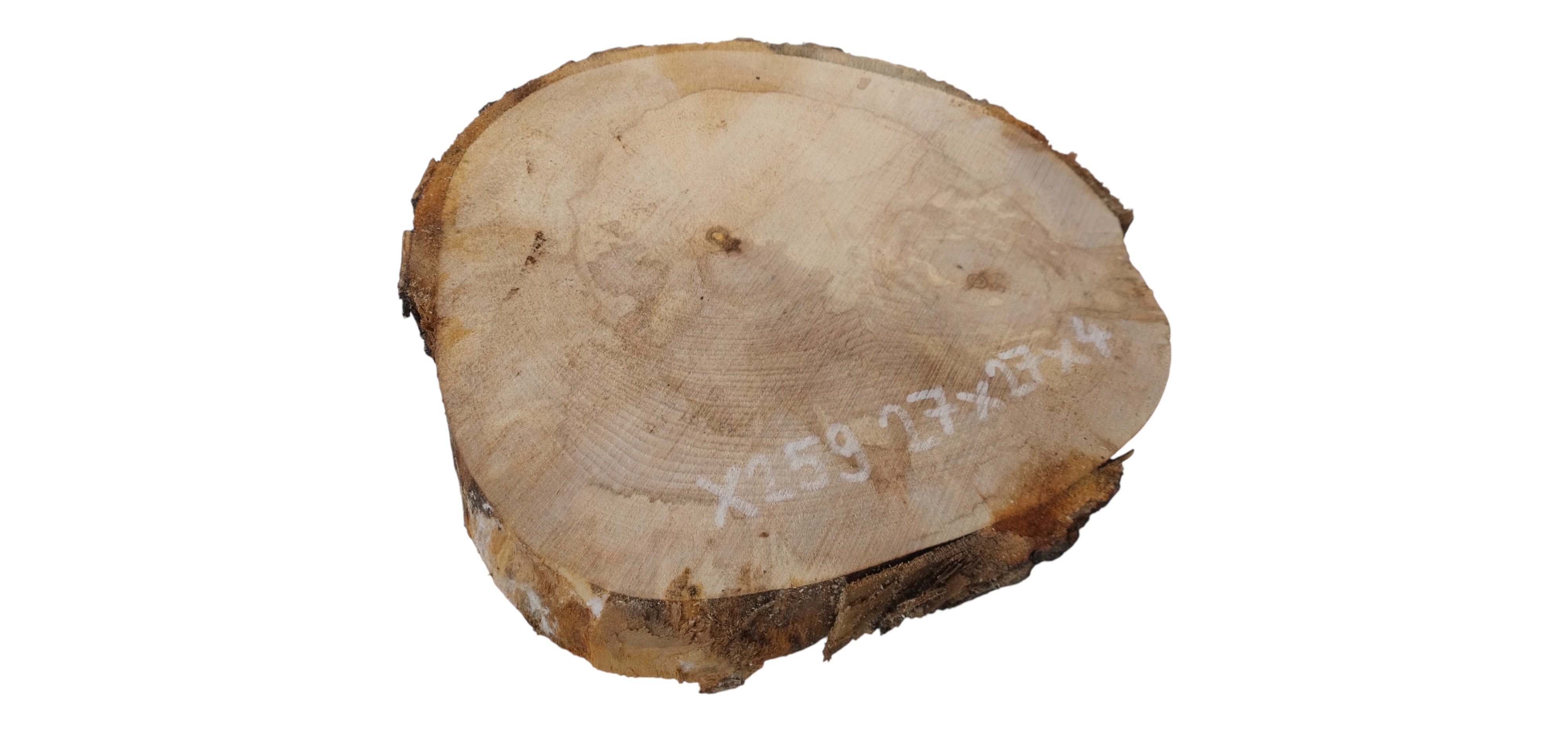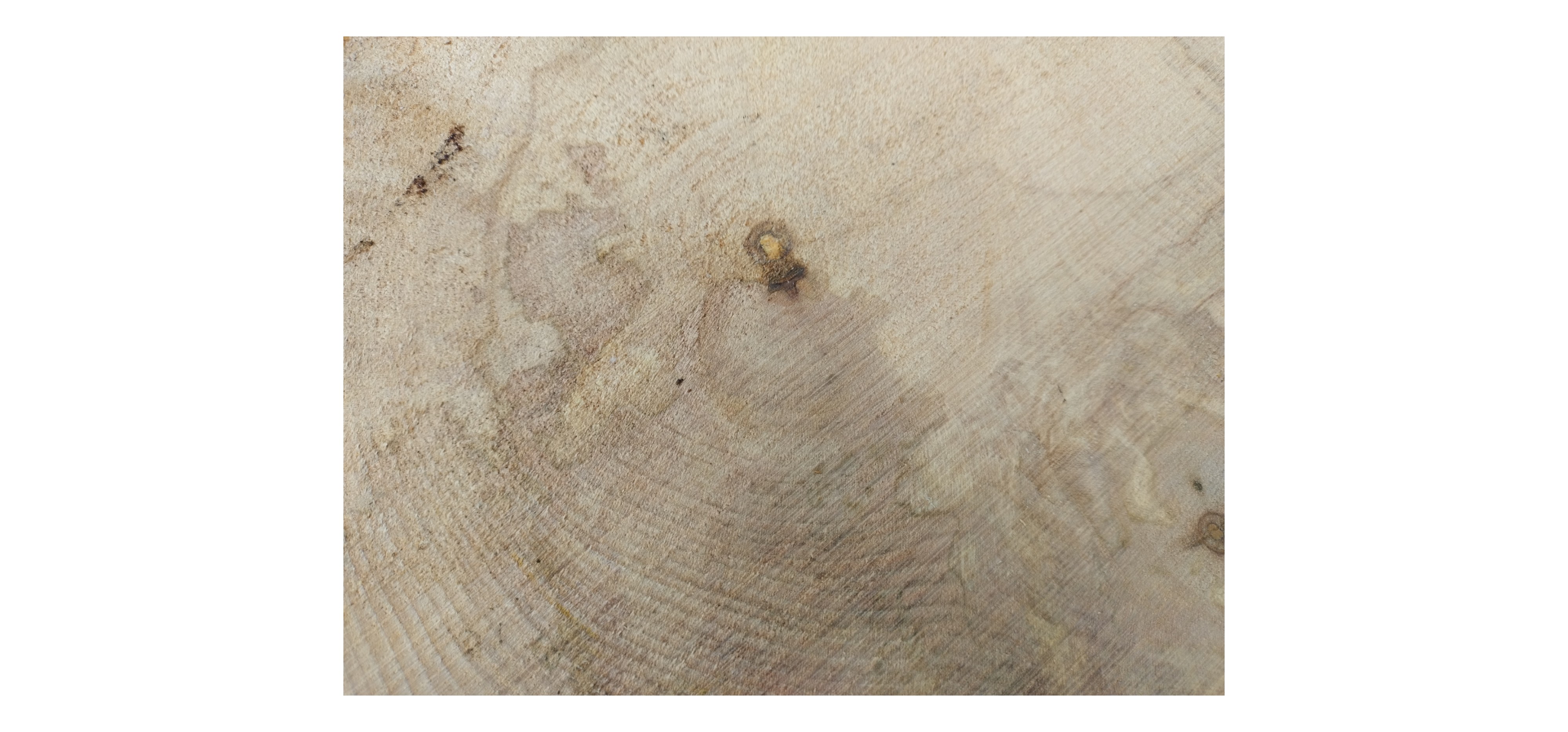 Zdjęcia robimy od razu po przecięciu, żeby jak najlepiej pokazać w jaki sposób można wyprowadzić plaster i podkreślić jego strukturę. W procesie suszenia naturalną rzeczą są pęknięcia materiału powstałe w skutek oddawania wilgoci oraz powierzchowna zmiana barwy. Zdjęcie nr 2 w galerii przedstawia stan plastra z grudnia 2025 – wtedy została zmierzona podana wilgotność.