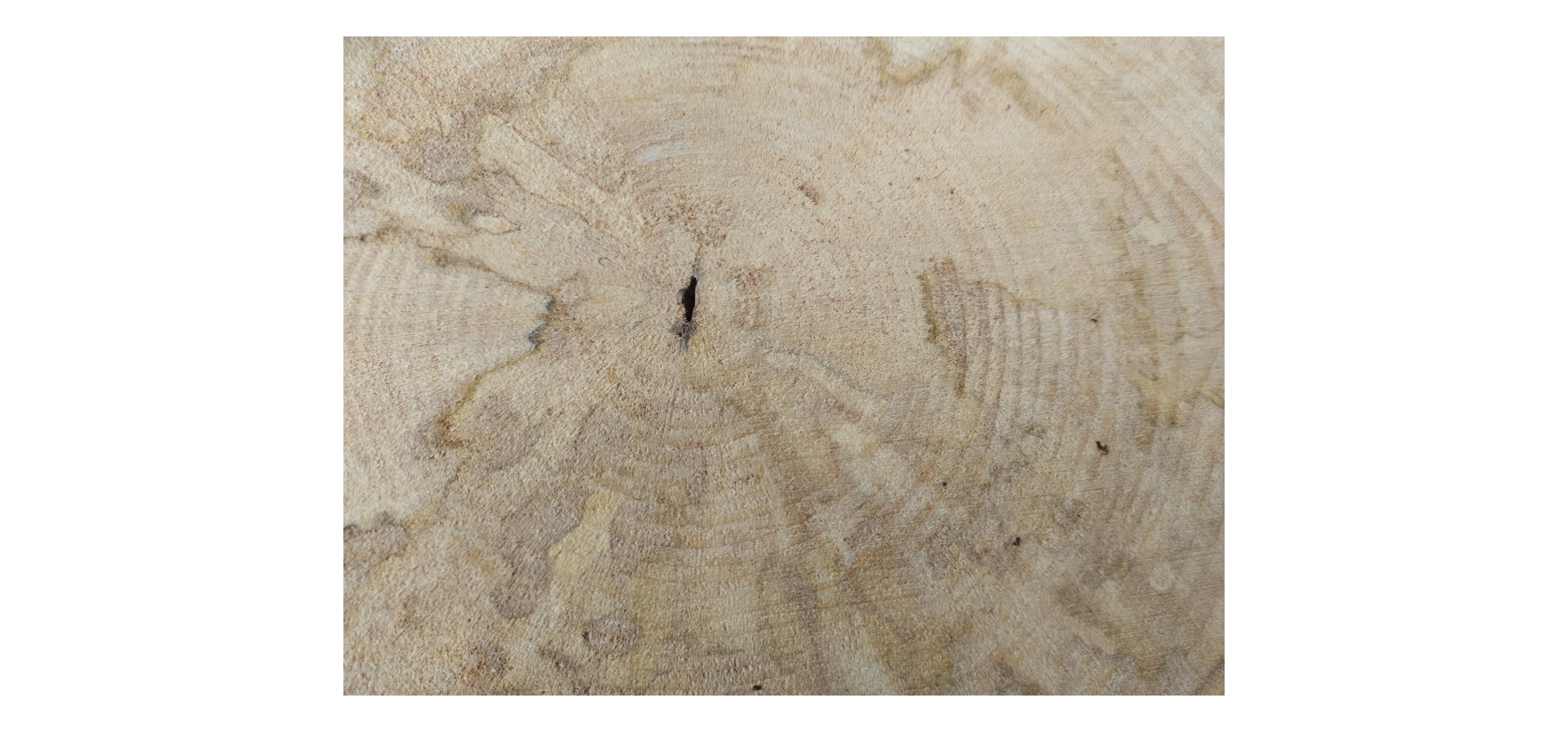 Zdjęcia robimy od razu po przecięciu, żeby jak najlepiej pokazać w jaki sposób można wyprowadzić plaster i podkreślić jego strukturę. W procesie suszenia naturalną rzeczą są pęknięcia materiału powstałe w skutek oddawania wilgoci oraz powierzchowna zmiana barwy. Zdjęcie nr 2 w galerii przedstawia stan plastra z grudnia 2025 – wtedy została zmierzona podana wilgotność.