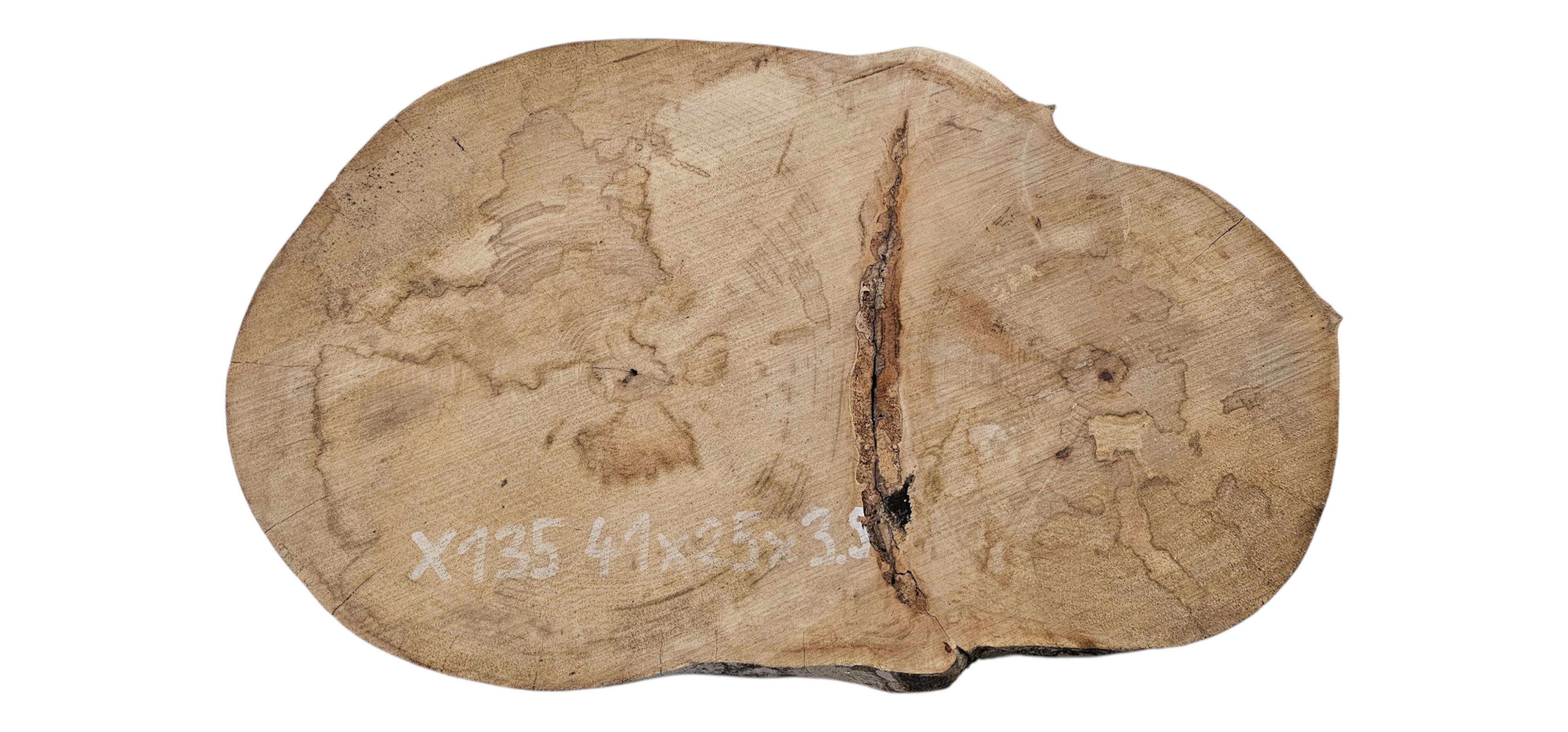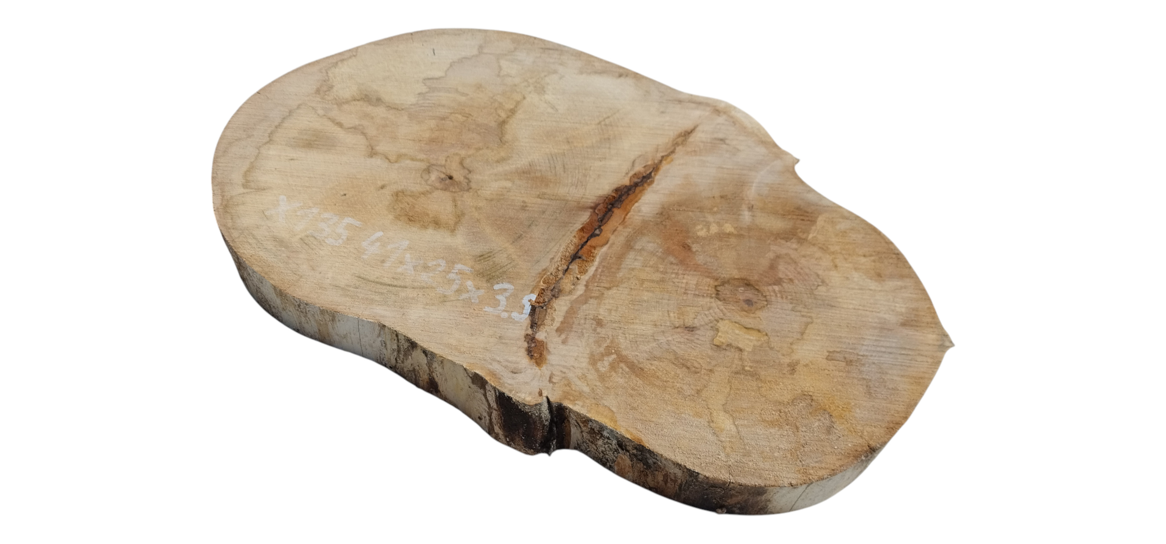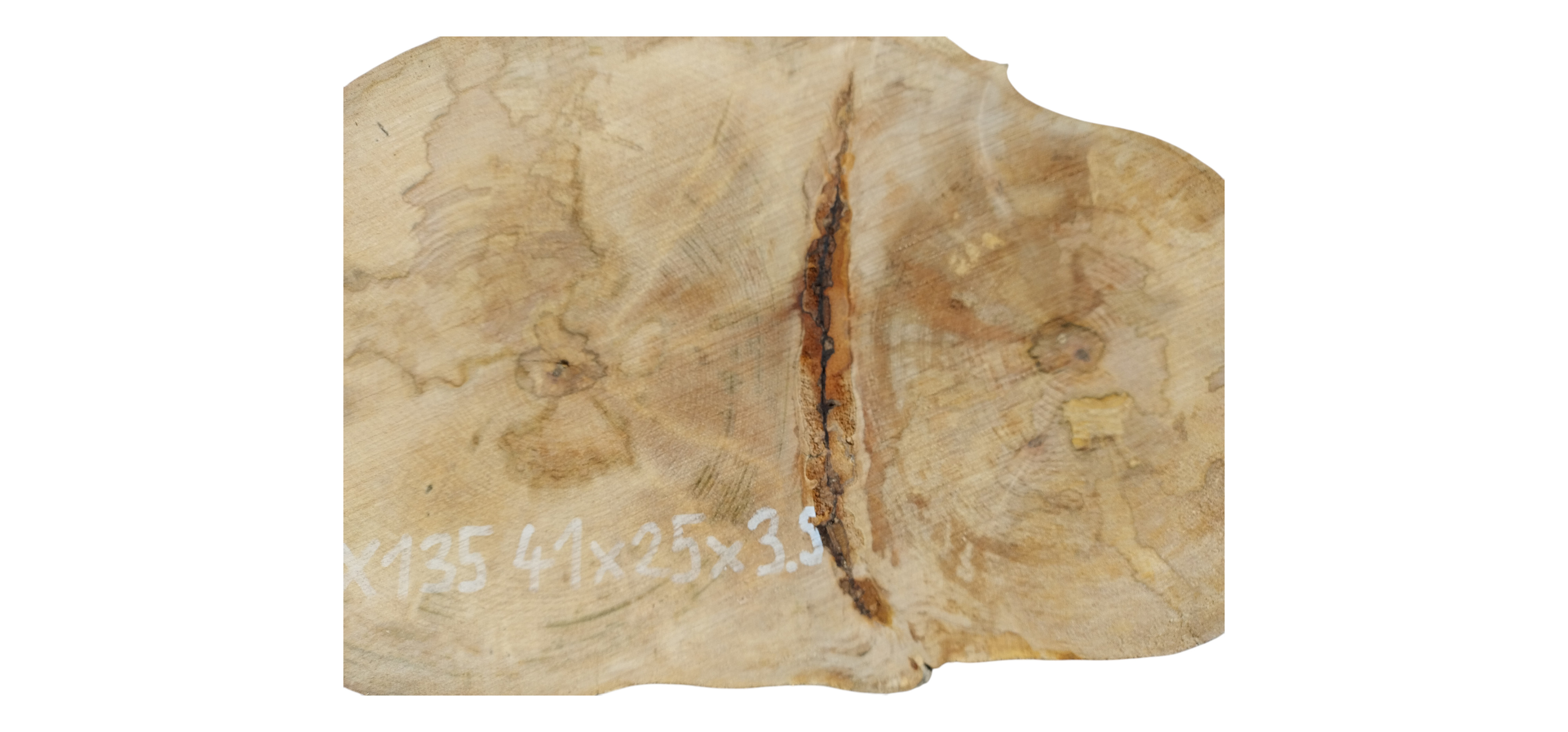 Zdjęcia robimy od razu po przecięciu, żeby jak najlepiej pokazać w jaki sposób można wyprowadzić plaster i podkreślić jego strukturę. W procesie suszenia naturalną rzeczą są pęknięcia materiału powstałe w skutek oddawania wilgoci oraz powierzchowna zmiana barwy. Zdjęcie nr 2 w galerii przedstawia stan plastra z grudnia 2025 – wtedy została zmierzona podana wilgotność.