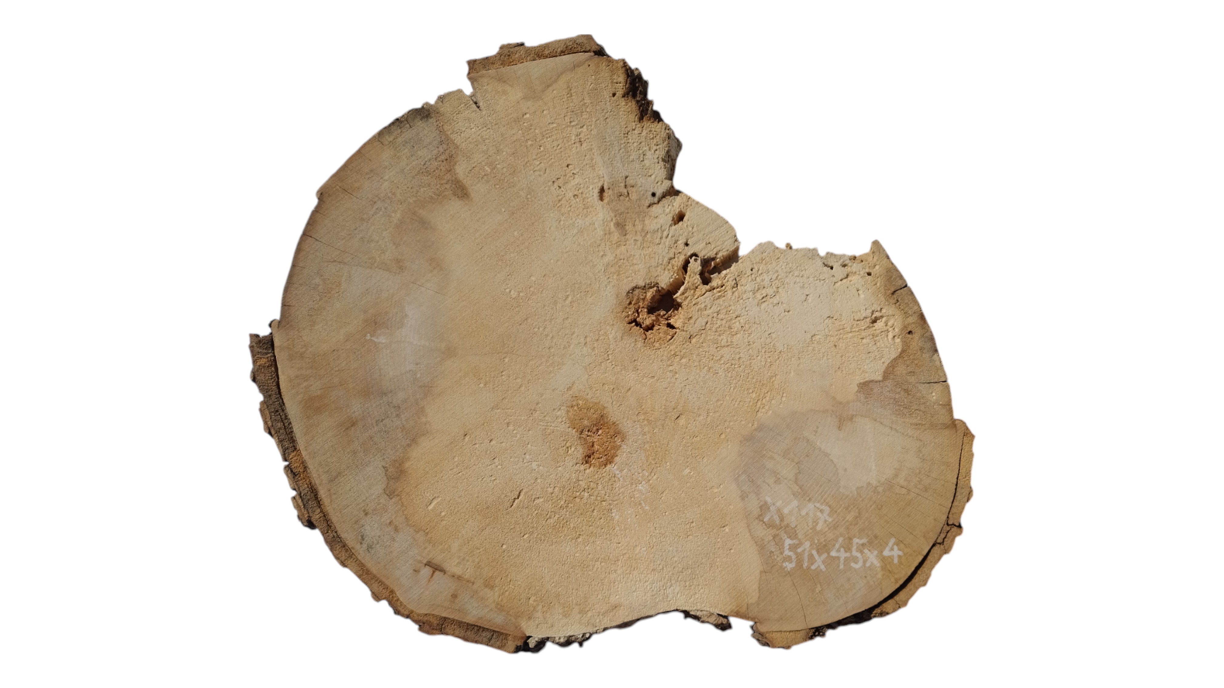 Zdjęcia robimy od razu po przecięciu, żeby jak najlepiej pokazać w jaki sposób można wyprowadzić plaster i podkreślić jego strukturę. W procesie suszenia naturalną rzeczą są pęknięcia materiału powstałe w skutek oddawania wilgoci oraz powierzchowna zmiana barwy. Zdjęcie nr 2 w galerii przedstawia stan plastra z kwietnia 2025 – wtedy została zmierzona podana wilgotność.
