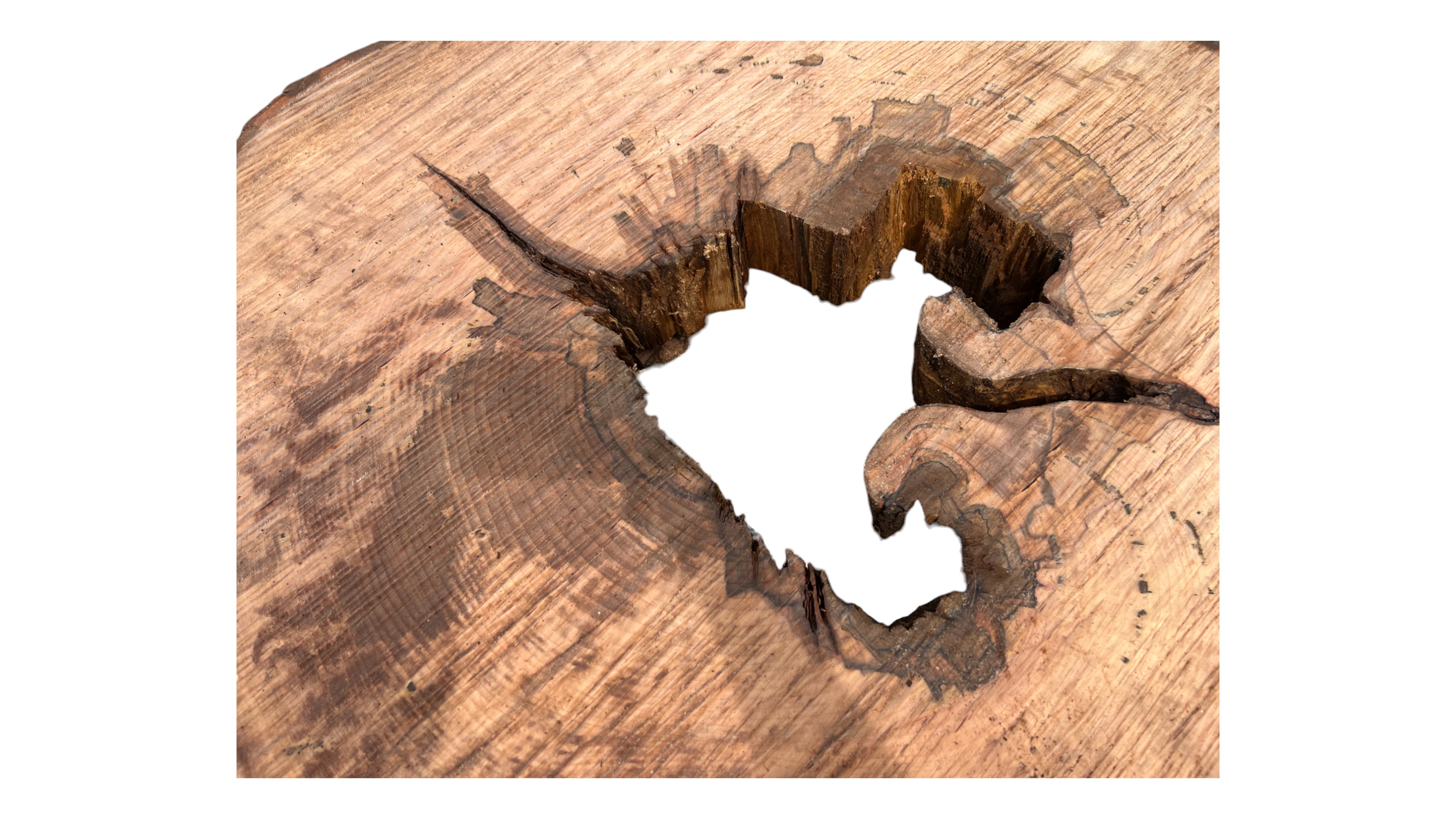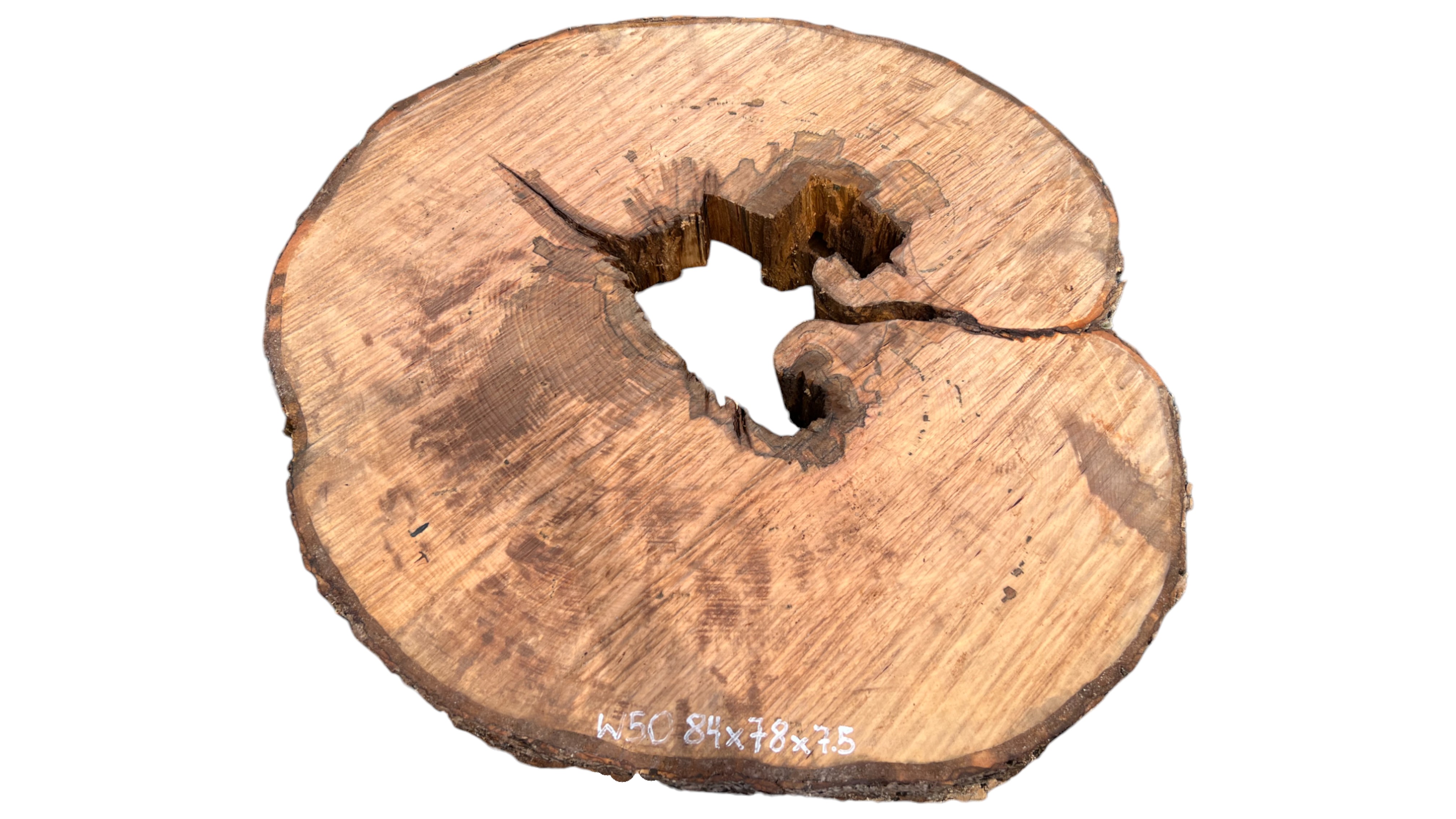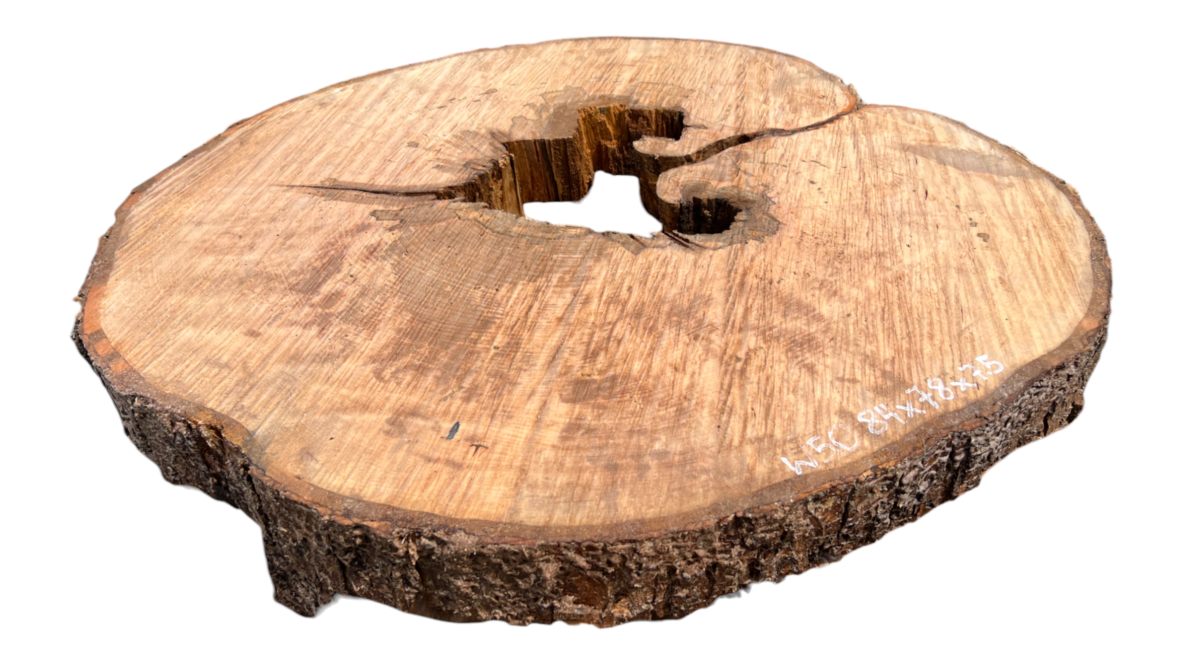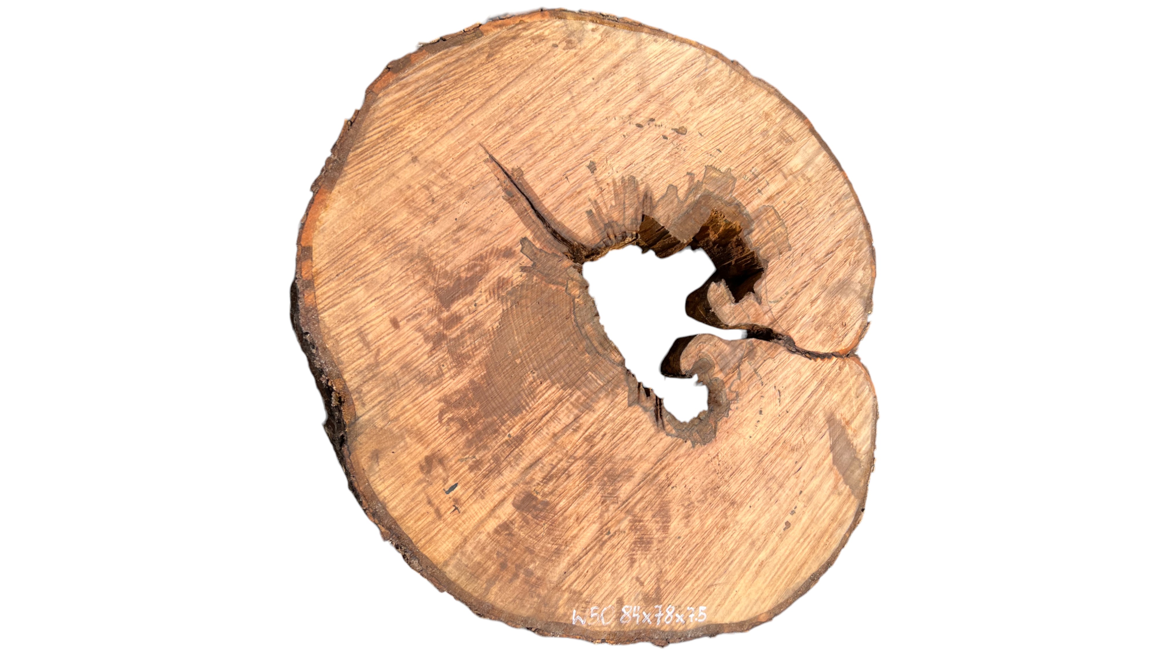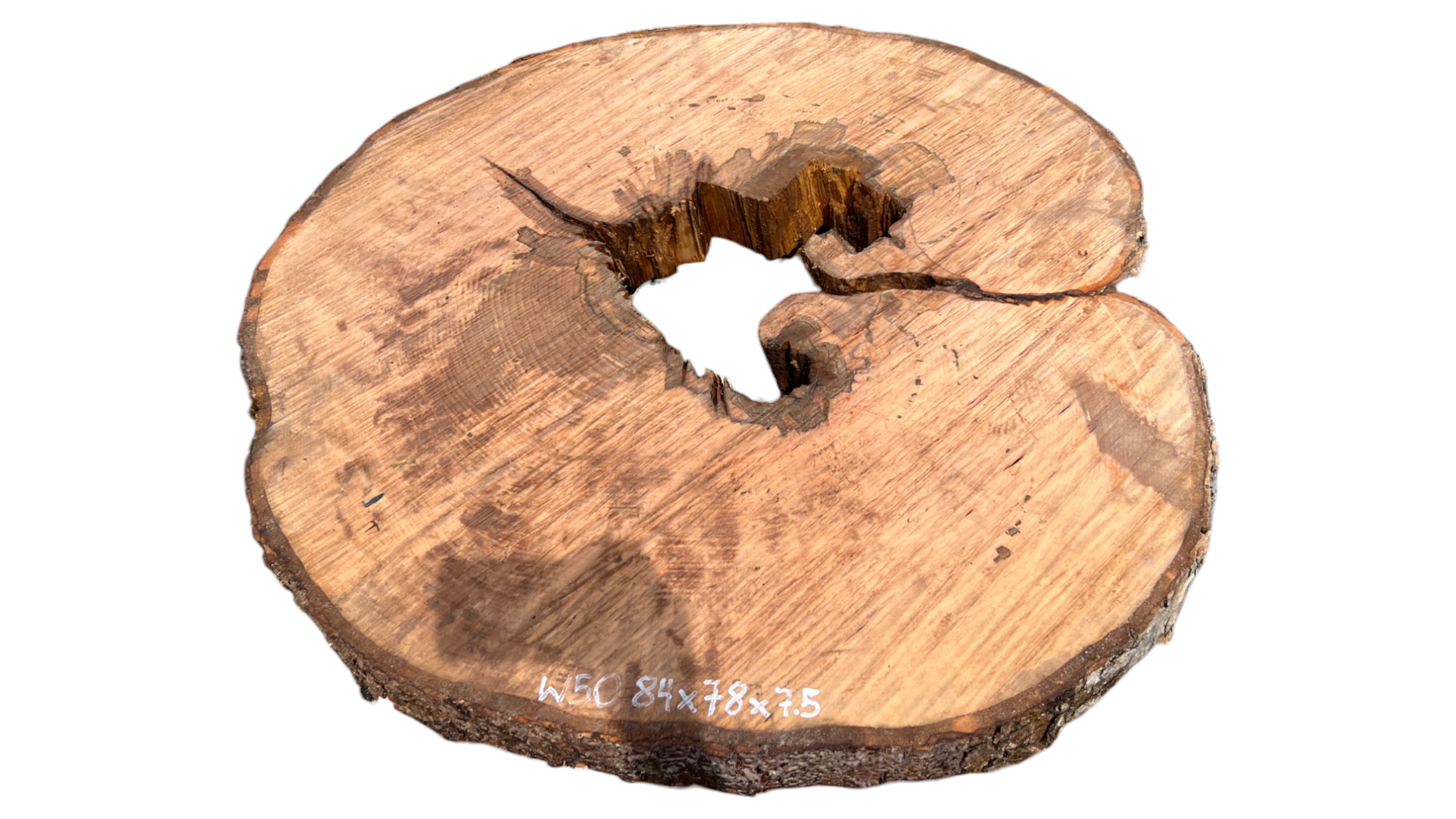 Zdjęcia robimy od razu po przecięciu, żeby jak najlepiej pokazać w jaki sposób można wyprowadzić plaster i podkreślić jego strukturę. W procesie suszenia naturalną rzeczą są pęknięcia materiału powstałe w skutek oddawania wilgoci oraz powierzchowna zmiana barwy. Zdjęcie nr 2 w galerii przedstawia stan plastra z kwietnia 2025 – wtedy została zmierzona podana wilgotność.