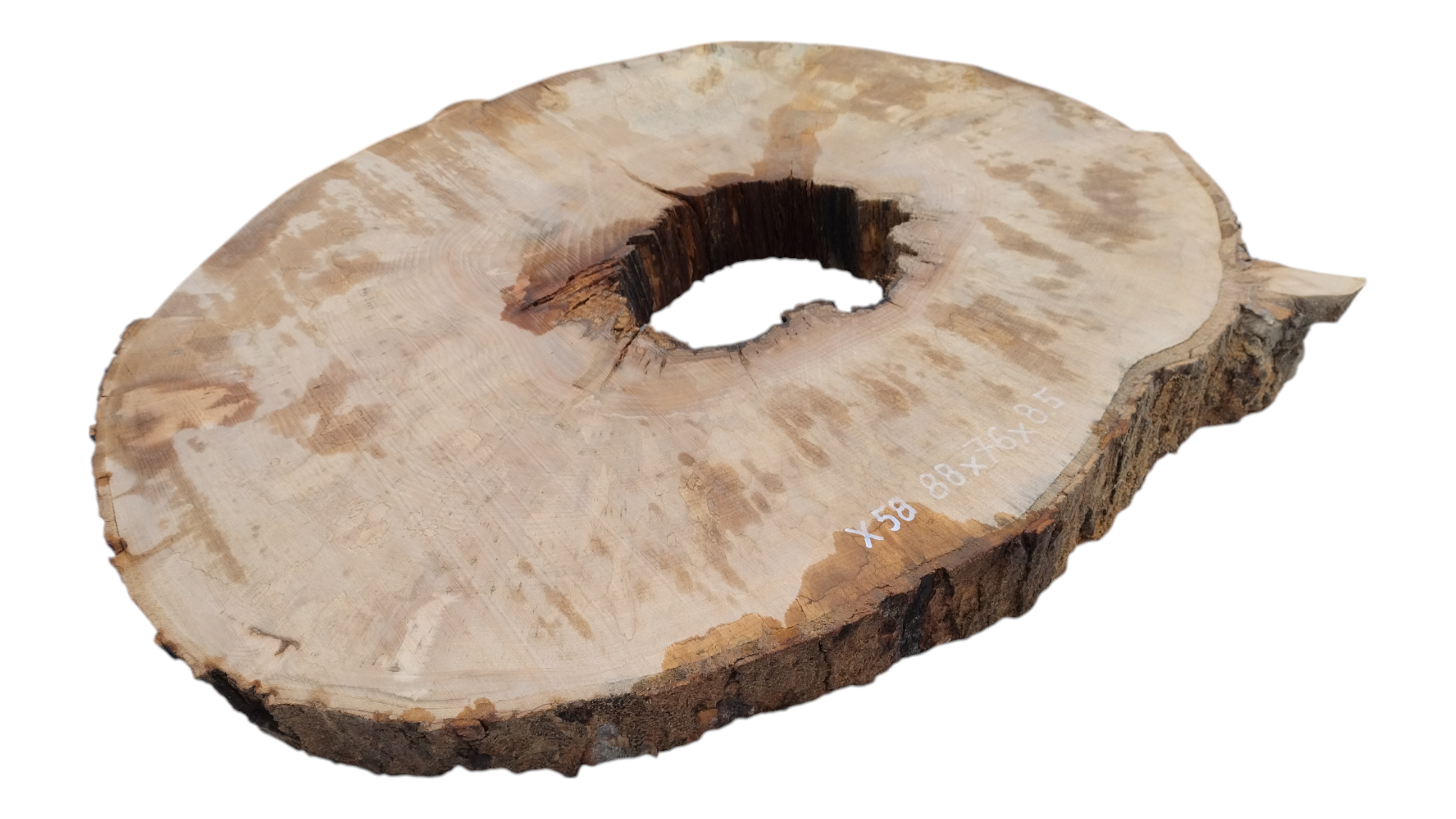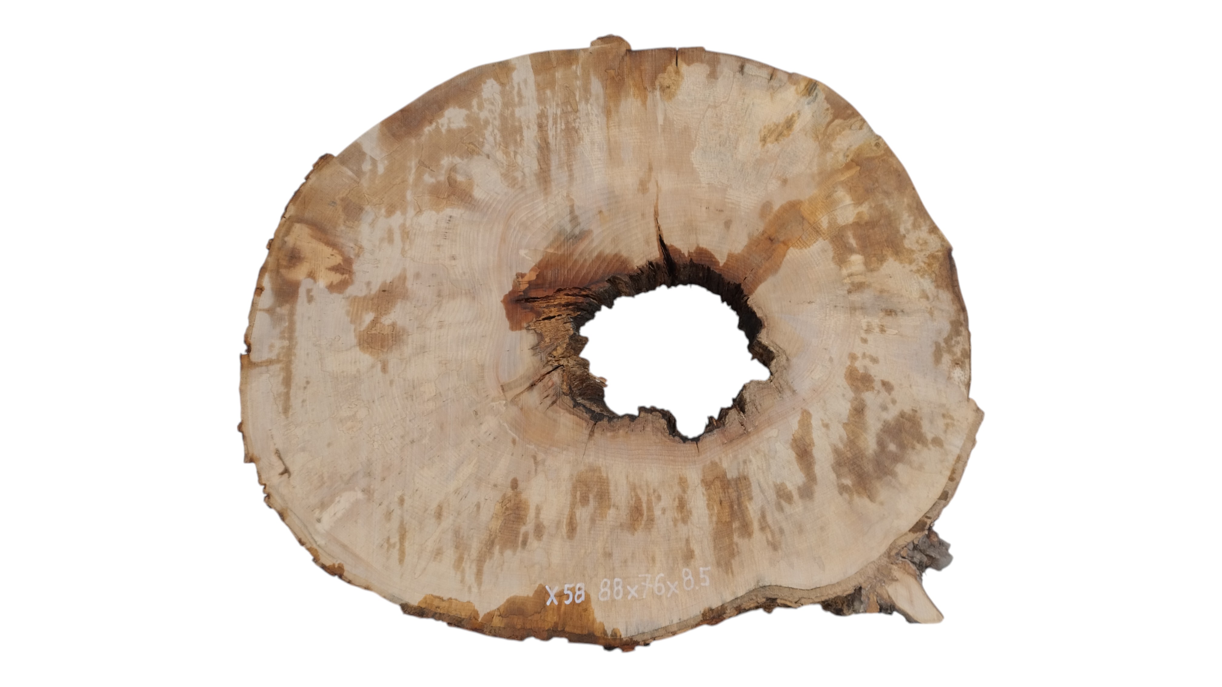 Zdjęcia robimy od razu po przecięciu, żeby jak najlepiej pokazać w jaki sposób można wyprowadzić plaster i podkreślić jego strukturę. W procesie suszenia naturalną rzeczą są pęknięcia materiału powstałe w skutek oddawania wilgoci oraz powierzchowna zmiana barwy. Zdjęcie nr 2 w galerii przedstawia stan plastra z maja 2025 – wtedy została zmierzona podana wilgotność.