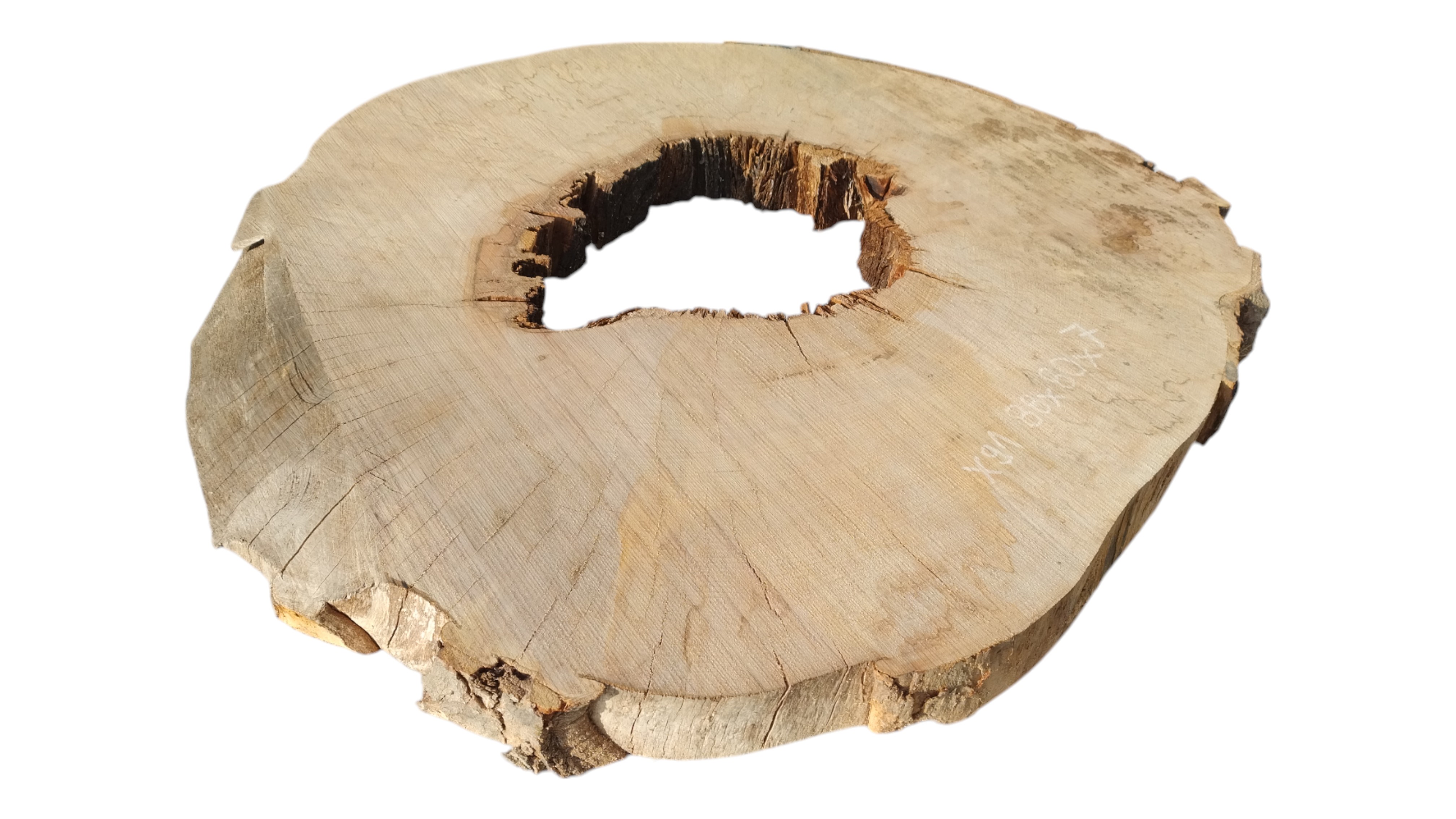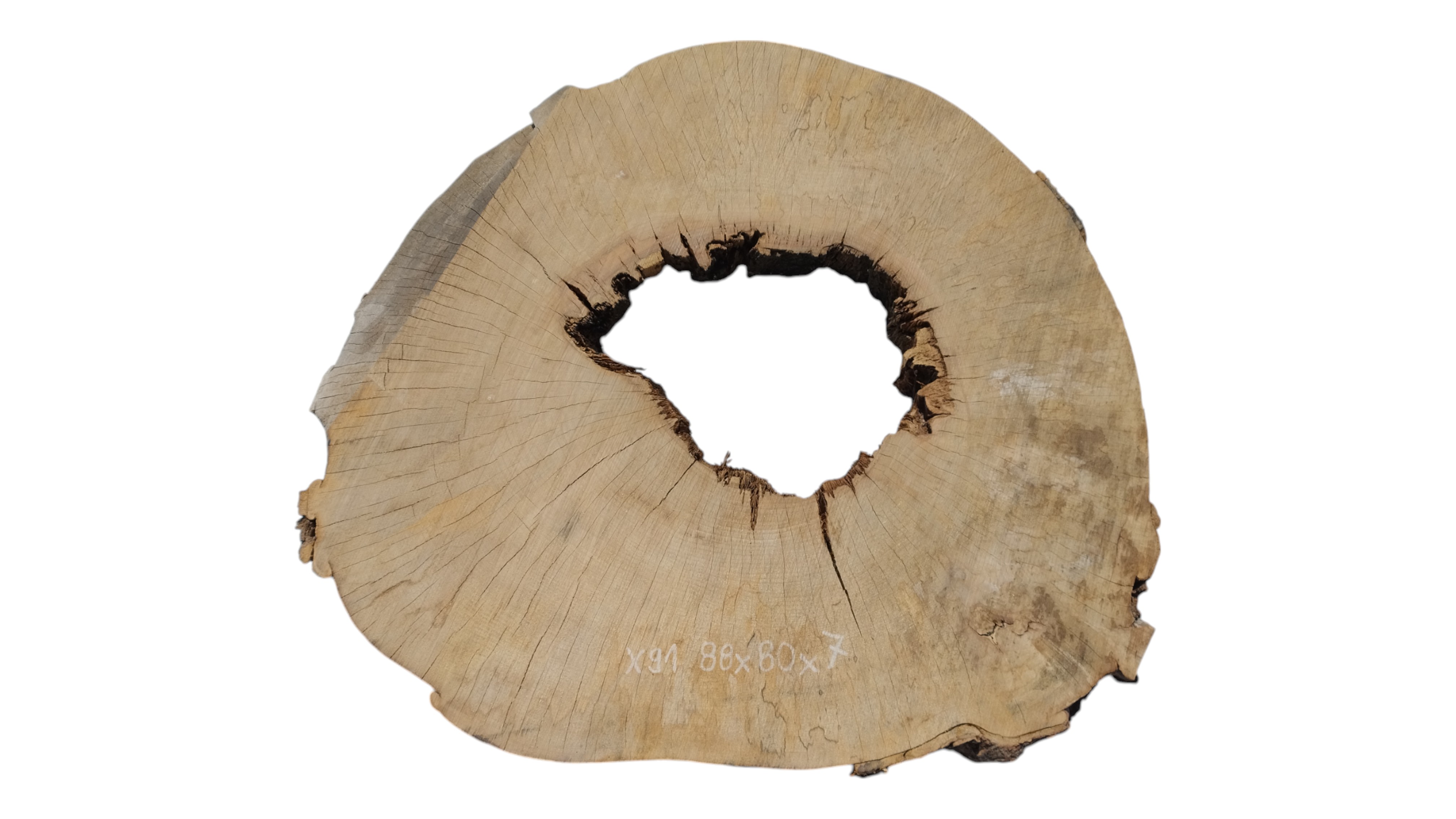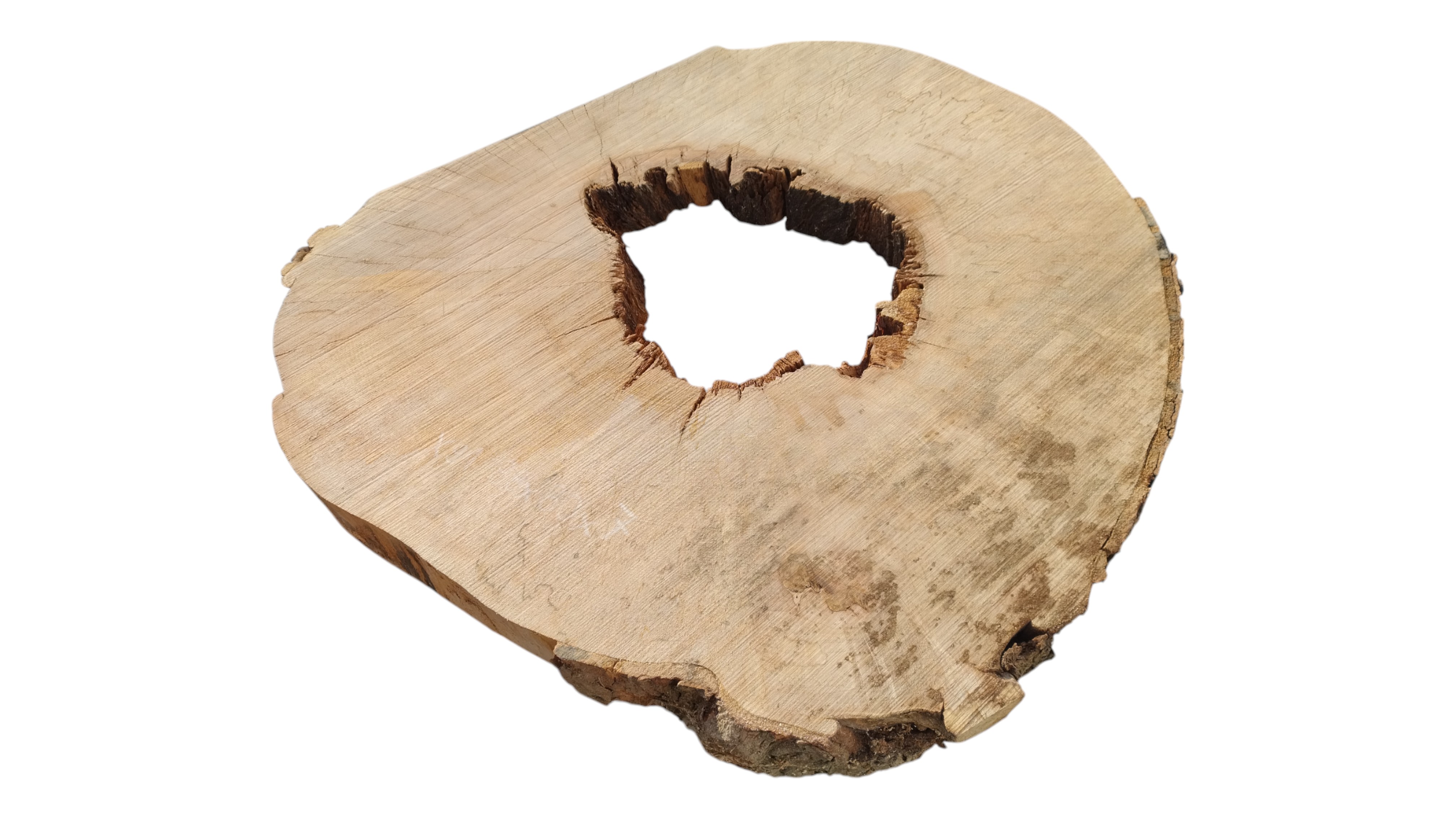 Zdjęcia robimy od razu po przecięciu, żeby jak najlepiej pokazać w jaki sposób można wyprowadzić plaster i podkreślić jego strukturę. W procesie suszenia naturalną rzeczą są pęknięcia materiału powstałe w skutek oddawania wilgoci oraz powierzchowna zmiana barwy. Zdjęcie nr 2 w galerii przedstawia stan plastra z maja 2025 – wtedy została zmierzona podana wilgotność.