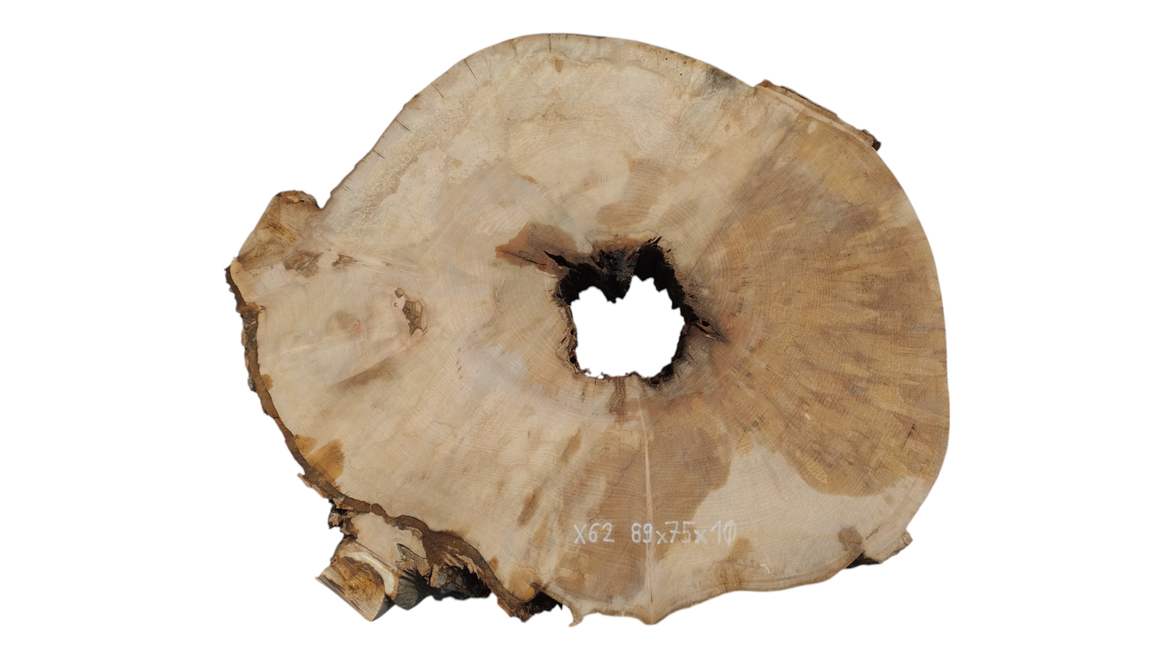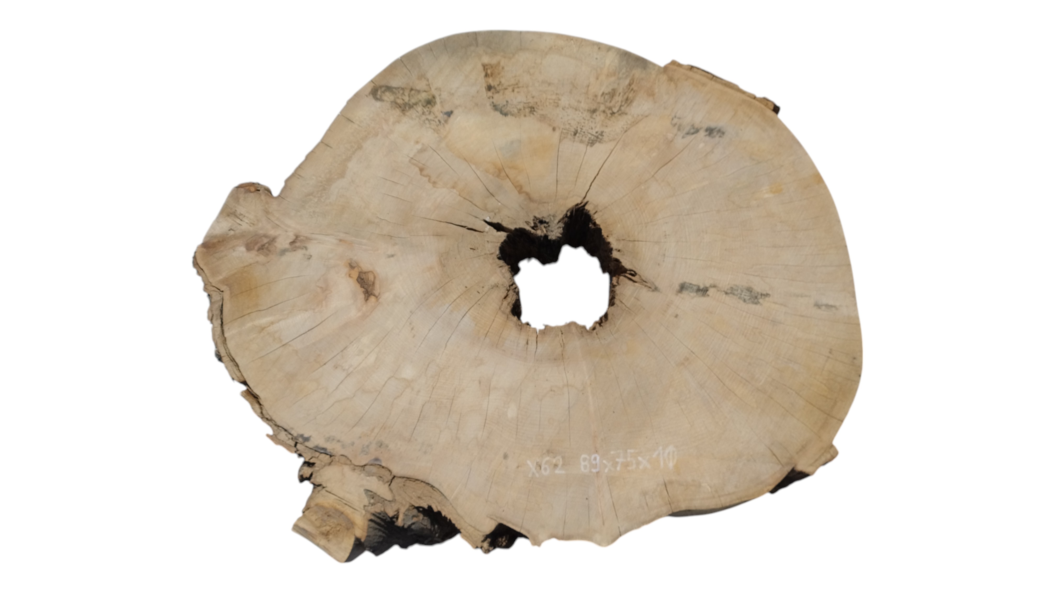 Zdjęcia robimy od razu po przecięciu, żeby jak najlepiej pokazać w jaki sposób można wyprowadzić plaster i podkreślić jego strukturę. W procesie suszenia naturalną rzeczą są pęknięcia materiału powstałe w skutek oddawania wilgoci oraz powierzchowna zmiana barwy. Zdjęcie nr 2 w galerii przedstawia stan plastra z maja 2025 – wtedy została zmierzona podana wilgotność.
