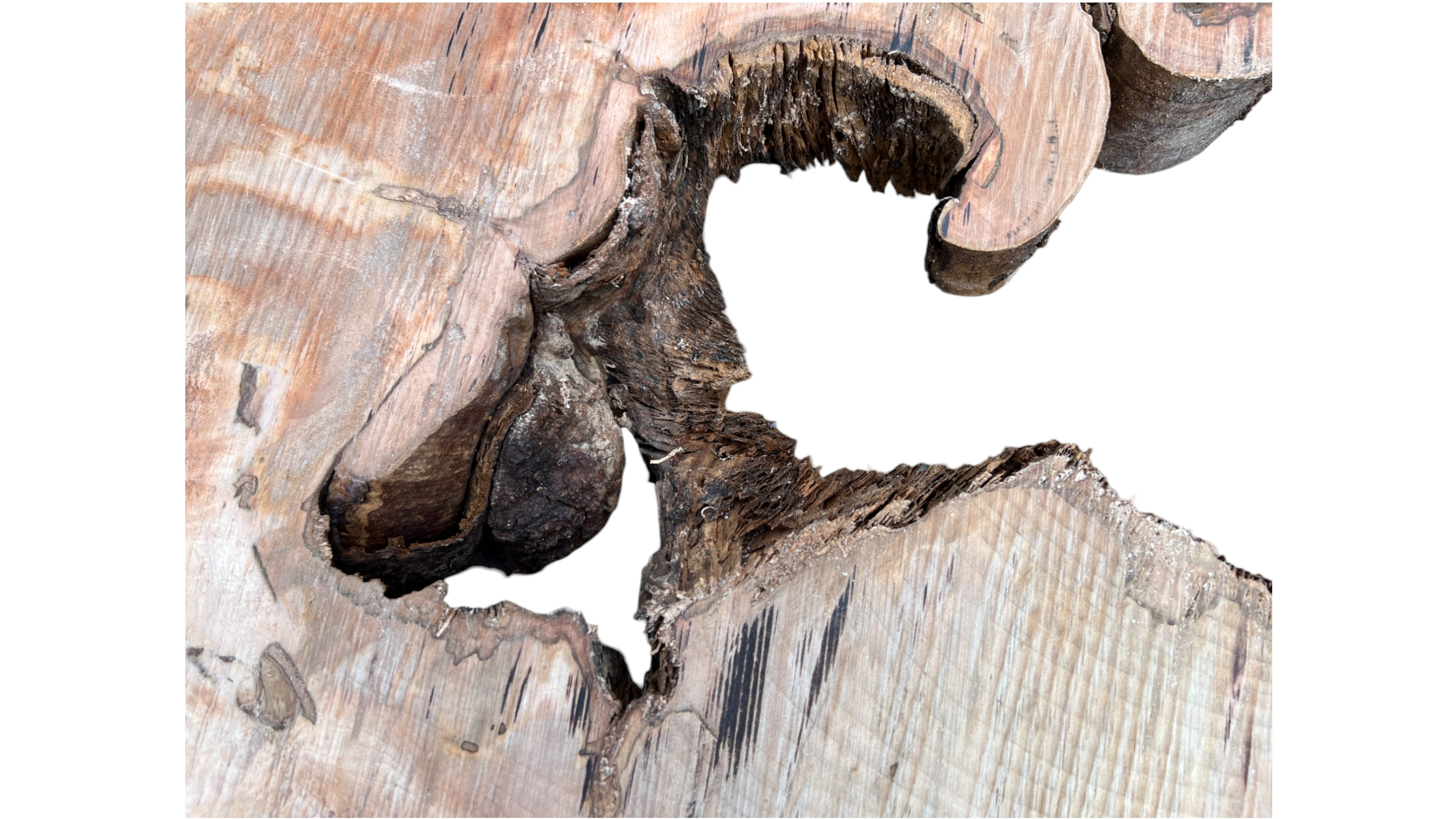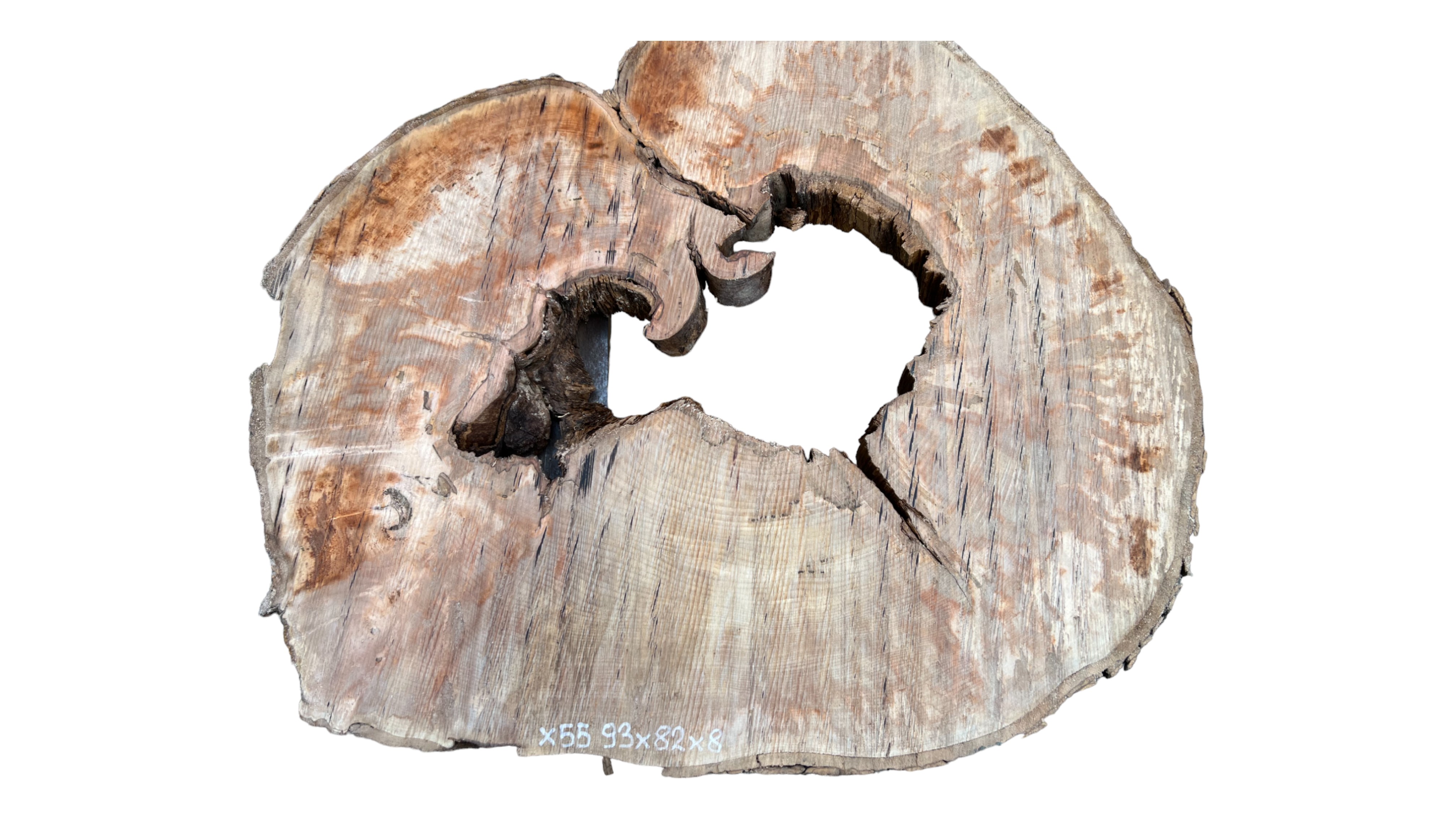 Zdjęcia robimy od razu po przecięciu, żeby jak najlepiej pokazać w jaki sposób można wyprowadzić plaster i podkreślić jego strukturę. W procesie suszenia naturalną rzeczą są pęknięcia materiału powstałe w skutek oddawania wilgoci oraz powierzchowna zmiana barwy. Zdjęcie nr 2 w galerii przedstawia stan plastra z kwietnia 2025 – wtedy została zmierzona podana wilgotność.