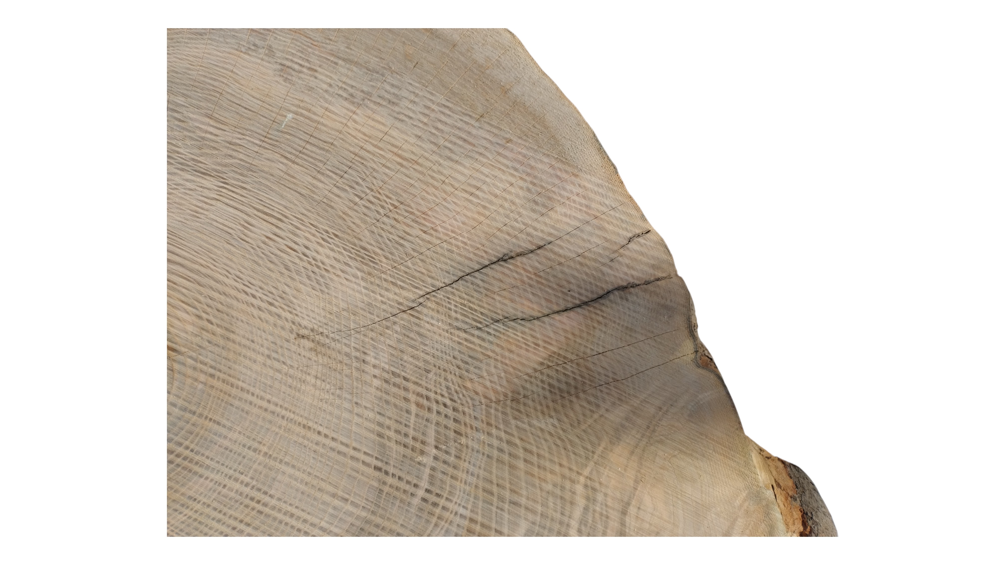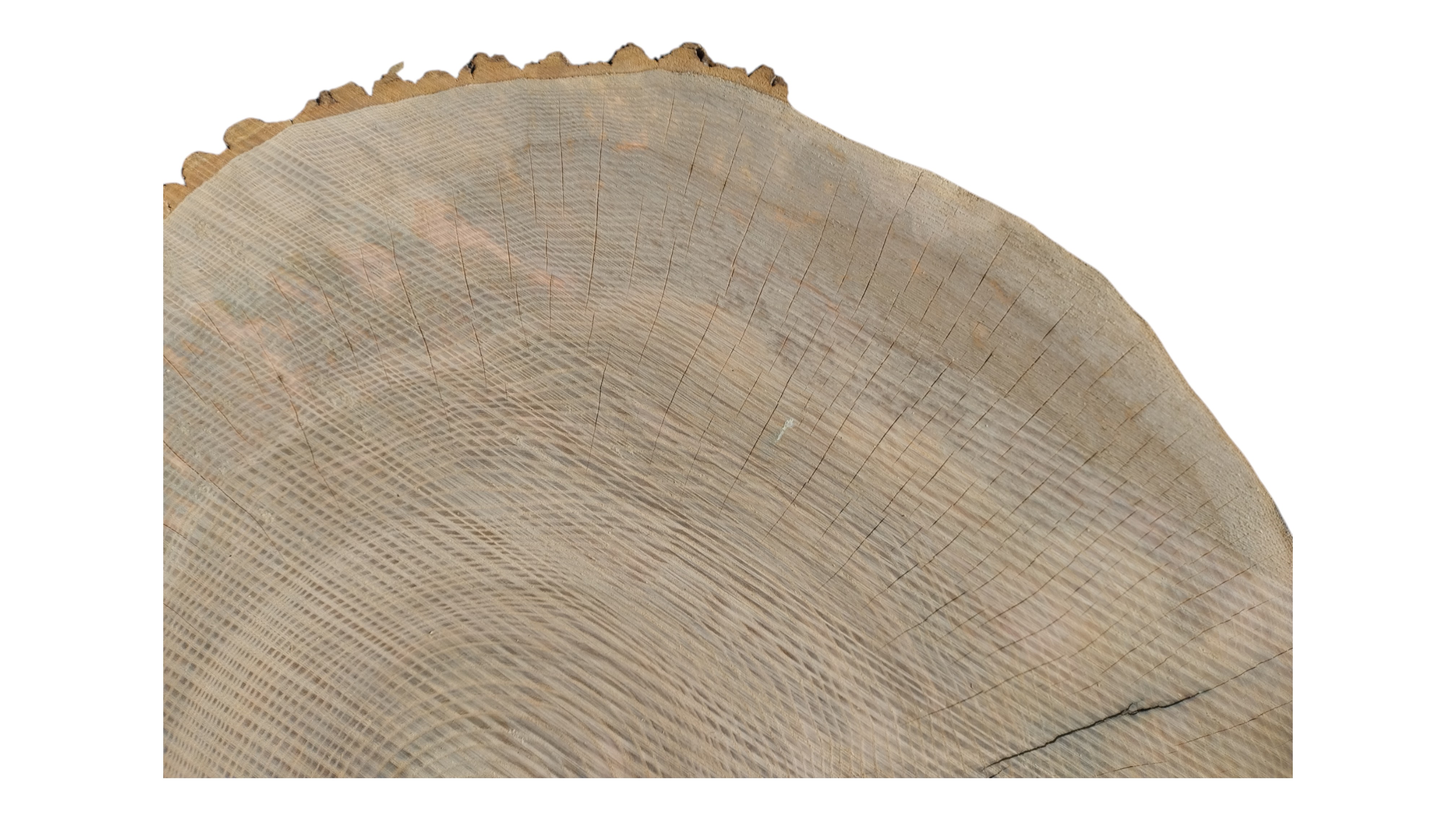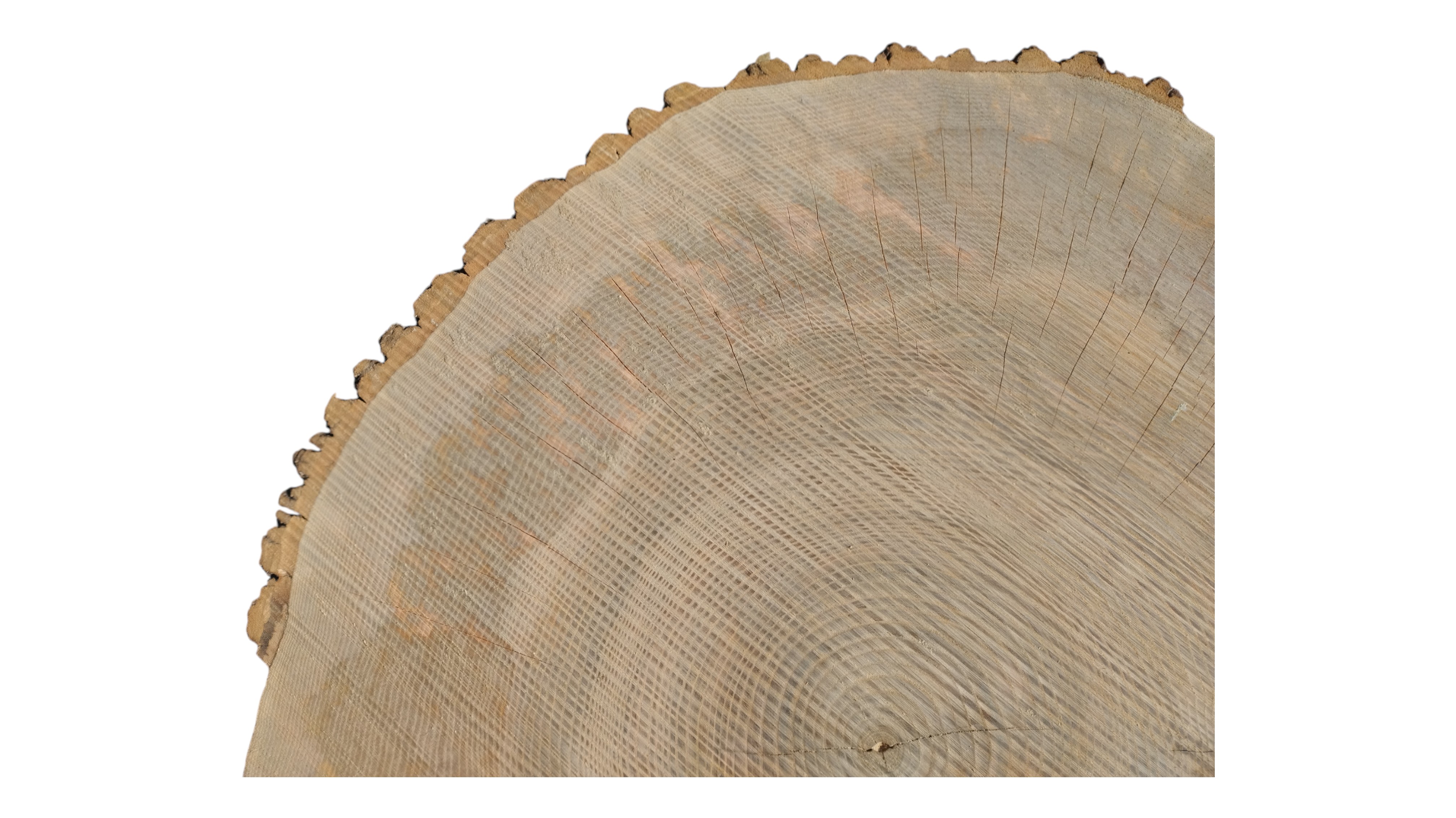 Zdjęcia robimy od razu po przecięciu, żeby jak najlepiej pokazać w jaki sposób można wyprowadzić plaster i podkreślić jego strukturę. W procesie suszenia naturalną rzeczą są pęknięcia materiału powstałe w skutek oddawania wilgoci oraz powierzchowna zmiana barwy. Zdjęcie nr 2 w galerii przedstawia stan plastra z września 2025 – wtedy została zmierzona podana wilgotność.