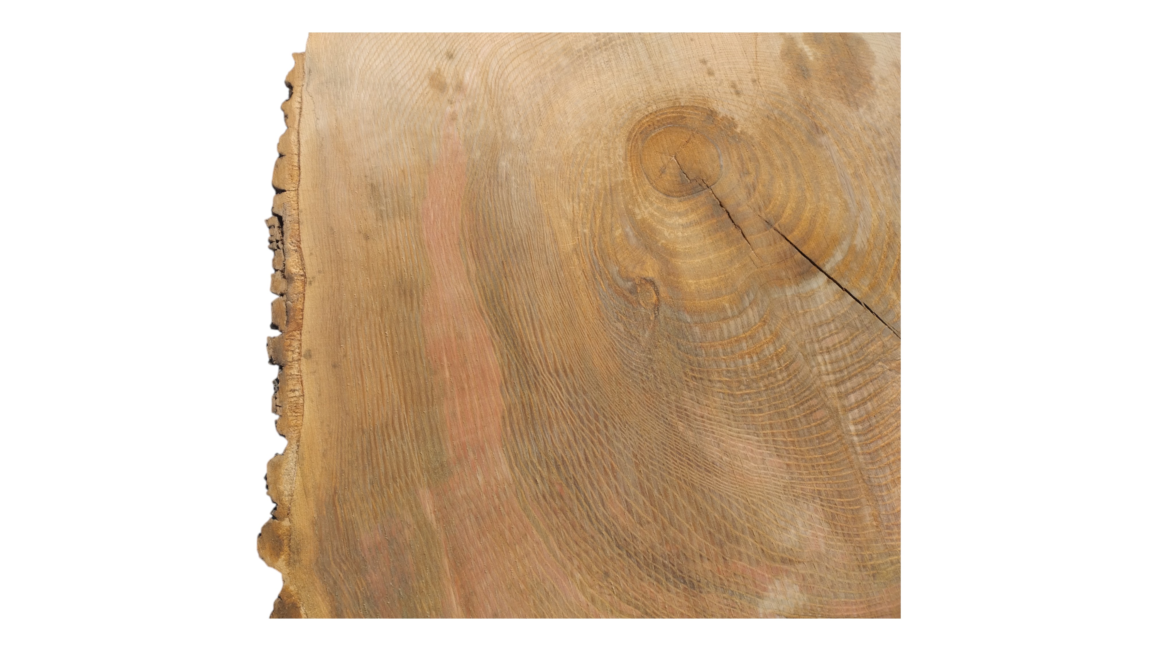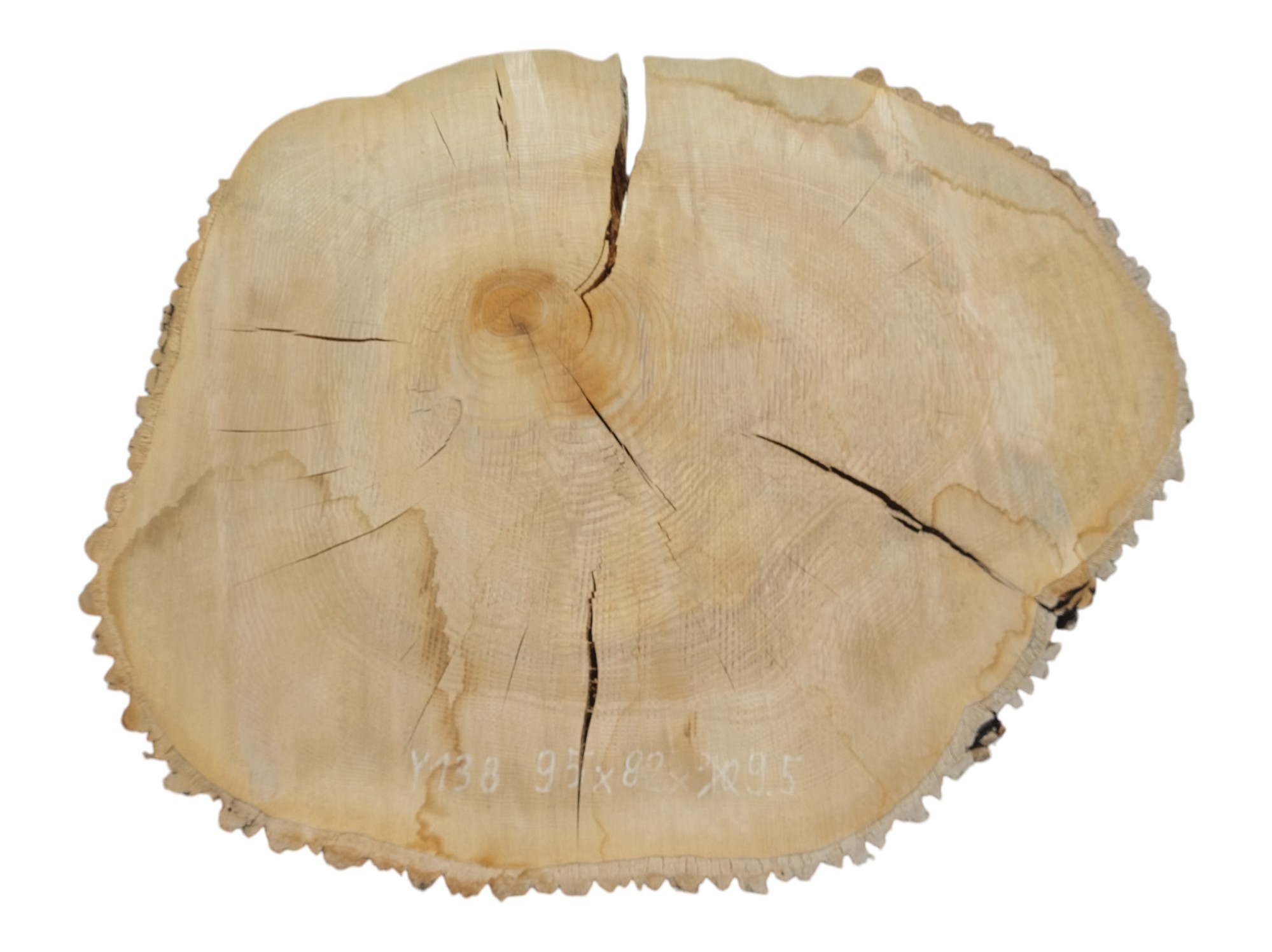 Zdjęcia robimy od razu po przecięciu, żeby jak najlepiej pokazać w jaki sposób można wyprowadzić plaster i podkreślić jego strukturę. W procesie suszenia naturalną rzeczą są pęknięcia materiału powstałe w skutek oddawania wilgoci oraz powierzchowna zmiana barwy. Zdjęcie nr 2 w galerii przedstawia stan plastra z września 2025 – wtedy została zmierzona podana wilgotność.