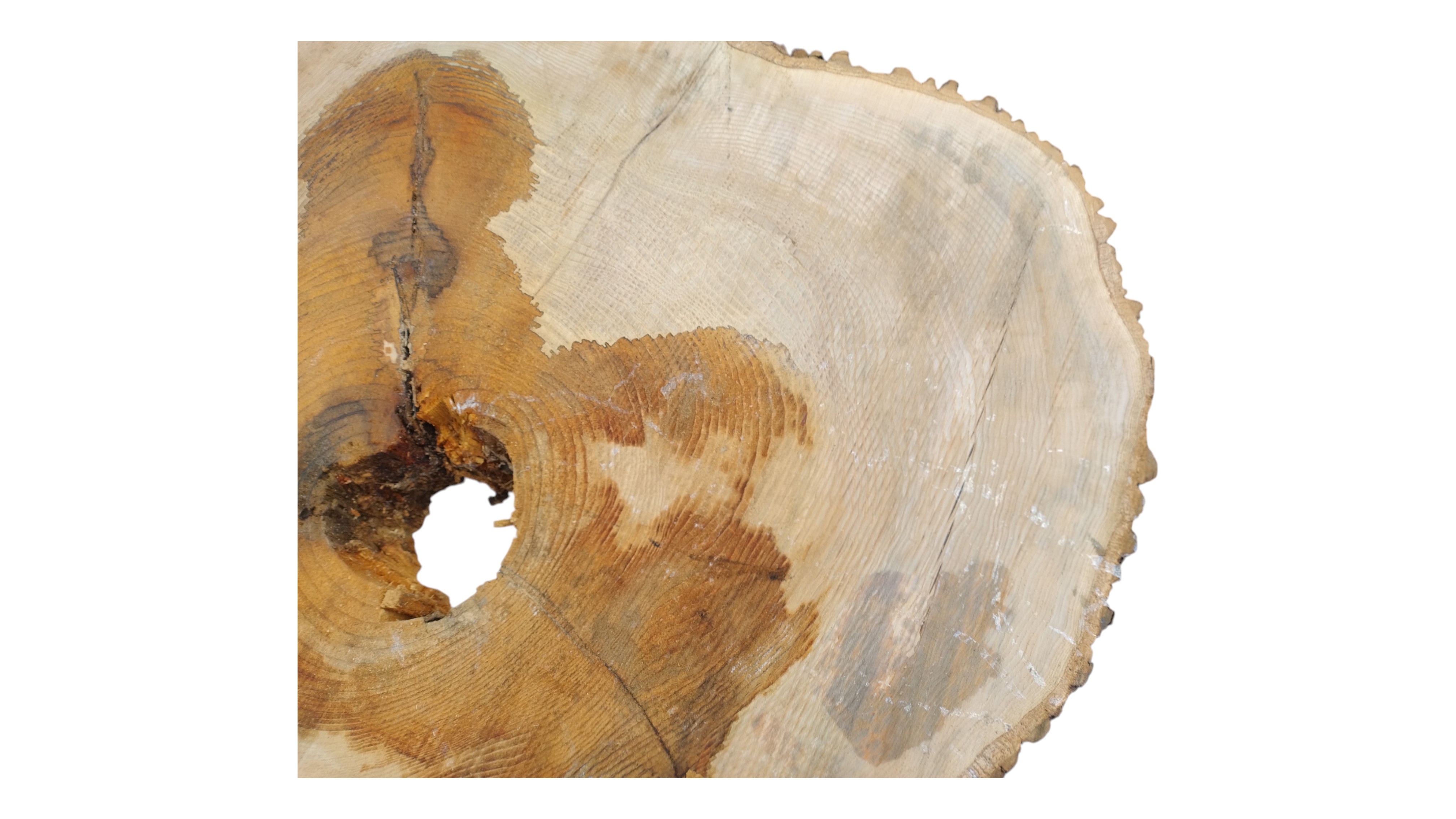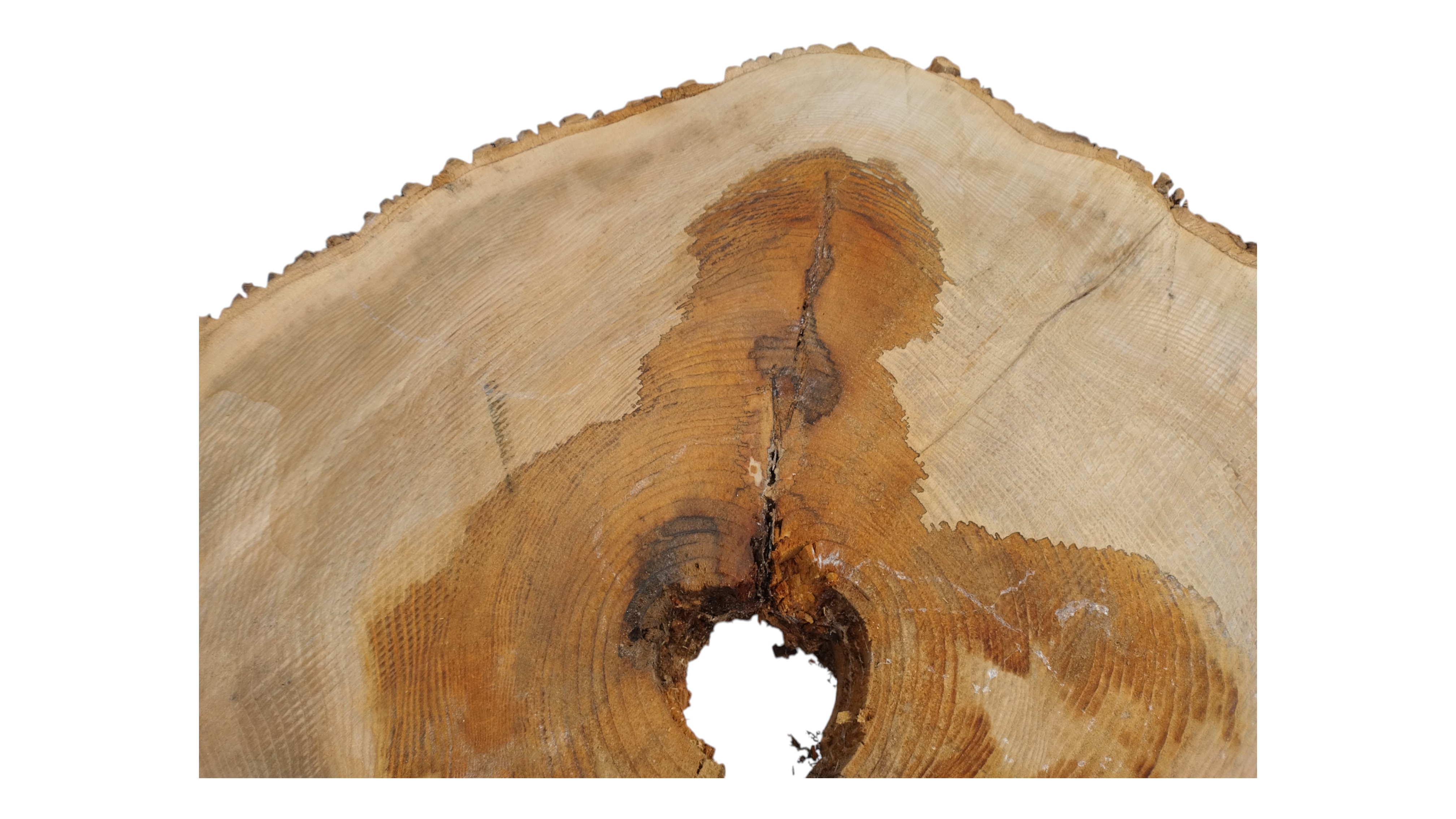 Zdjęcia robimy od razu po przecięciu, żeby jak najlepiej pokazać w jaki sposób można wyprowadzić plaster i podkreślić jego strukturę. W procesie suszenia naturalną rzeczą są pęknięcia materiału powstałe w skutek oddawania wilgoci oraz powierzchowna zmiana barwy. Zdjęcie nr 2 w galerii przedstawia stan plastra z września 2025 – wtedy została zmierzona podana wilgotność.