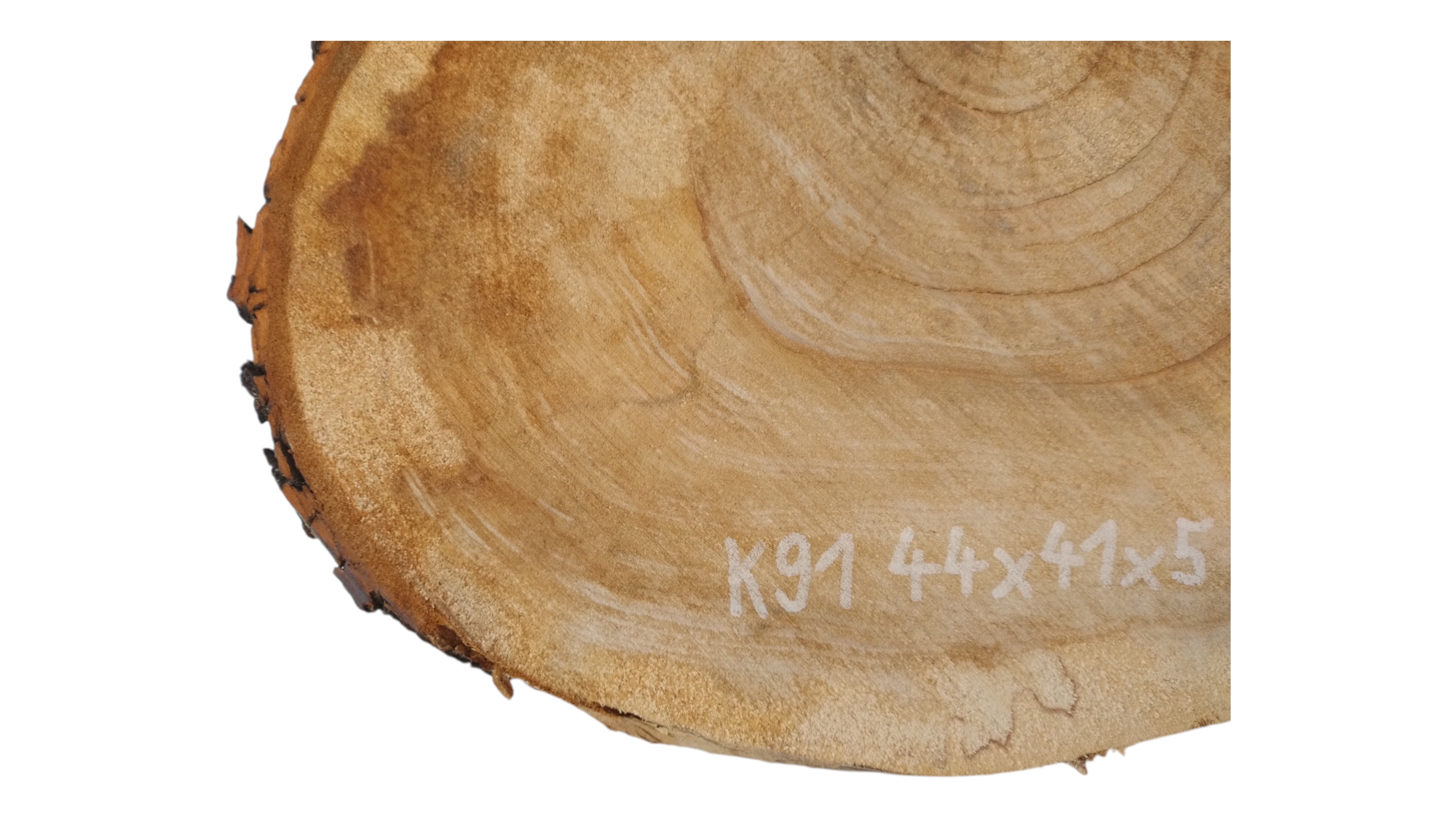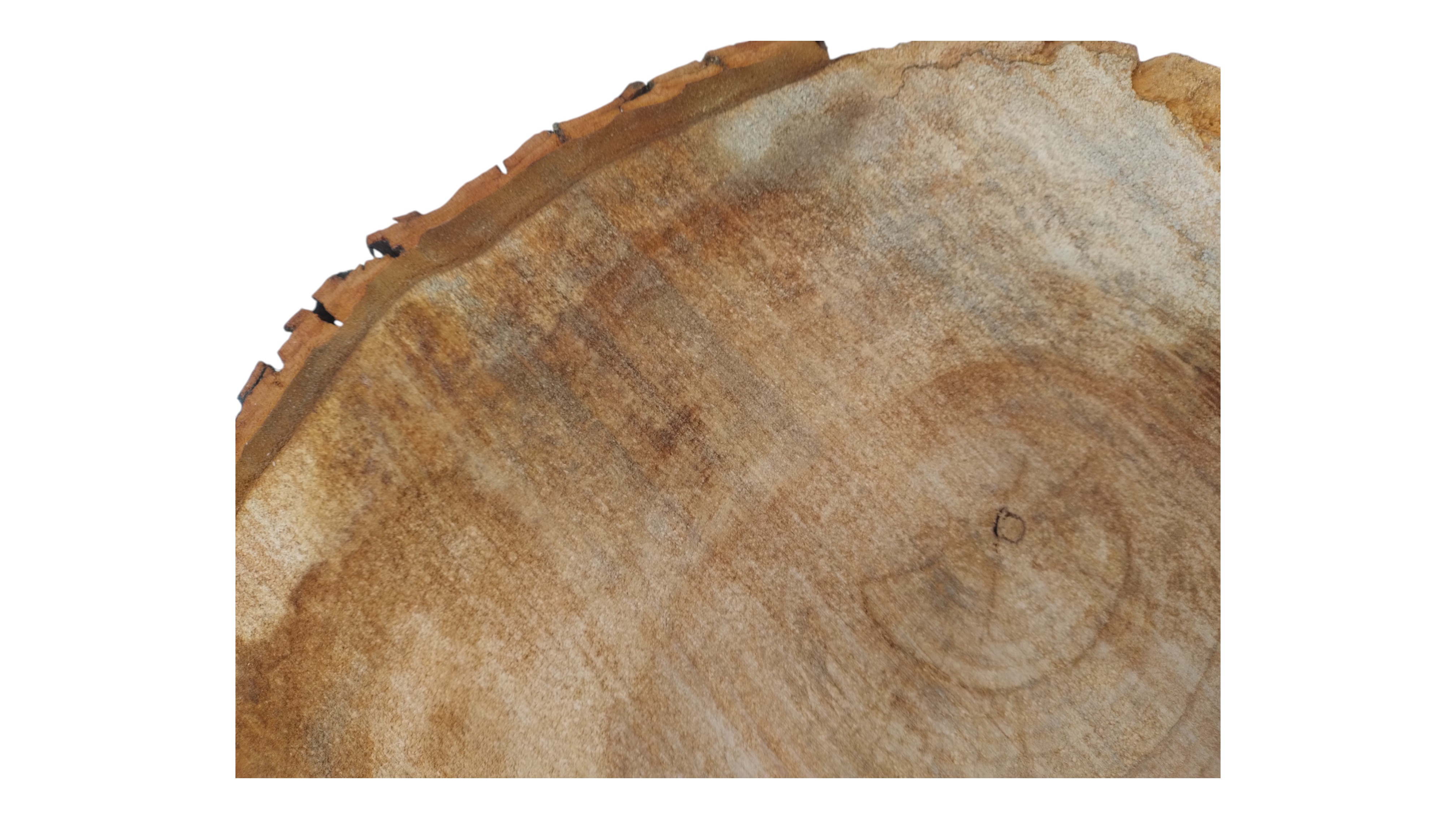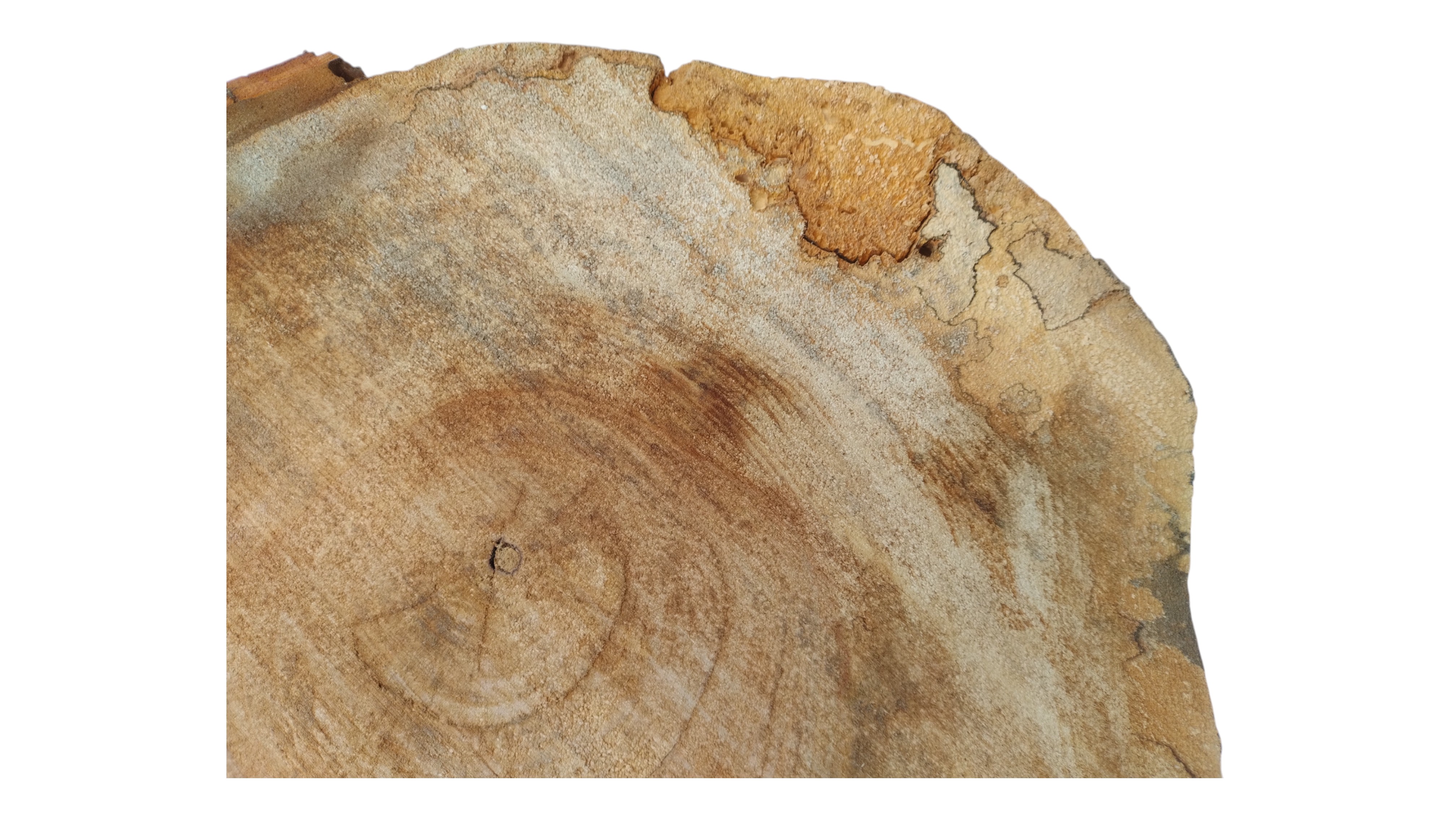 Zdjęcia robimy od razu po przecięciu, żeby jak najlepiej pokazać w jaki sposób można wyprowadzić plaster i podkreślić jego strukturę. W procesie suszenia naturalną rzeczą są pęknięcia materiału powstałe w skutek oddawania wilgoci oraz powierzchowna zmiana barwy. Zdjęcie nr 2 w galerii przedstawia stan plastra z lipca 2025 – wtedy została zmierzona podana wilgotność.