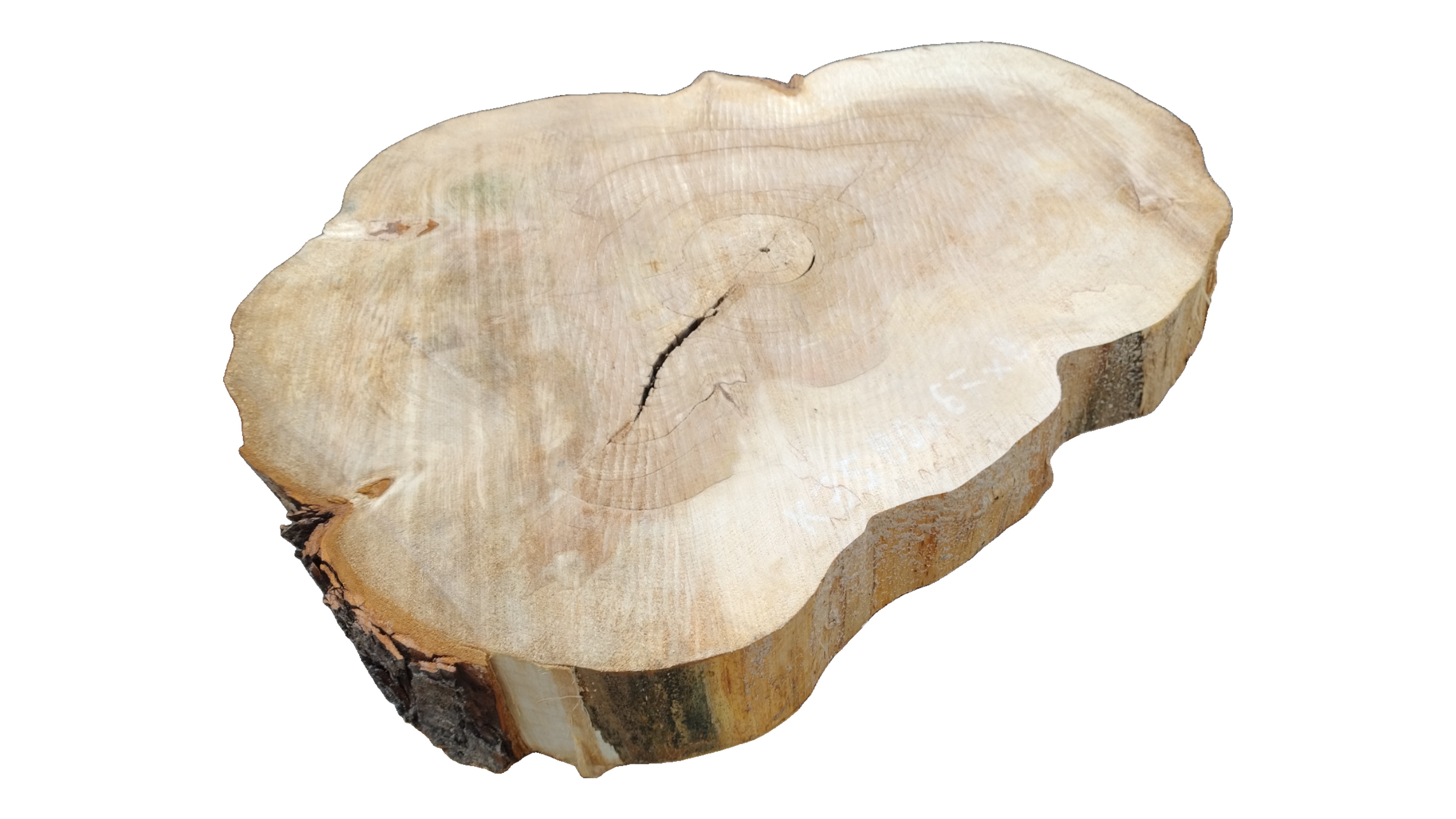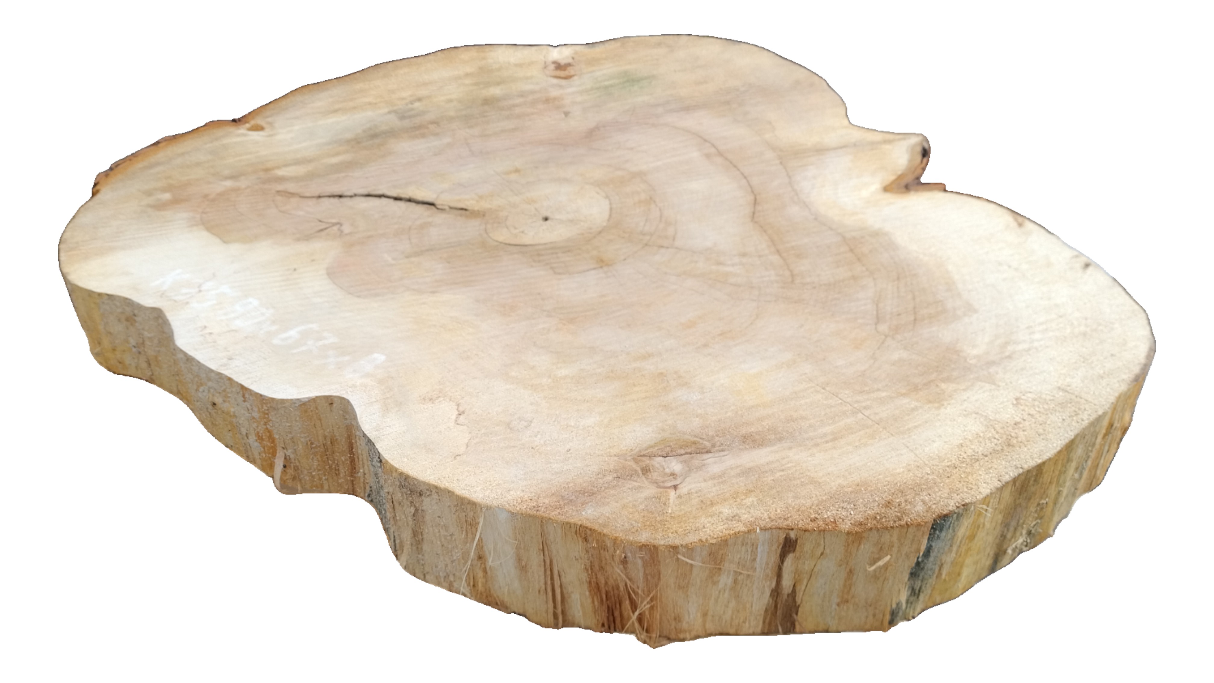 Zdjęcia robimy od razu po przecięciu, żeby jak najlepiej pokazać w jaki sposób można wyprowadzić plaster i podkreślić jego strukturę. W procesie suszenia naturalną rzeczą są pęknięcia materiału powstałe w skutek oddawania wilgoci oraz powierzchowna zmiana barwy. Zdjęcie nr 2 w galerii przedstawia stan plastra z lipca 2025 – wtedy została zmierzona podana wilgotność.