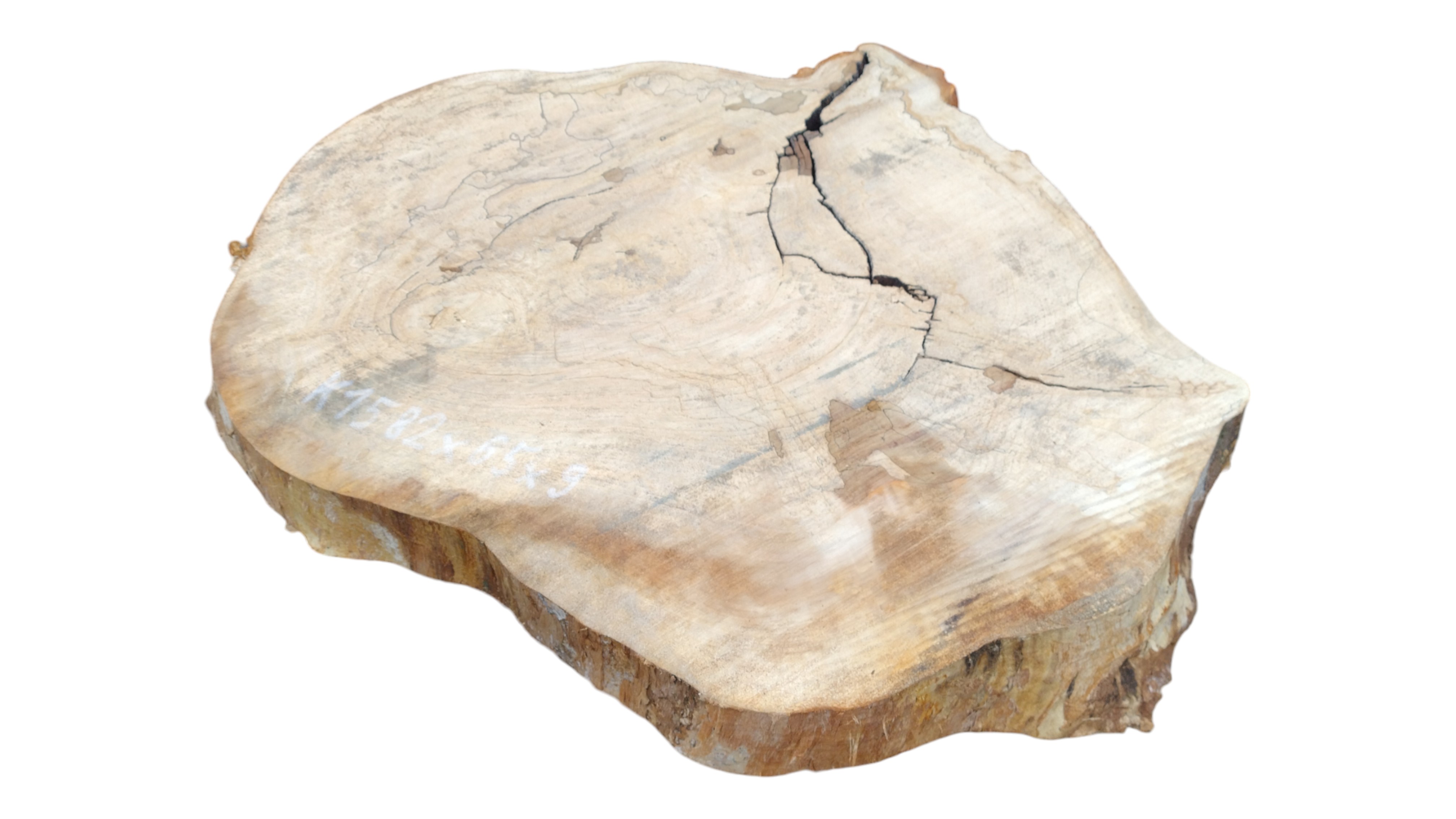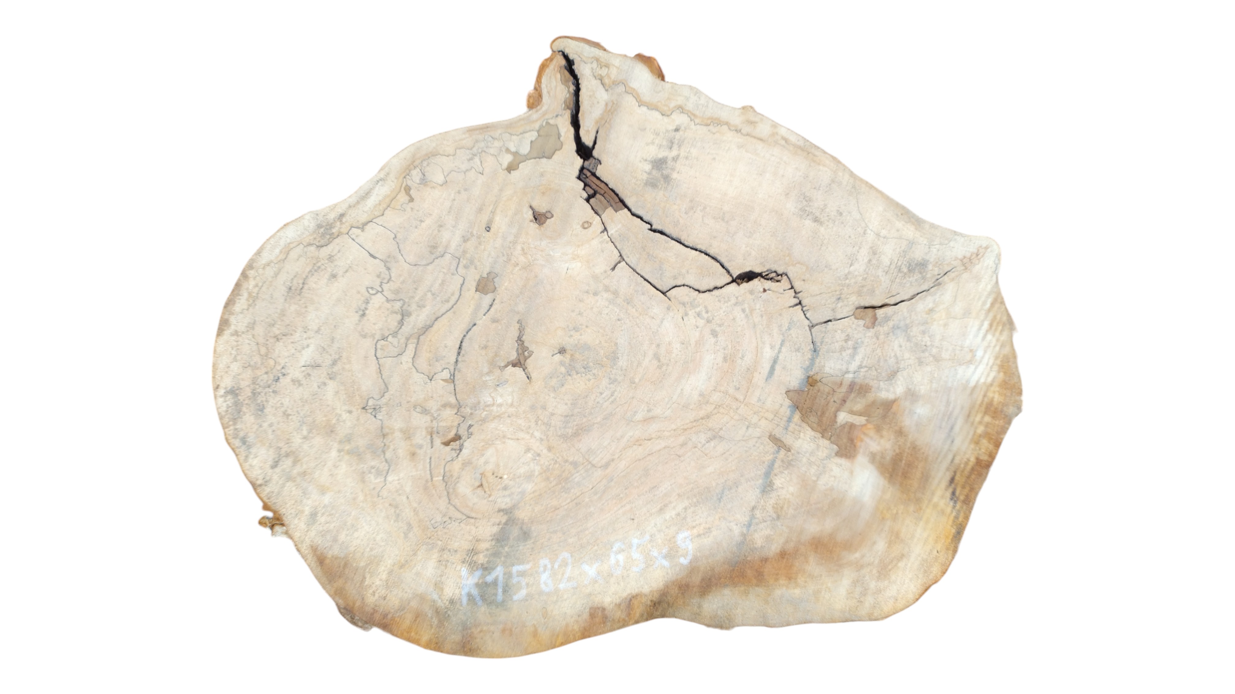 Zdjęcia robimy od razu po przecięciu, żeby jak najlepiej pokazać w jaki sposób można wyprowadzić plaster i podkreślić jego strukturę. W procesie suszenia naturalną rzeczą są pęknięcia materiału powstałe w skutek oddawania wilgoci oraz powierzchowna zmiana barwy. Zdjęcie nr 2 w galerii przedstawia stan plastra z lipca 2025 – wtedy została zmierzona podana wilgotność.
