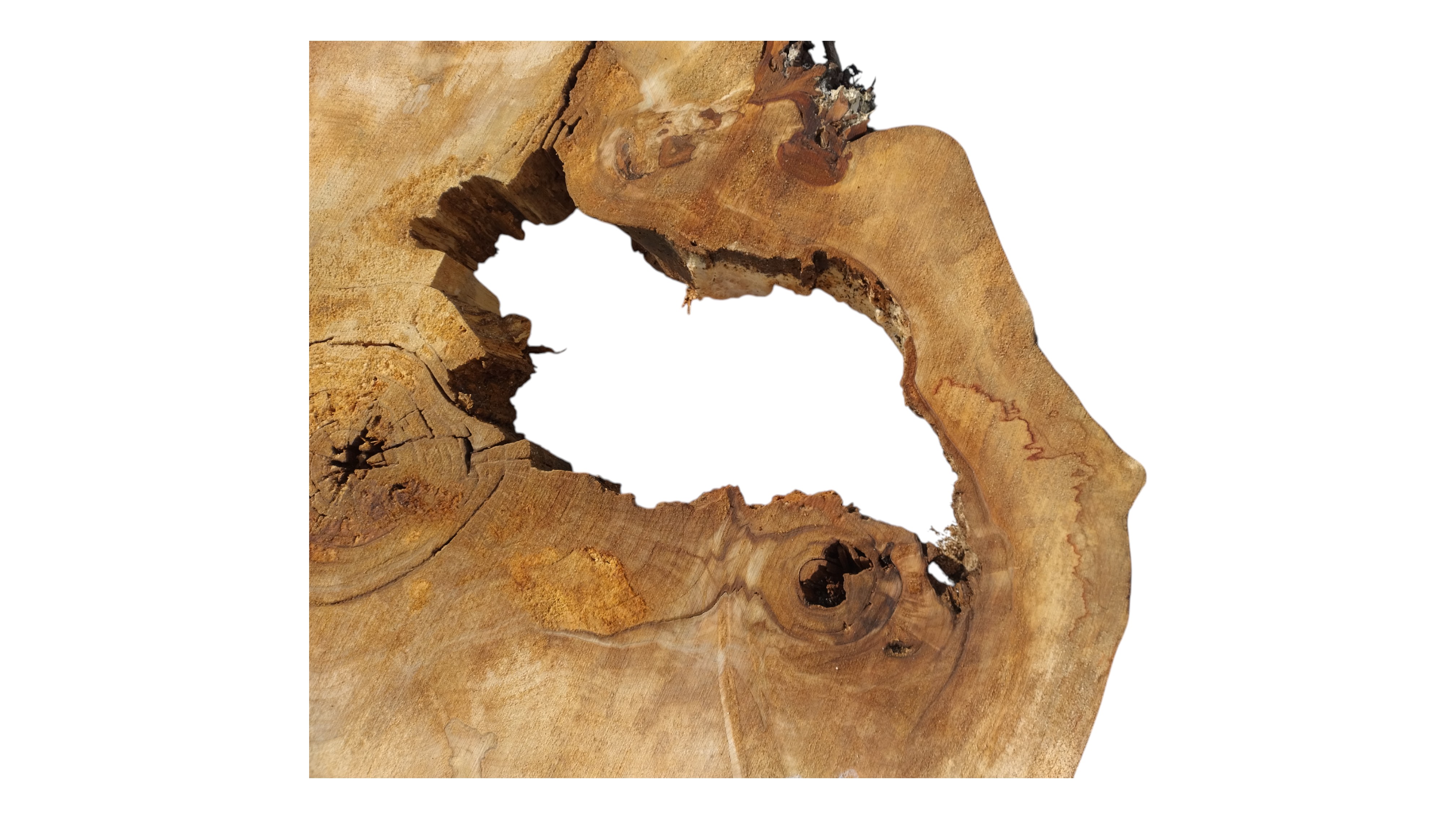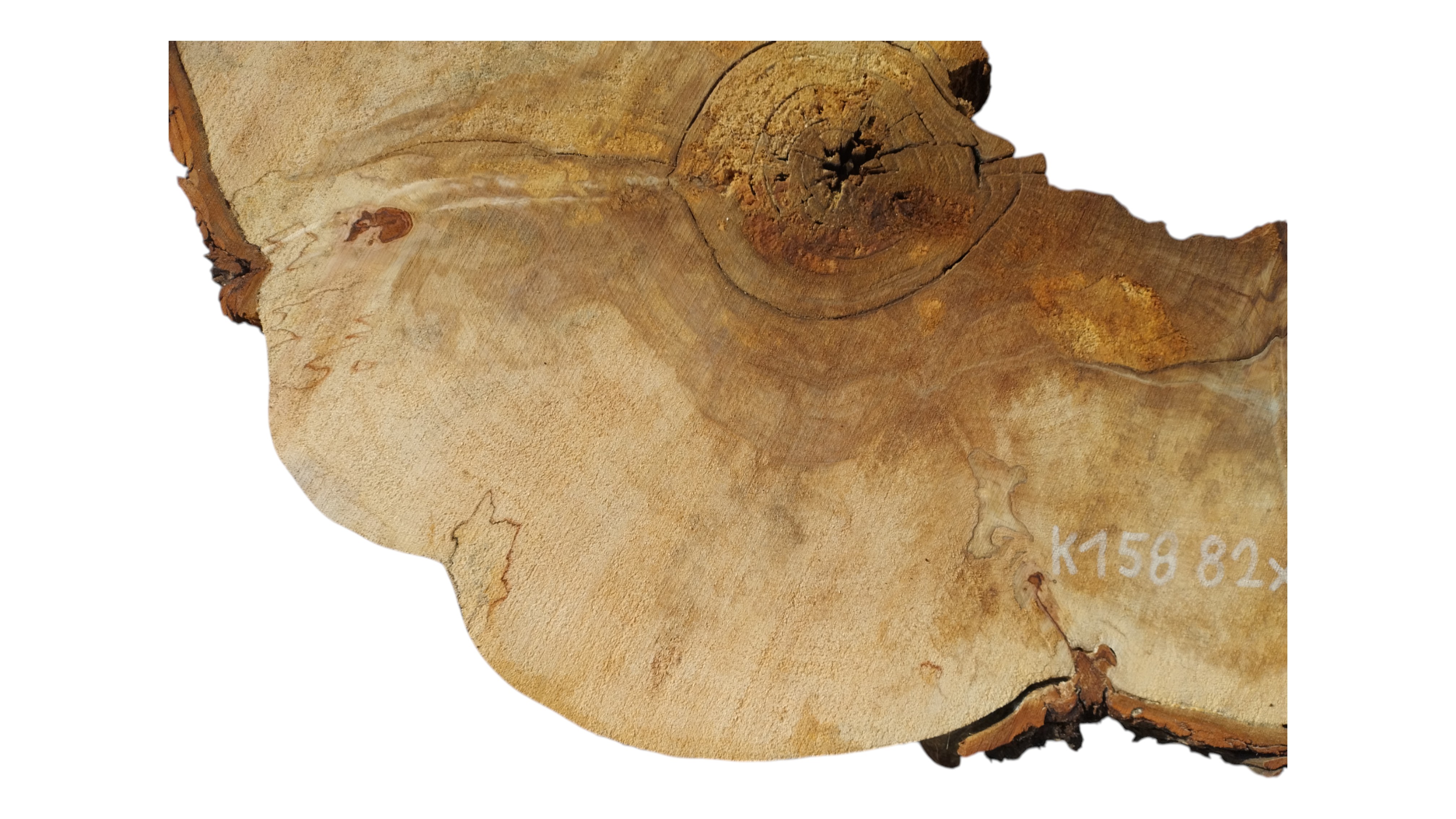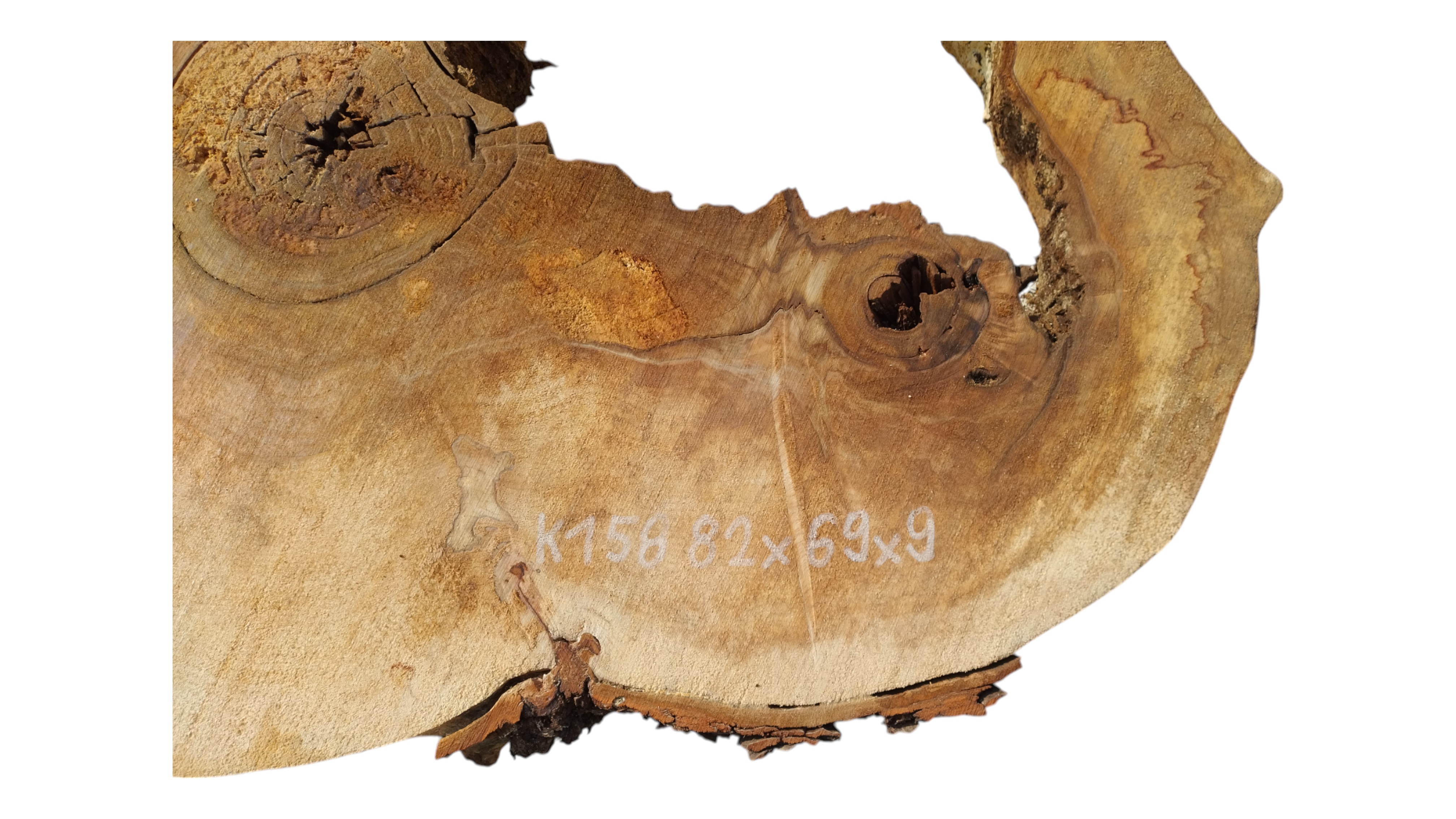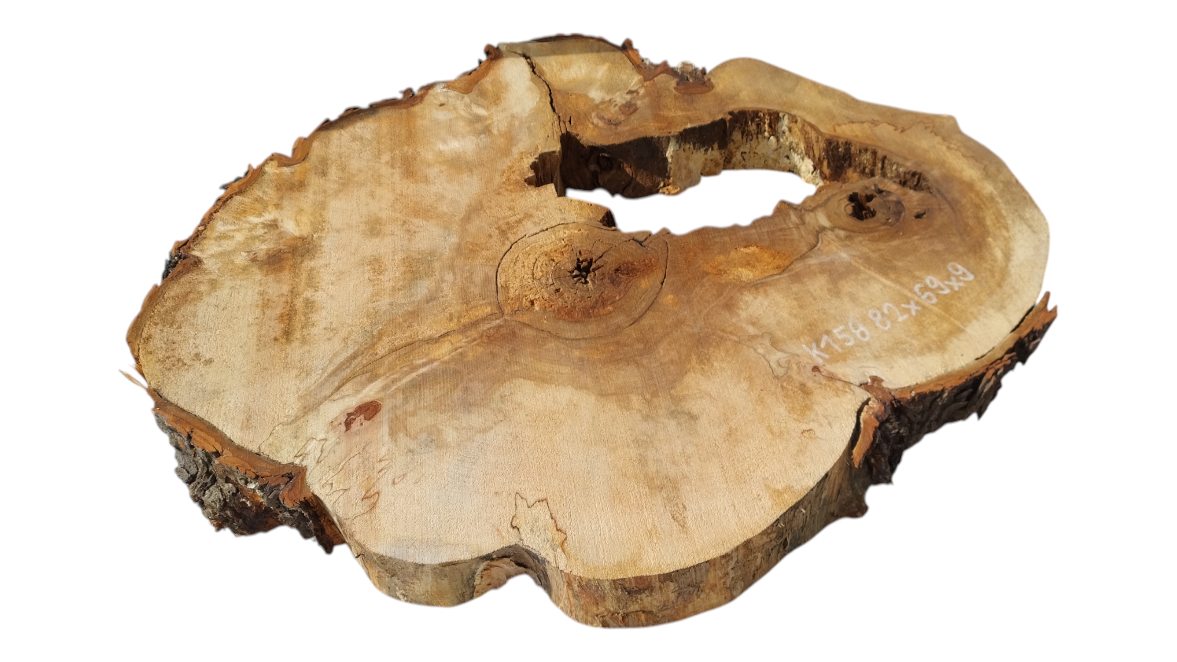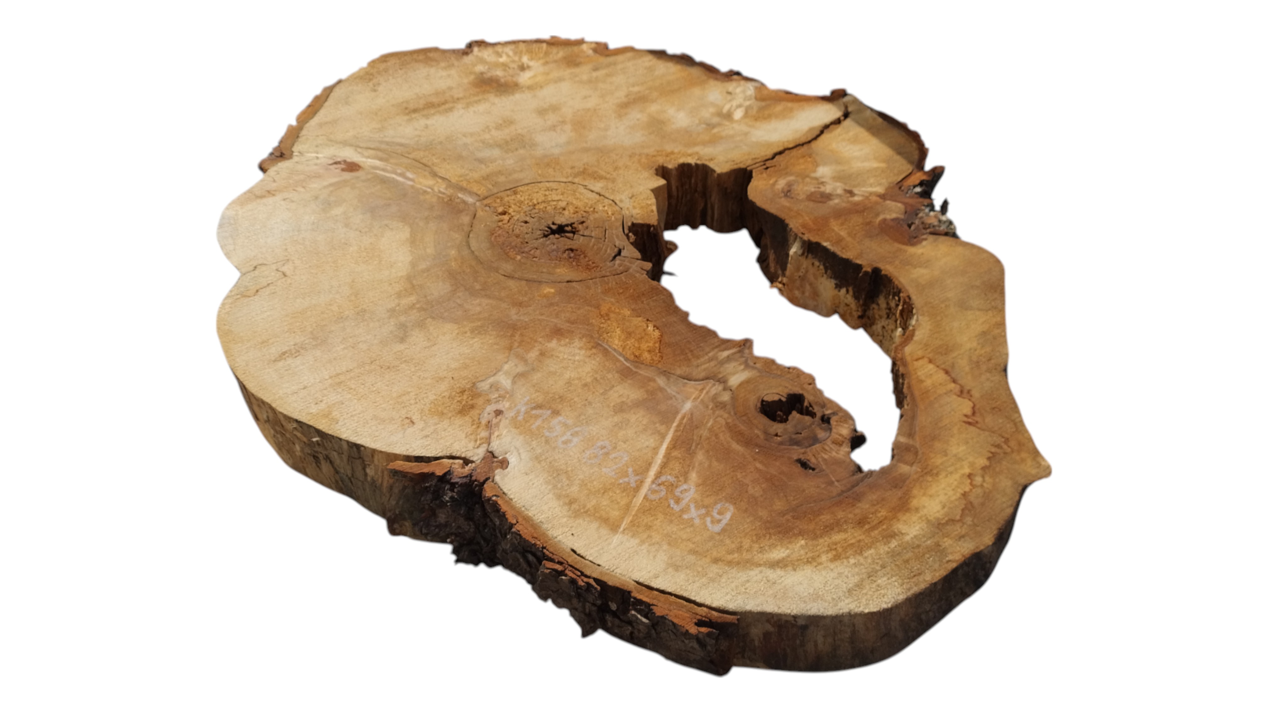 Zdjęcia robimy od razu po przecięciu, żeby jak najlepiej pokazać w jaki sposób można wyprowadzić plaster i podkreślić jego strukturę. W procesie suszenia naturalną rzeczą są pęknięcia materiału powstałe w skutek oddawania wilgoci oraz powierzchowna zmiana barwy. Zdjęcie nr 2 w galerii przedstawia stan plastra z maja 2025 – wtedy została zmierzona podana wilgotność.