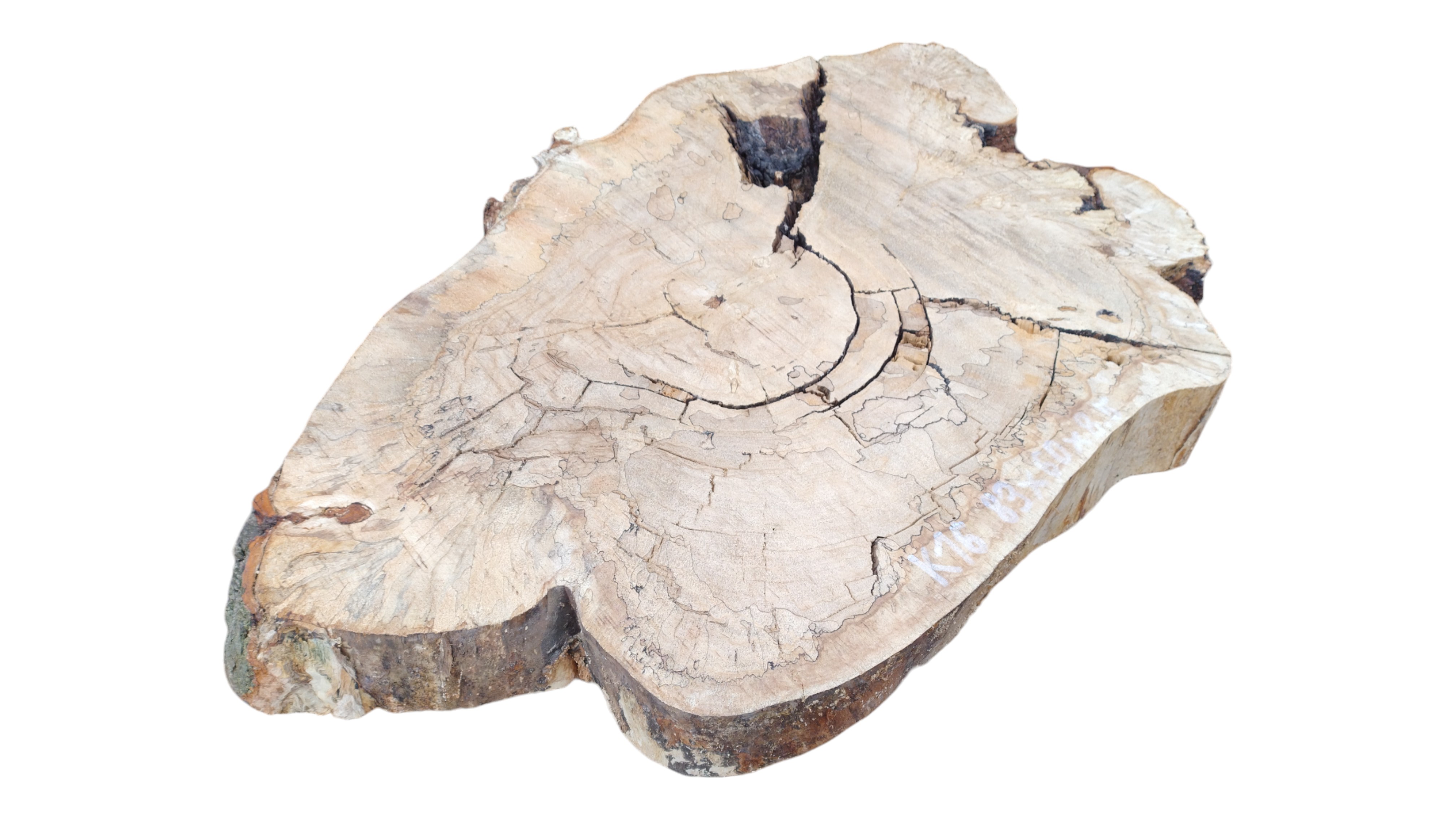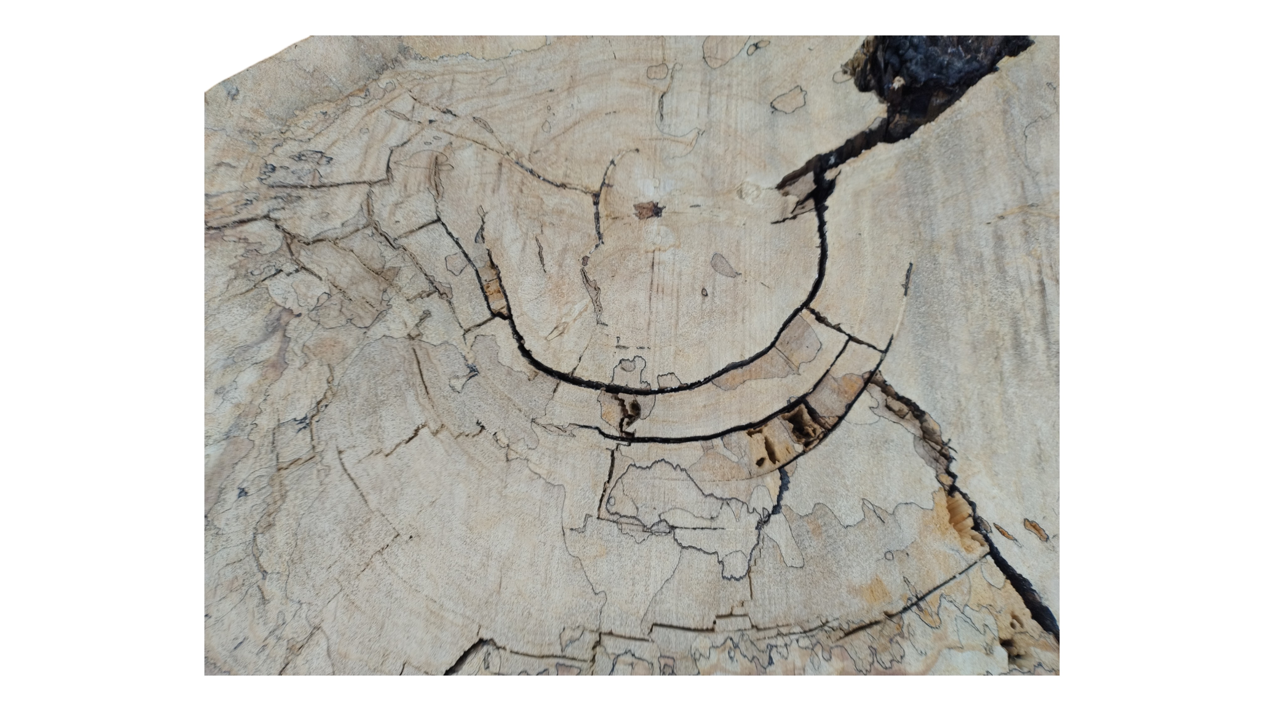 Zdjęcia robimy od razu po przecięciu, żeby jak najlepiej pokazać w jaki sposób można wyprowadzić plaster i podkreślić jego strukturę. W procesie suszenia naturalną rzeczą są pęknięcia materiału powstałe w skutek oddawania wilgoci oraz powierzchowna zmiana barwy. Zdjęcie nr 2 w galerii przedstawia stan plastra z lipca 2025 – wtedy została zmierzona podana wilgotność.