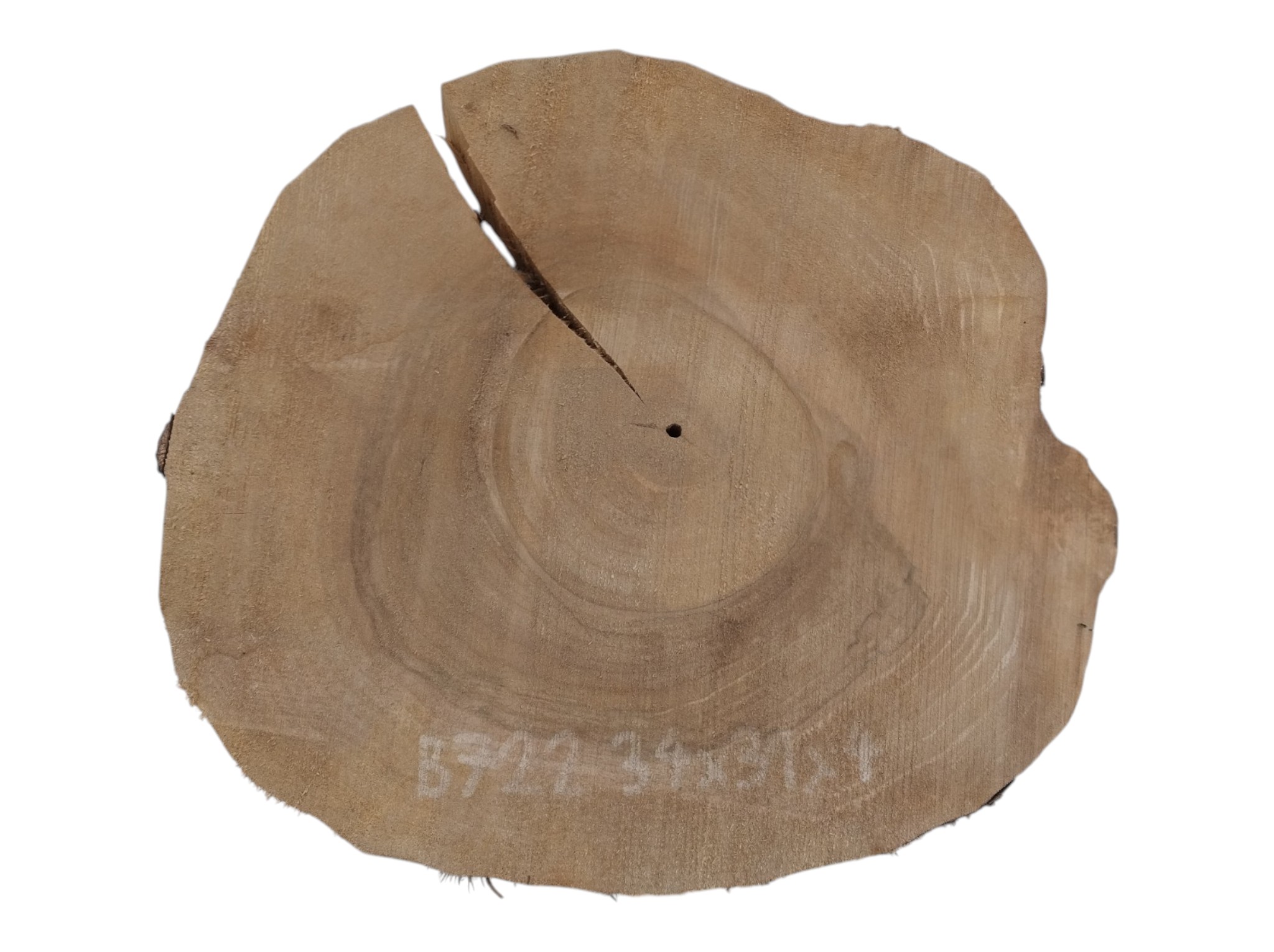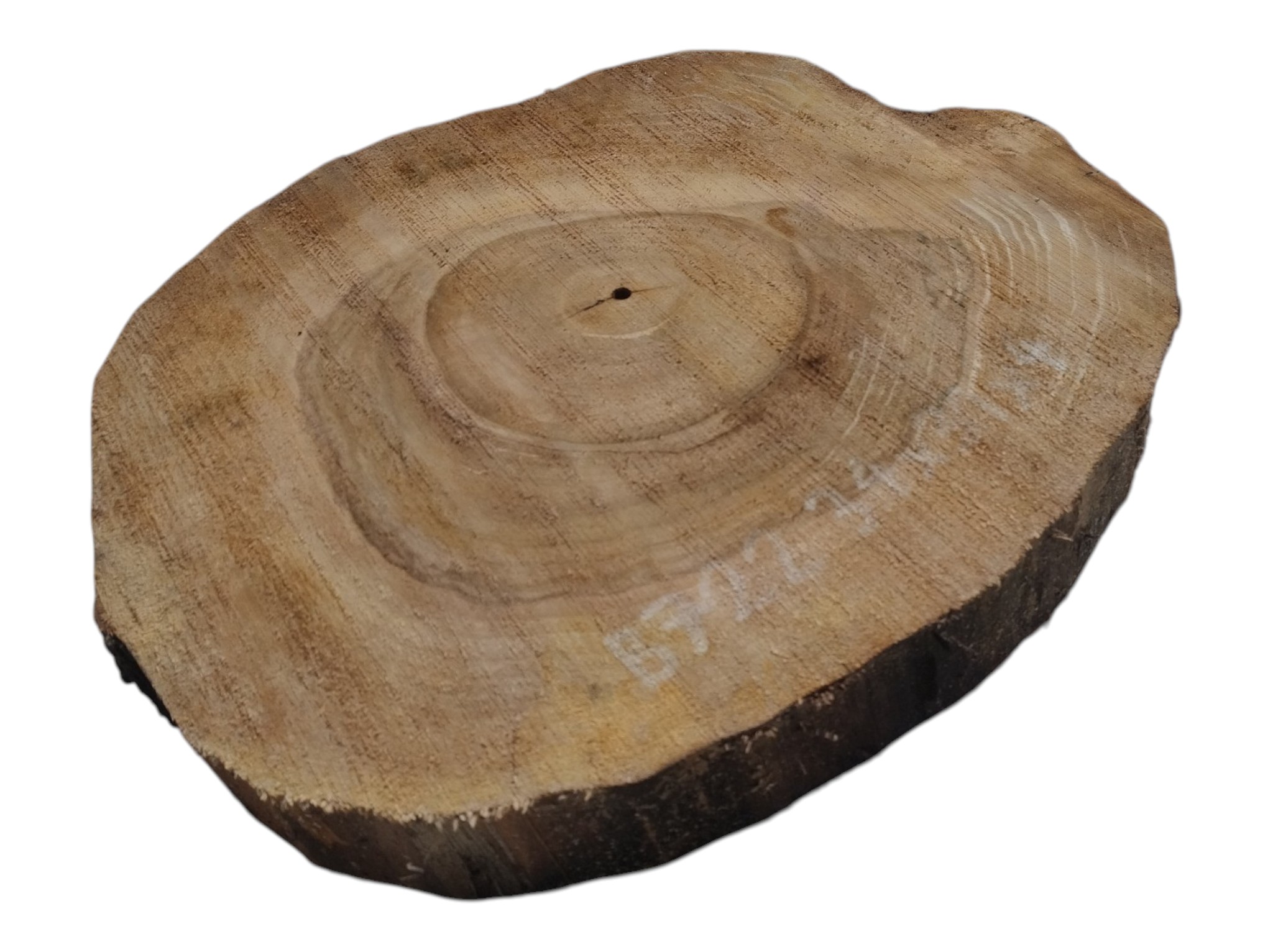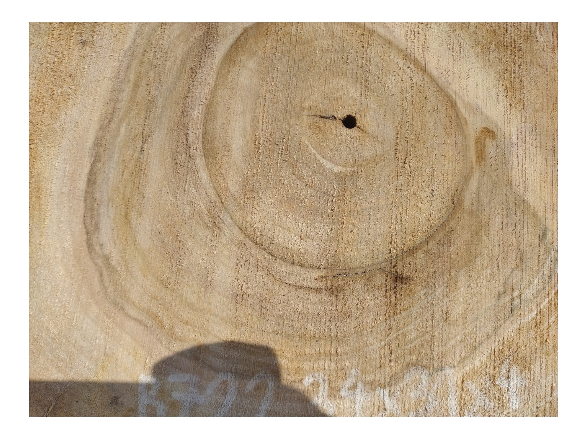 Zdjęcia robimy od razu po przecięciu, żeby jak najlepiej pokazać w jaki sposób można wyprowadzić plaster i podkreślić jego strukturę. W procesie suszenia naturalną rzeczą są pęknięcia materiału powstałe w skutek oddawania wilgoci oraz powierzchowna zmiana barwy. Zdjęcie nr 2 w galerii przedstawia stan plastra z kwietnia 2026 – wtedy została zmierzona podana wilgotność.