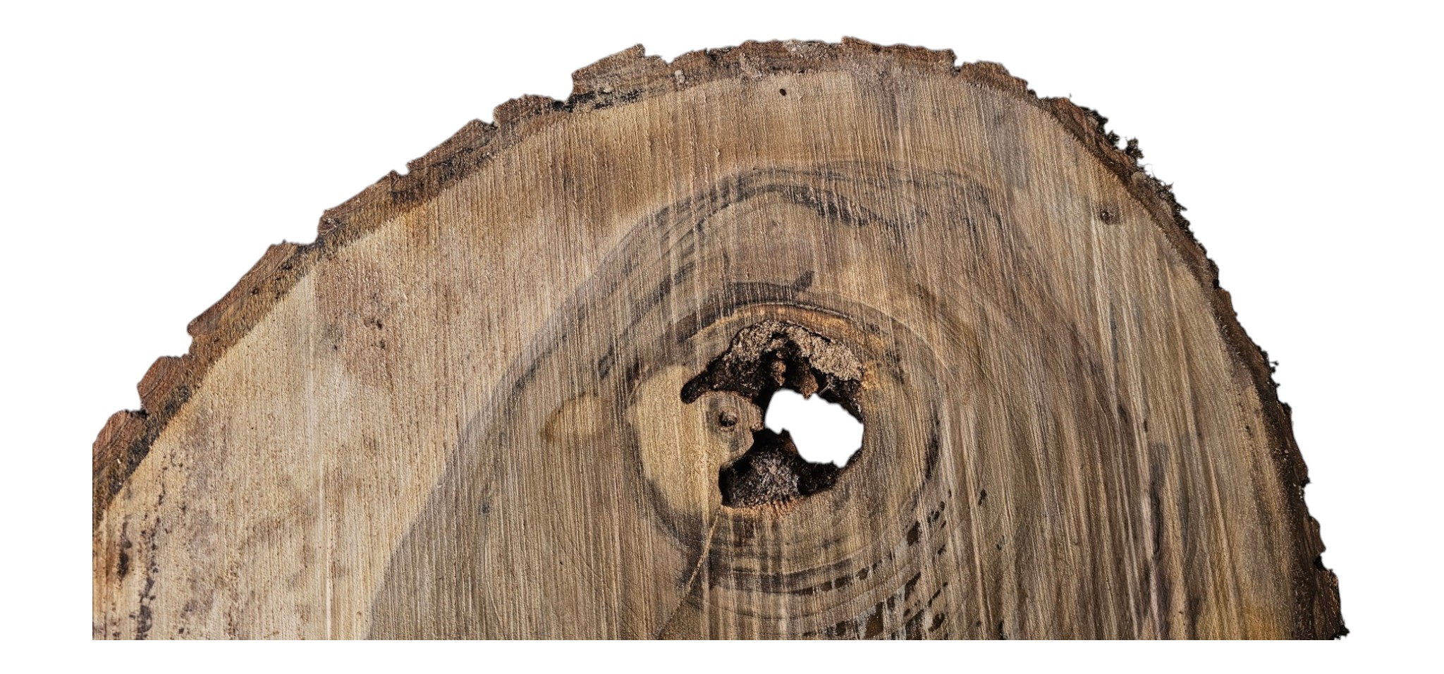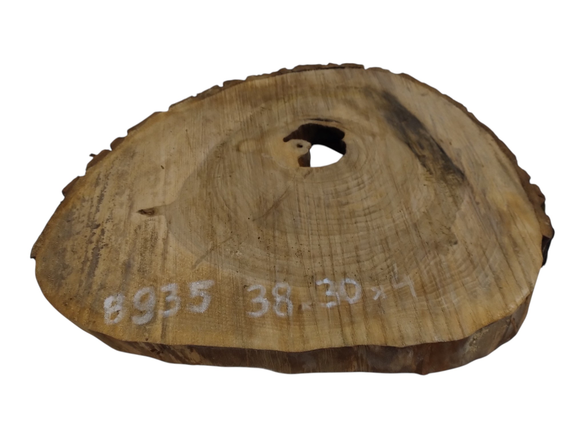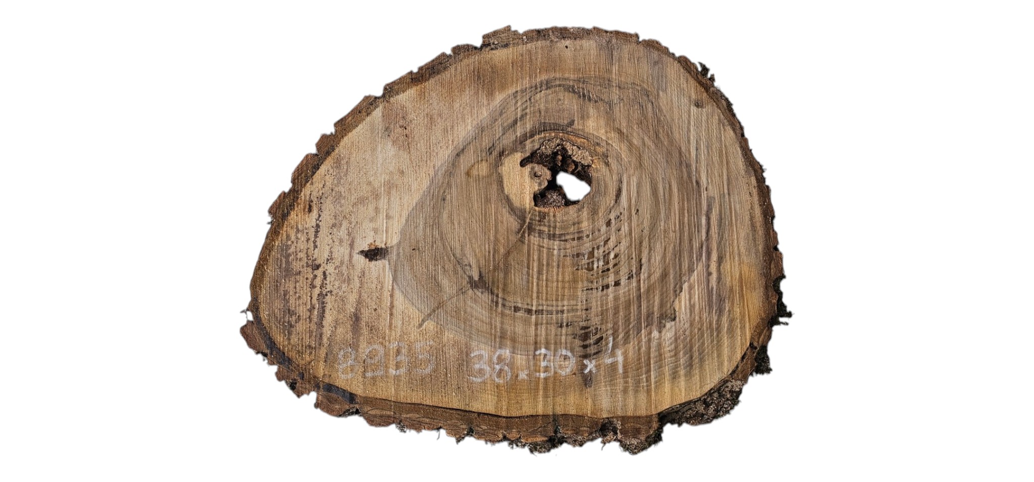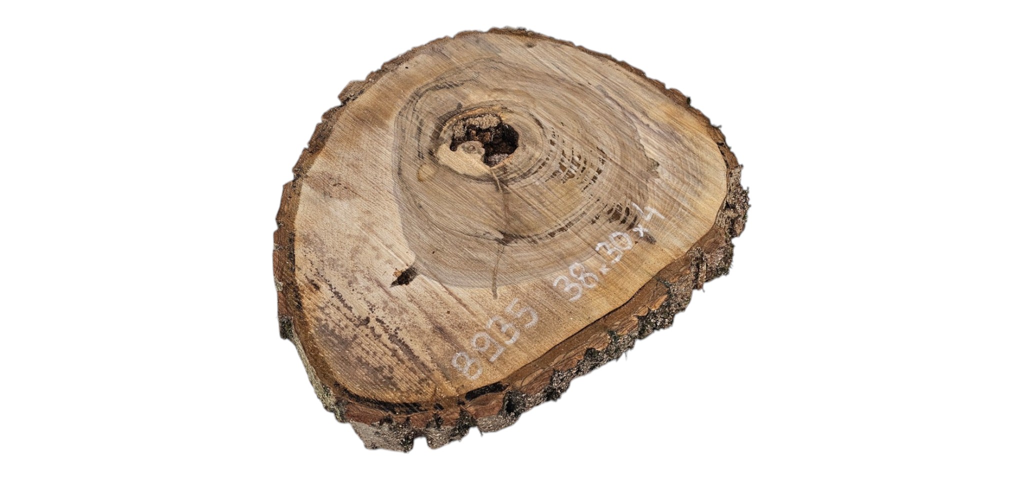 Zdjęcia robimy od razu po przecięciu, żeby jak najlepiej pokazać w jaki sposób można wyprowadzić plaster i podkreślić jego strukturę. W procesie suszenia naturalną rzeczą są pęknięcia materiału powstałe w skutek oddawania wilgoci oraz powierzchowna zmiana barwy. Zdjęcie nr 2 w galerii przedstawia stan plastra z kwietnia 2026 – wtedy została zmierzona podana wilgotność.