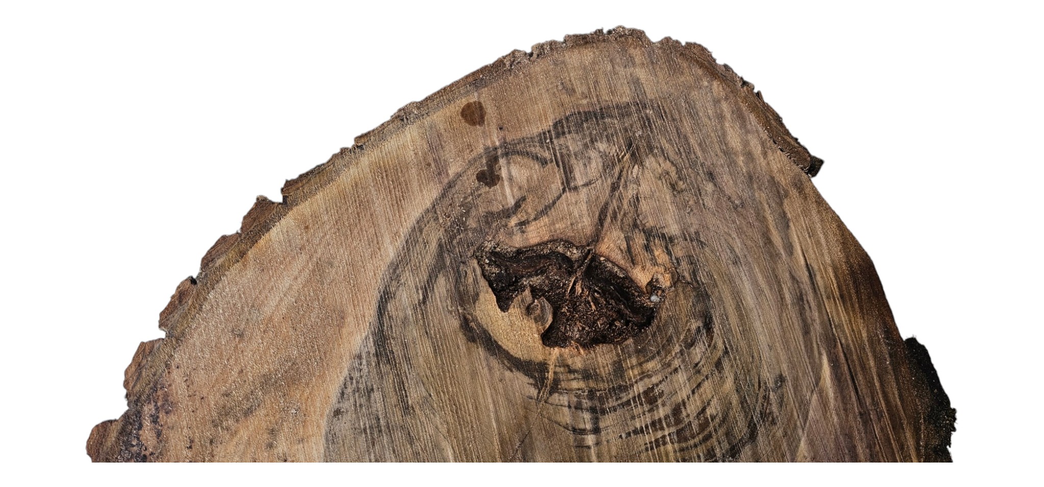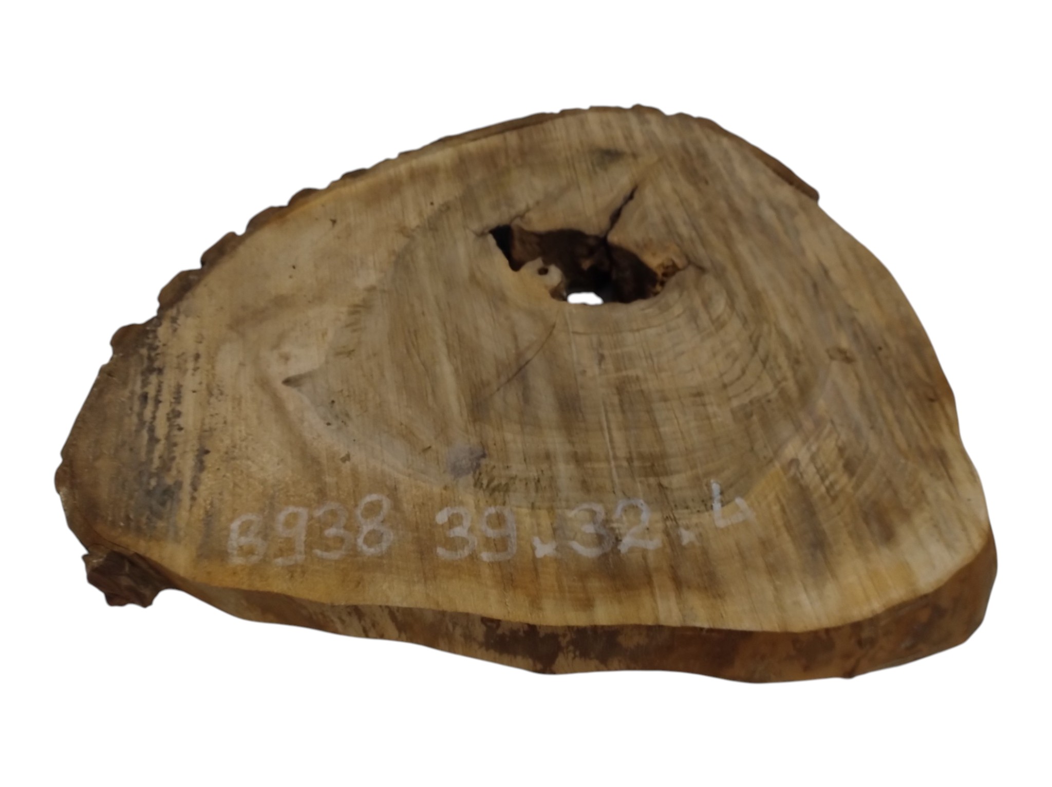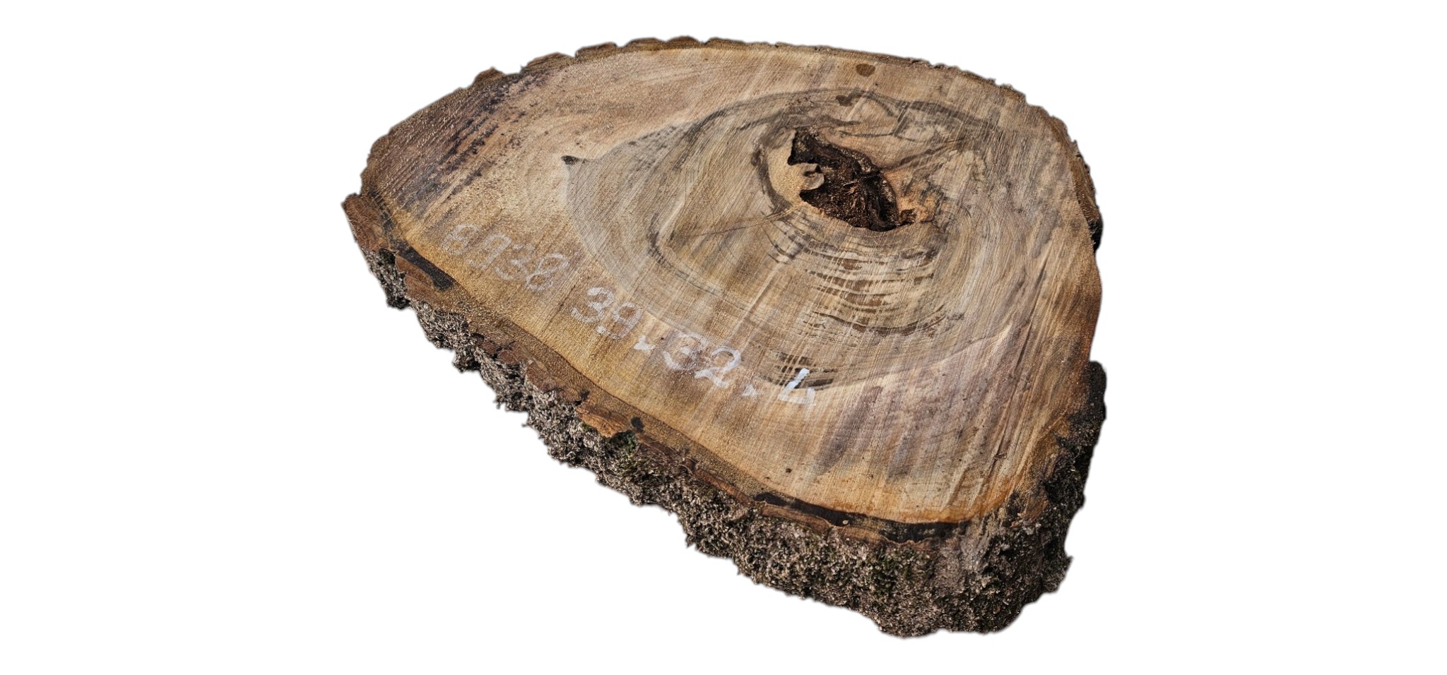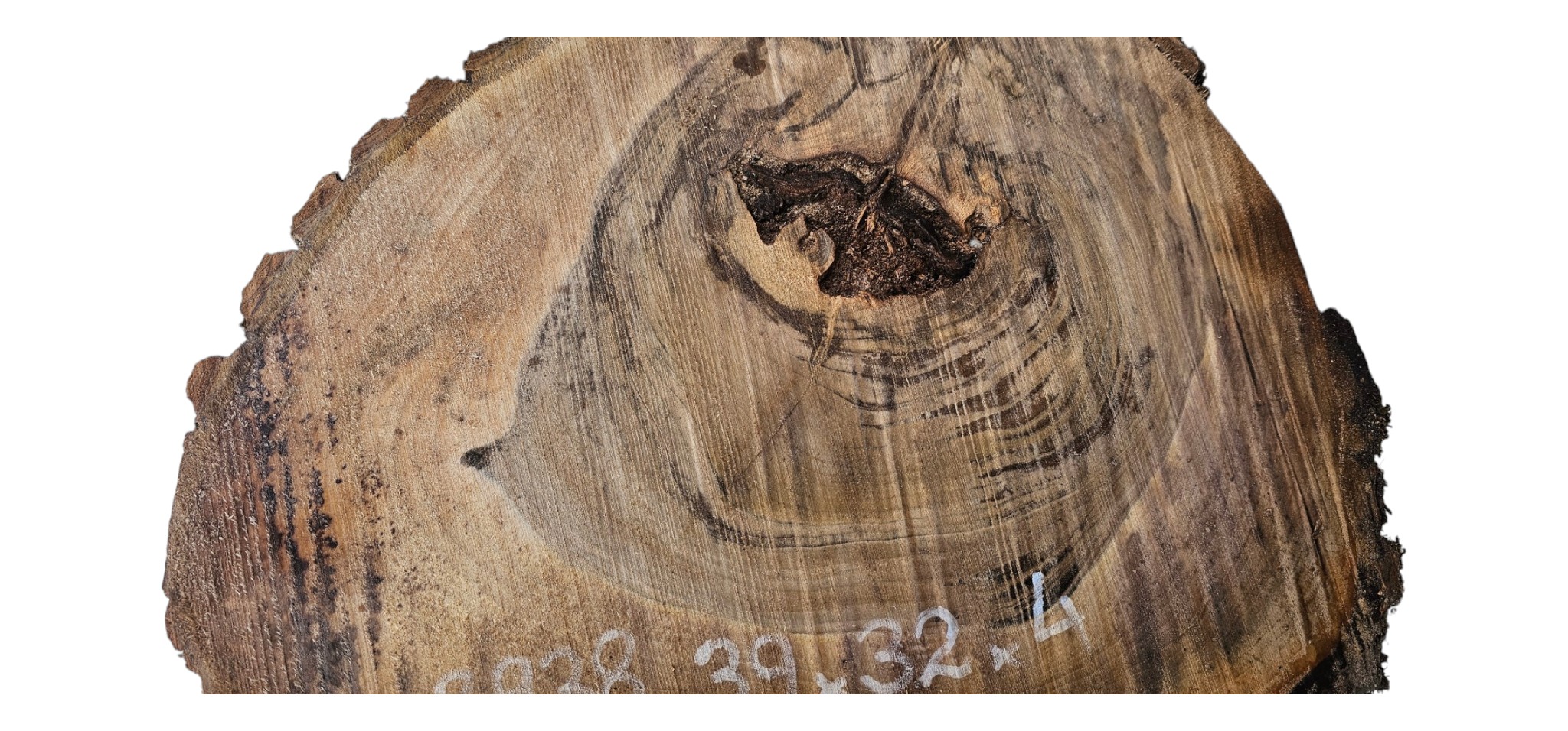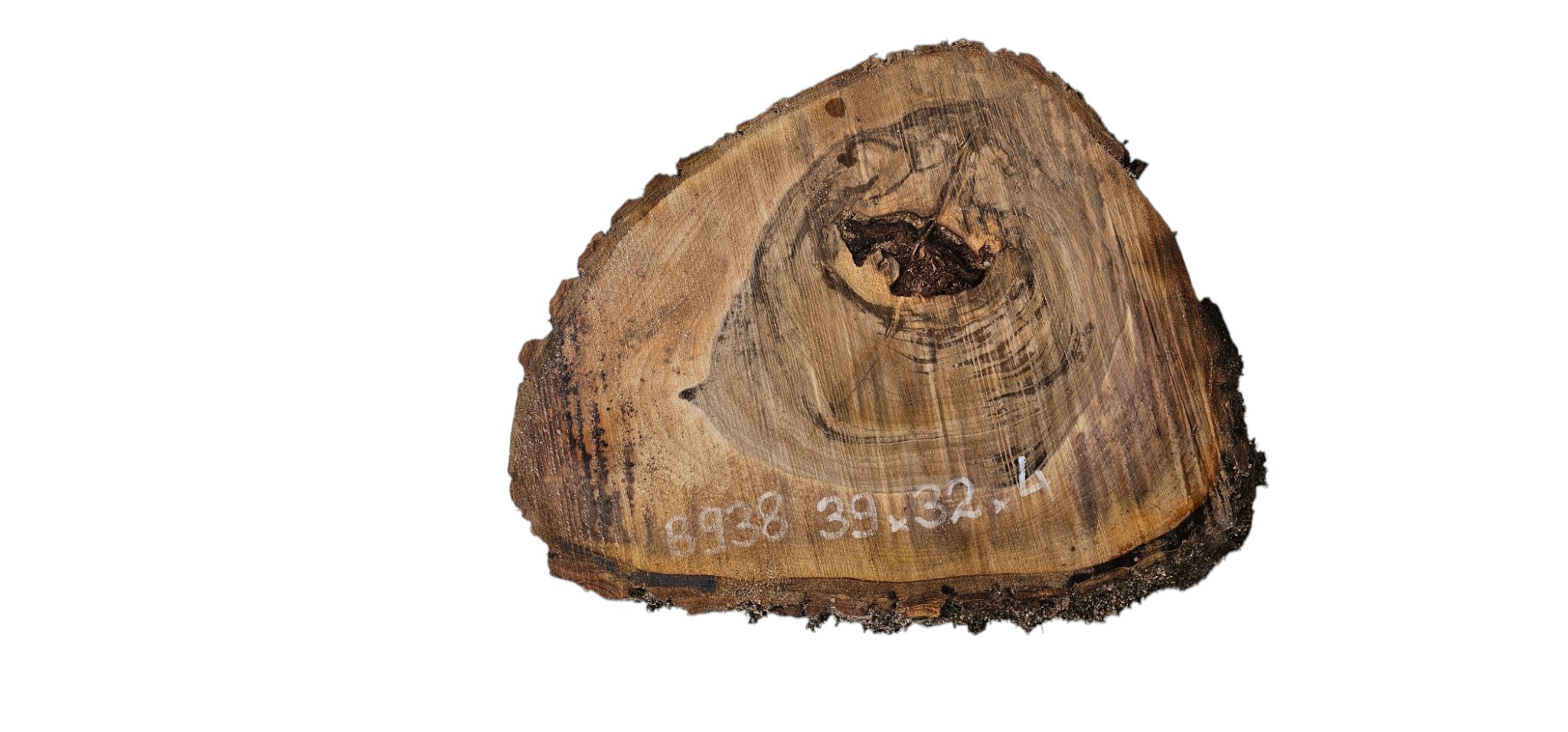 Zdjęcia robimy od razu po przecięciu, żeby jak najlepiej pokazać w jaki sposób można wyprowadzić plaster i podkreślić jego strukturę. W procesie suszenia naturalną rzeczą są pęknięcia materiału powstałe w skutek oddawania wilgoci oraz powierzchowna zmiana barwy. Zdjęcie nr 2 w galerii przedstawia stan plastra z kwietnia 2026 – wtedy została zmierzona podana wilgotność.