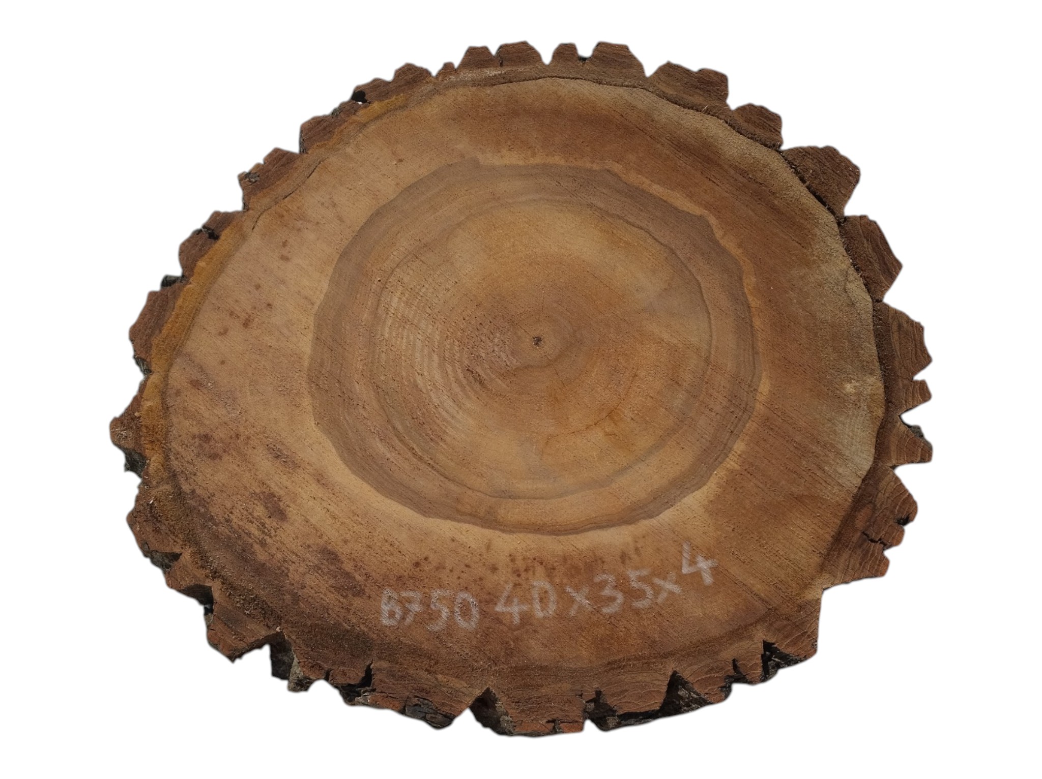 Zdjęcia robimy od razu po przecięciu, żeby jak najlepiej pokazać w jaki sposób można wyprowadzić plaster i podkreślić jego strukturę. W procesie suszenia naturalną rzeczą są pęknięcia materiału powstałe w skutek oddawania wilgoci oraz powierzchowna zmiana barwy. Zdjęcie nr 2 w galerii przedstawia stan plastra z kwietnia 2026 – wtedy została zmierzona podana wilgotność.