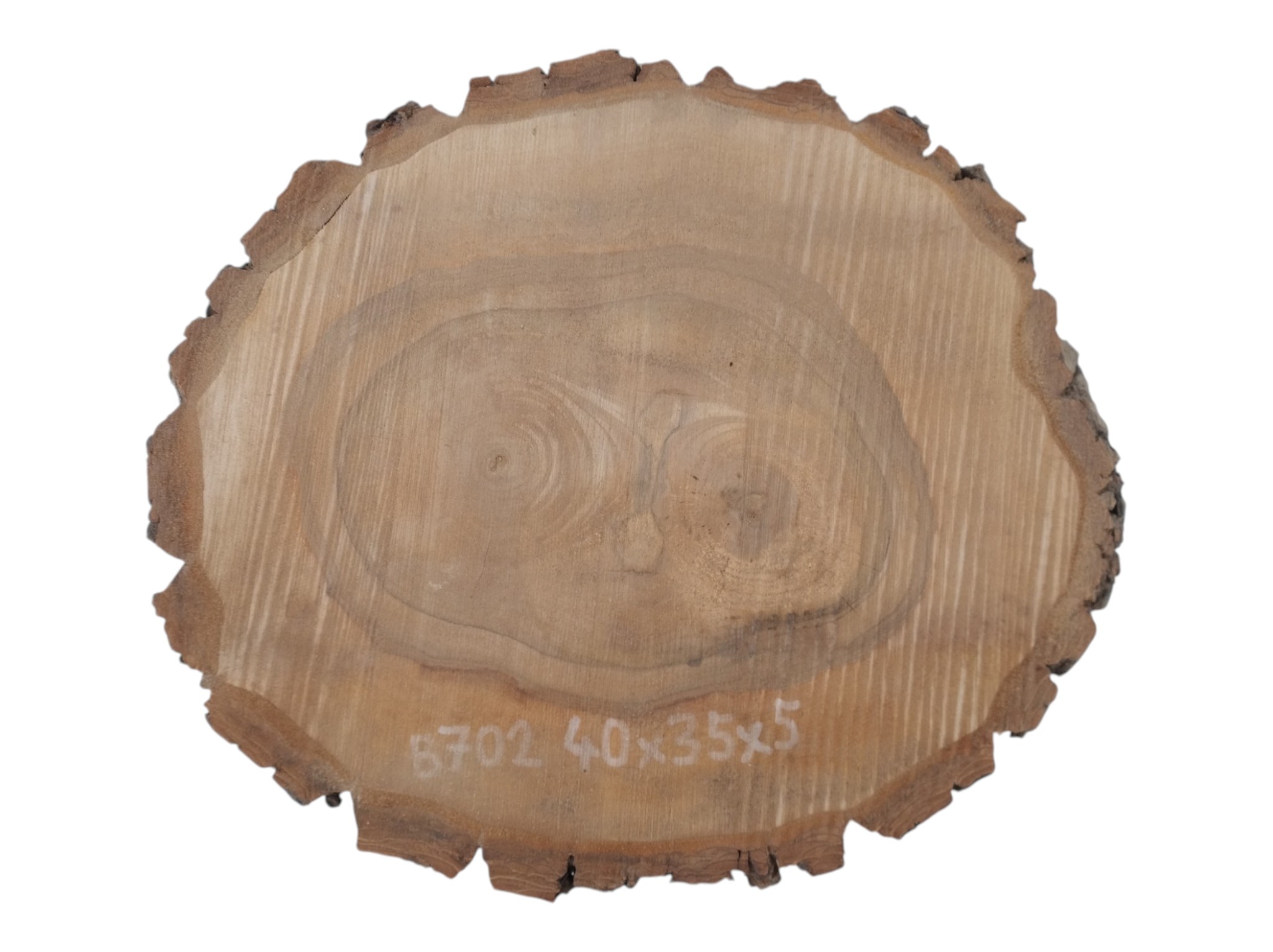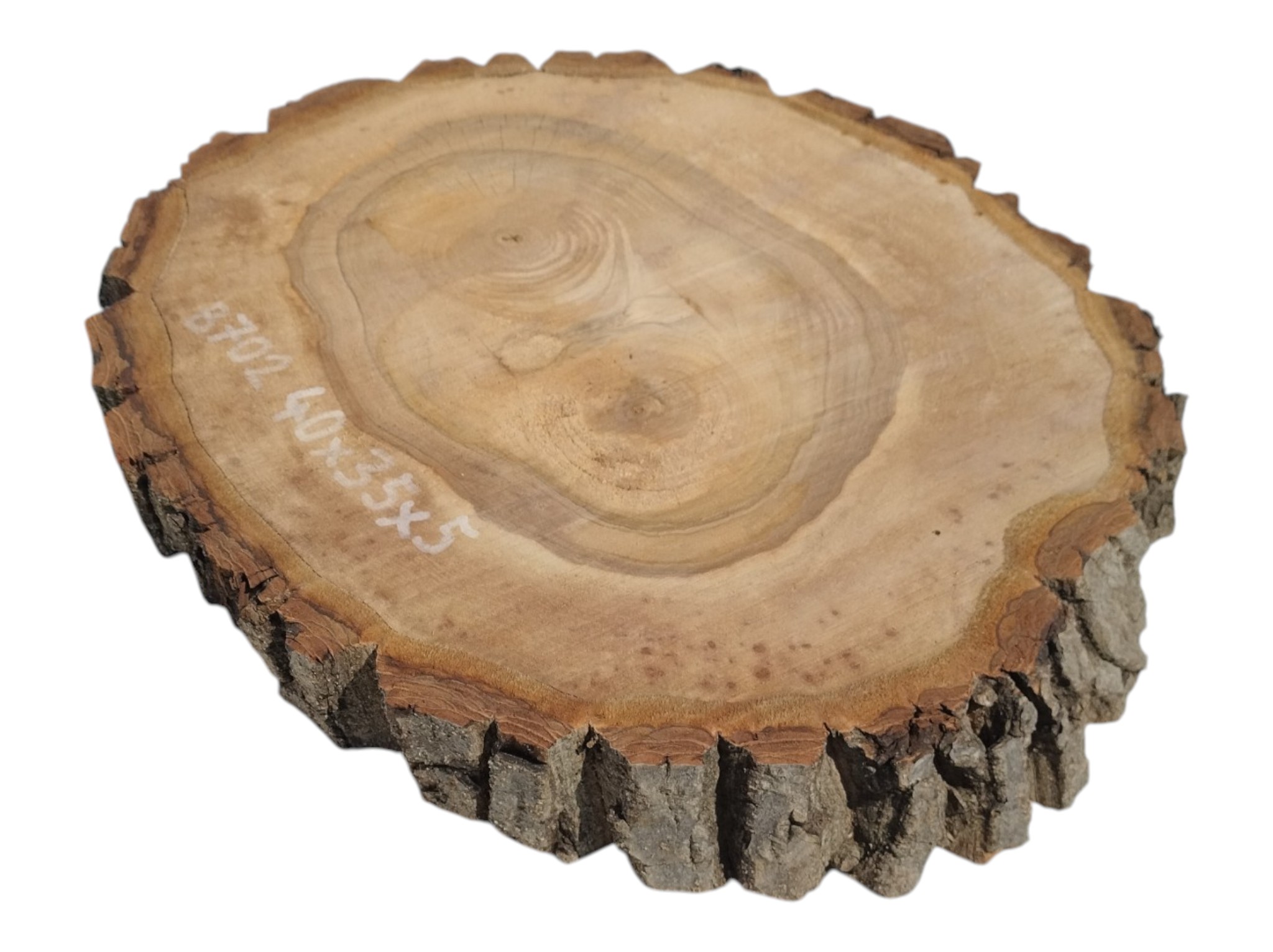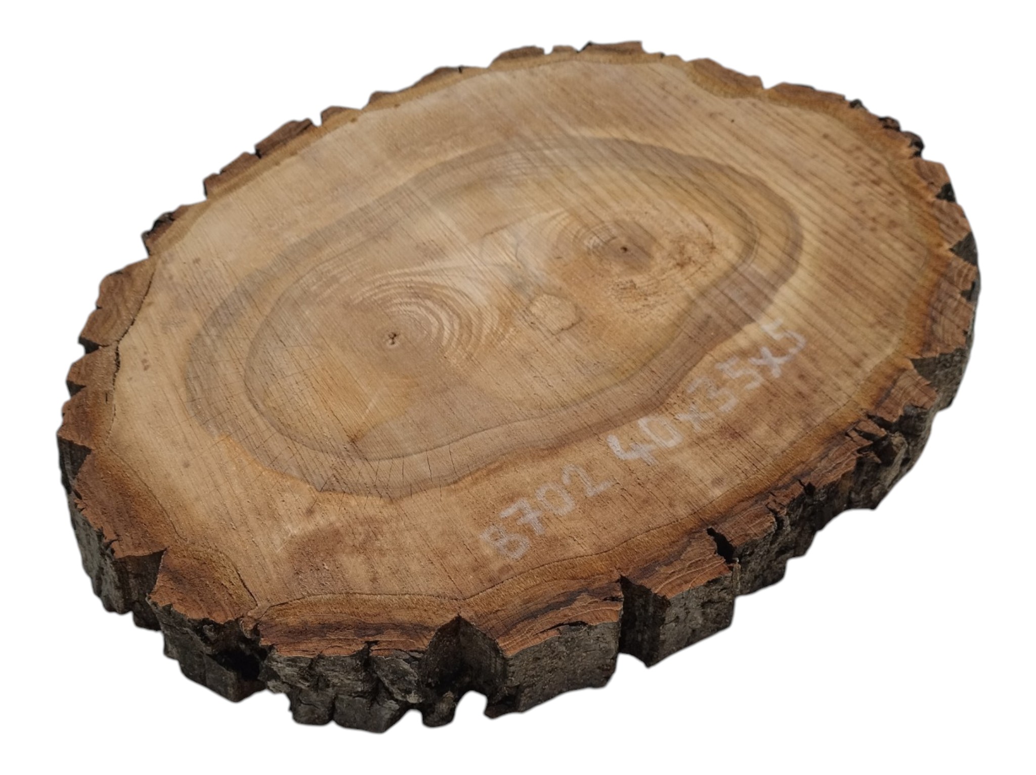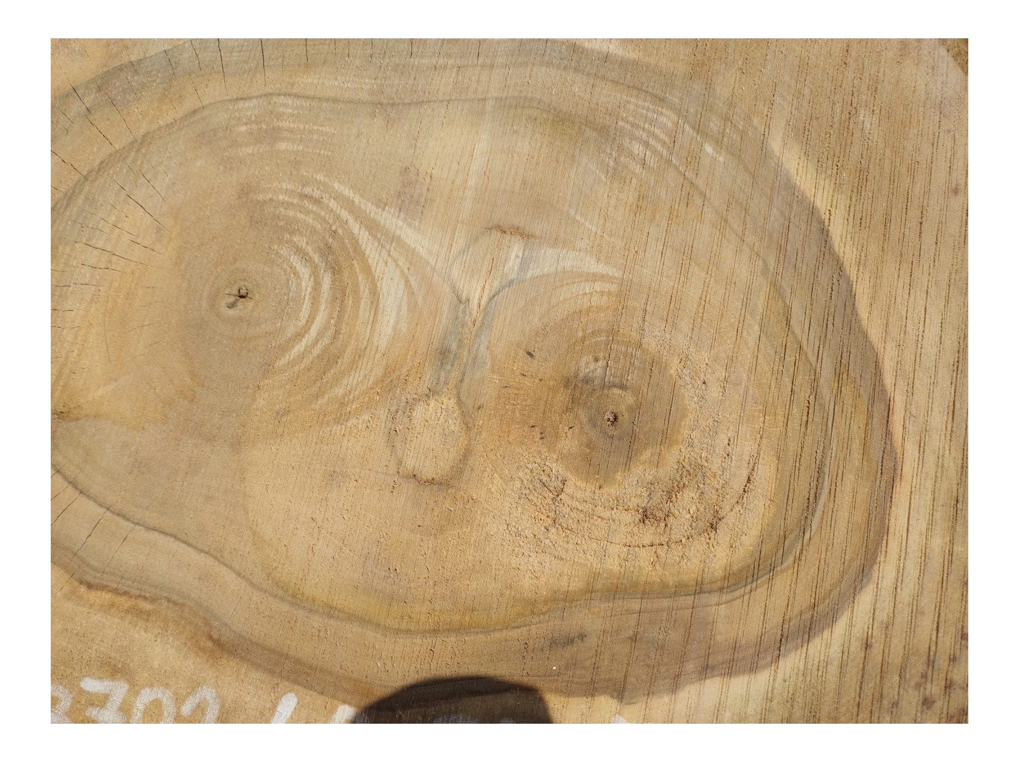 Zdjęcia robimy od razu po przecięciu, żeby jak najlepiej pokazać w jaki sposób można wyprowadzić plaster i podkreślić jego strukturę. W procesie suszenia naturalną rzeczą są pęknięcia materiału powstałe w skutek oddawania wilgoci oraz powierzchowna zmiana barwy. Zdjęcie nr 2 w galerii przedstawia stan plastra z kwietnia 2026 – wtedy została zmierzona podana wilgotność.