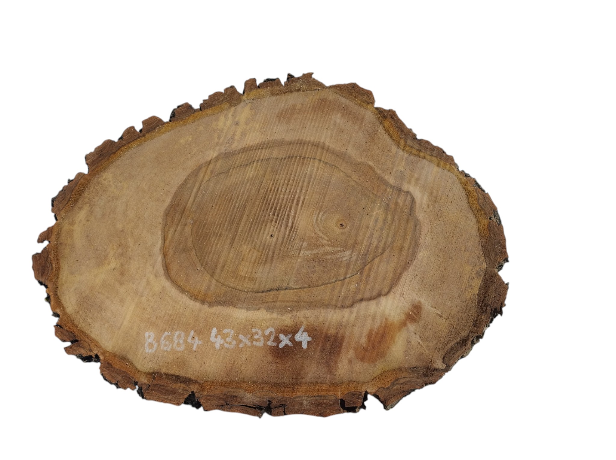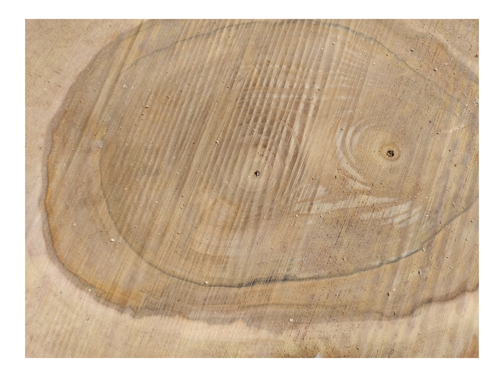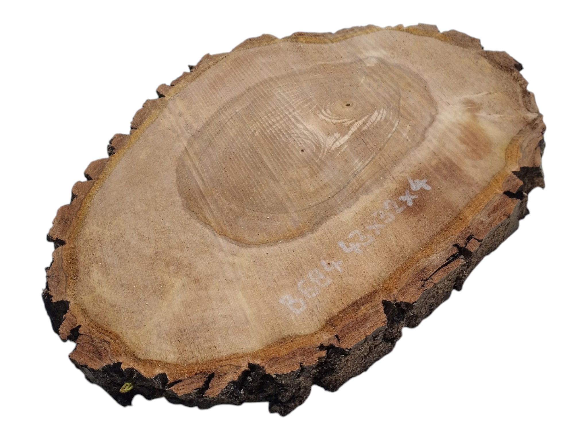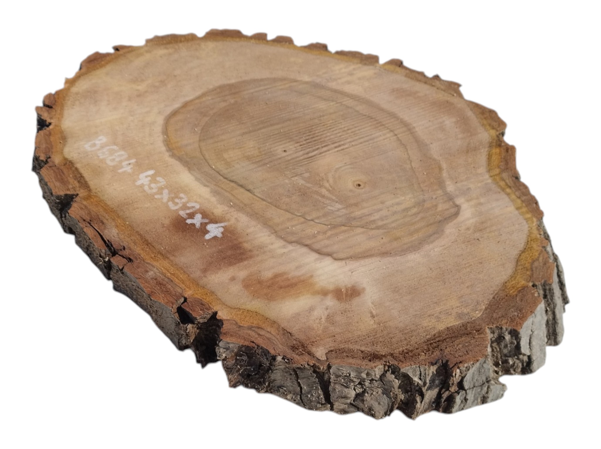 Zdjęcia robimy od razu po przecięciu, żeby jak najlepiej pokazać w jaki sposób można wyprowadzić plaster i podkreślić jego strukturę. W procesie suszenia naturalną rzeczą są pęknięcia materiału powstałe w skutek oddawania wilgoci oraz powierzchowna zmiana barwy. Zdjęcie nr 2 w galerii przedstawia stan plastra z kwietnia 2026 – wtedy została zmierzona podana wilgotność.