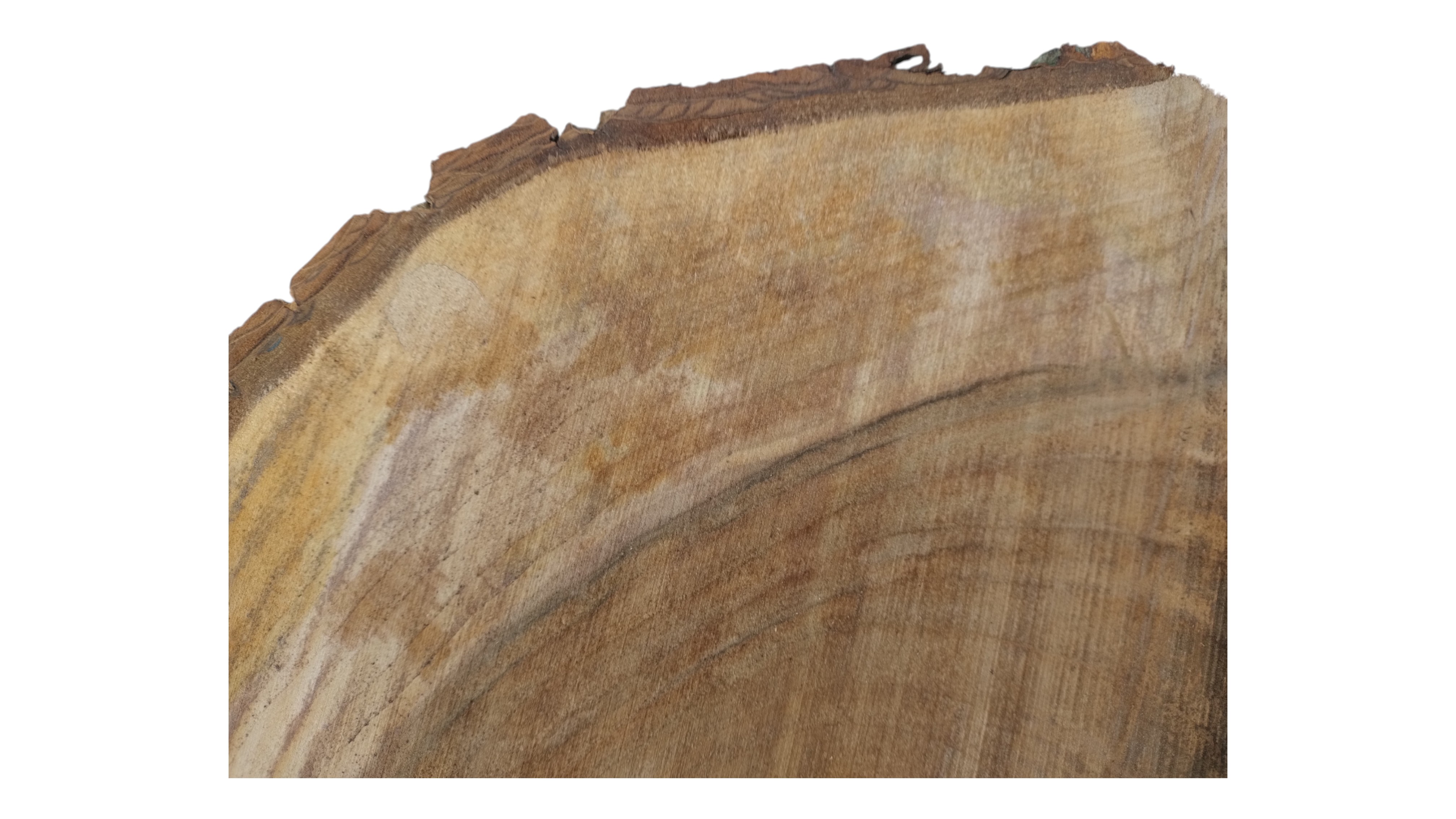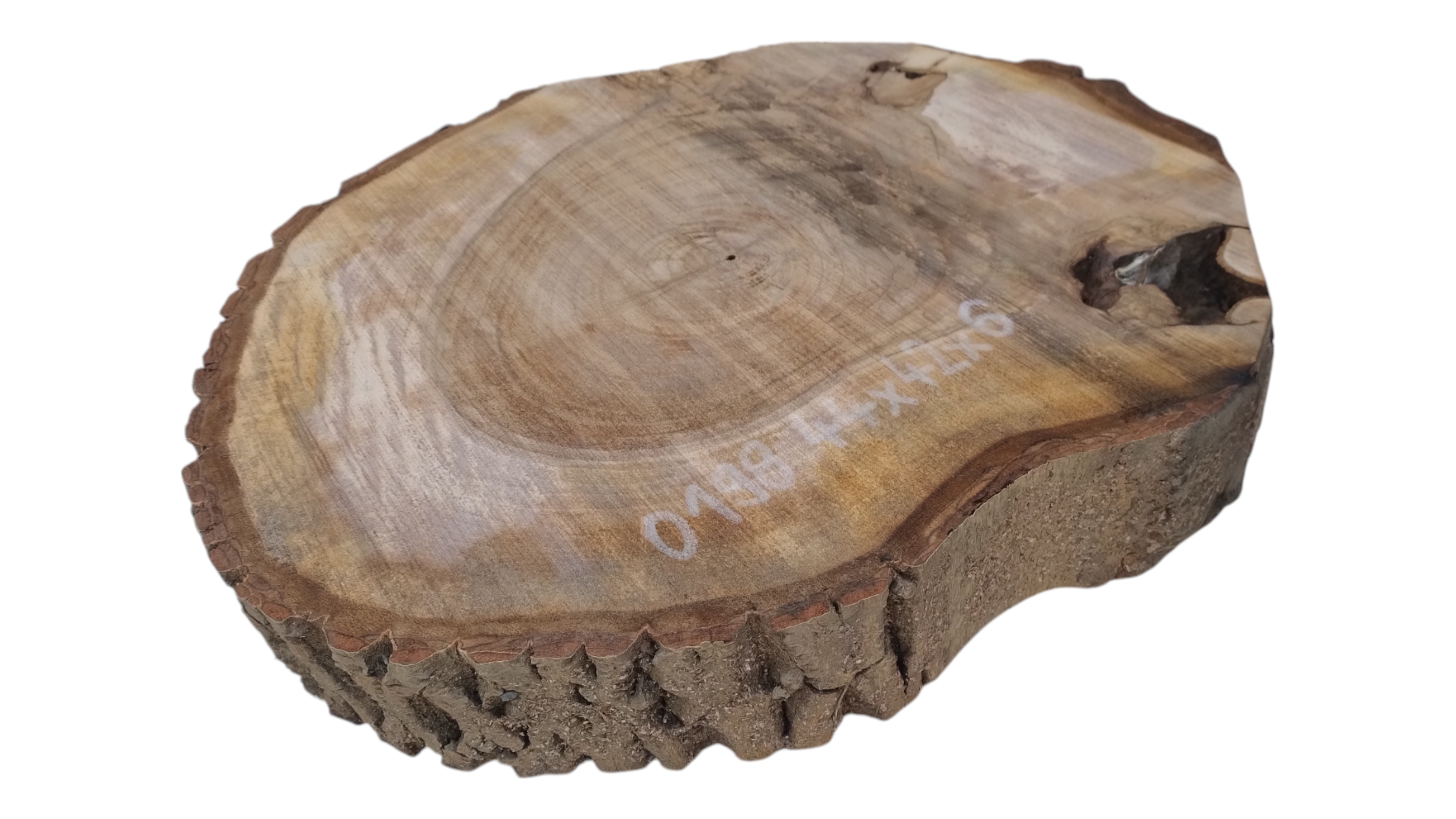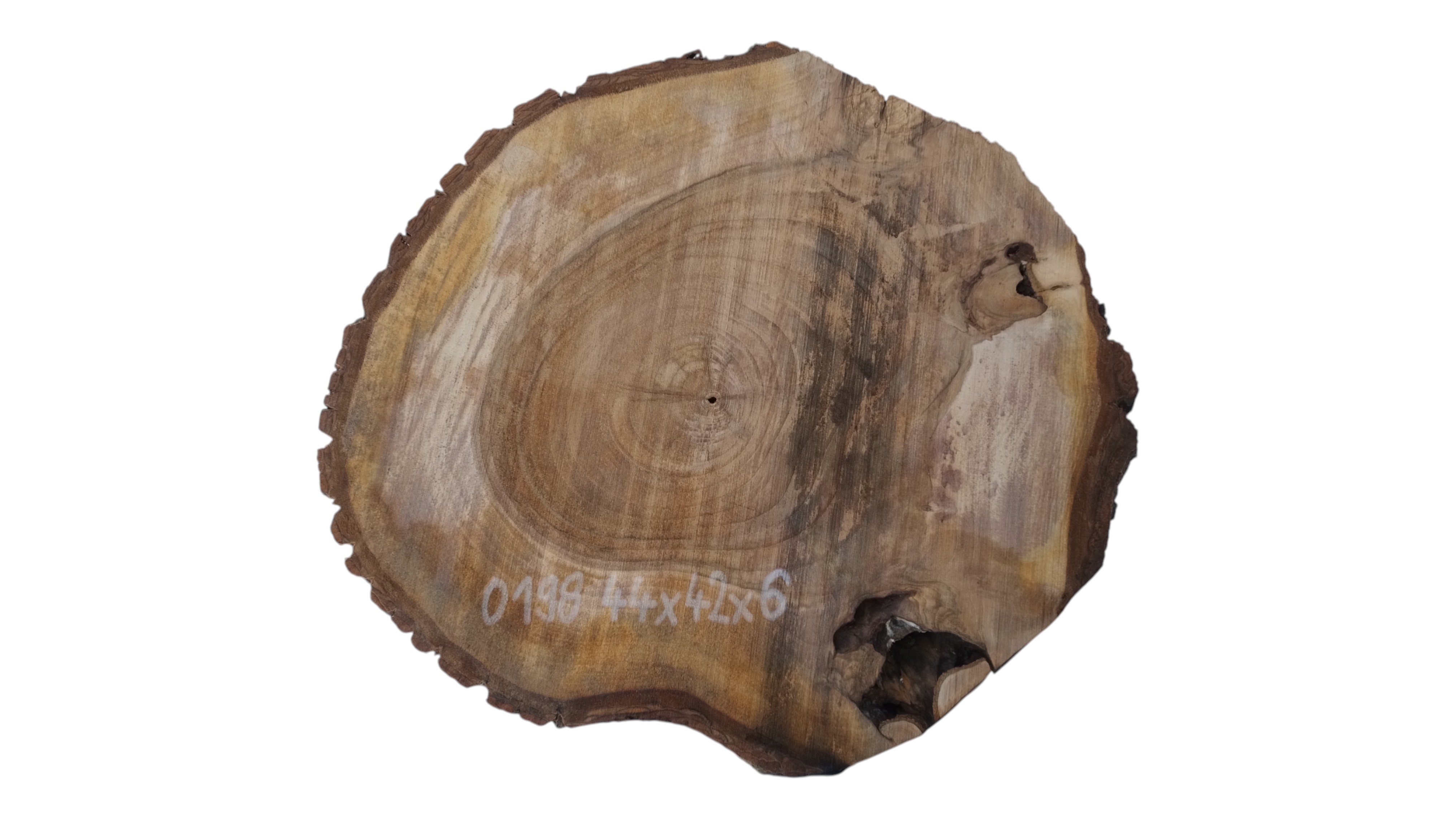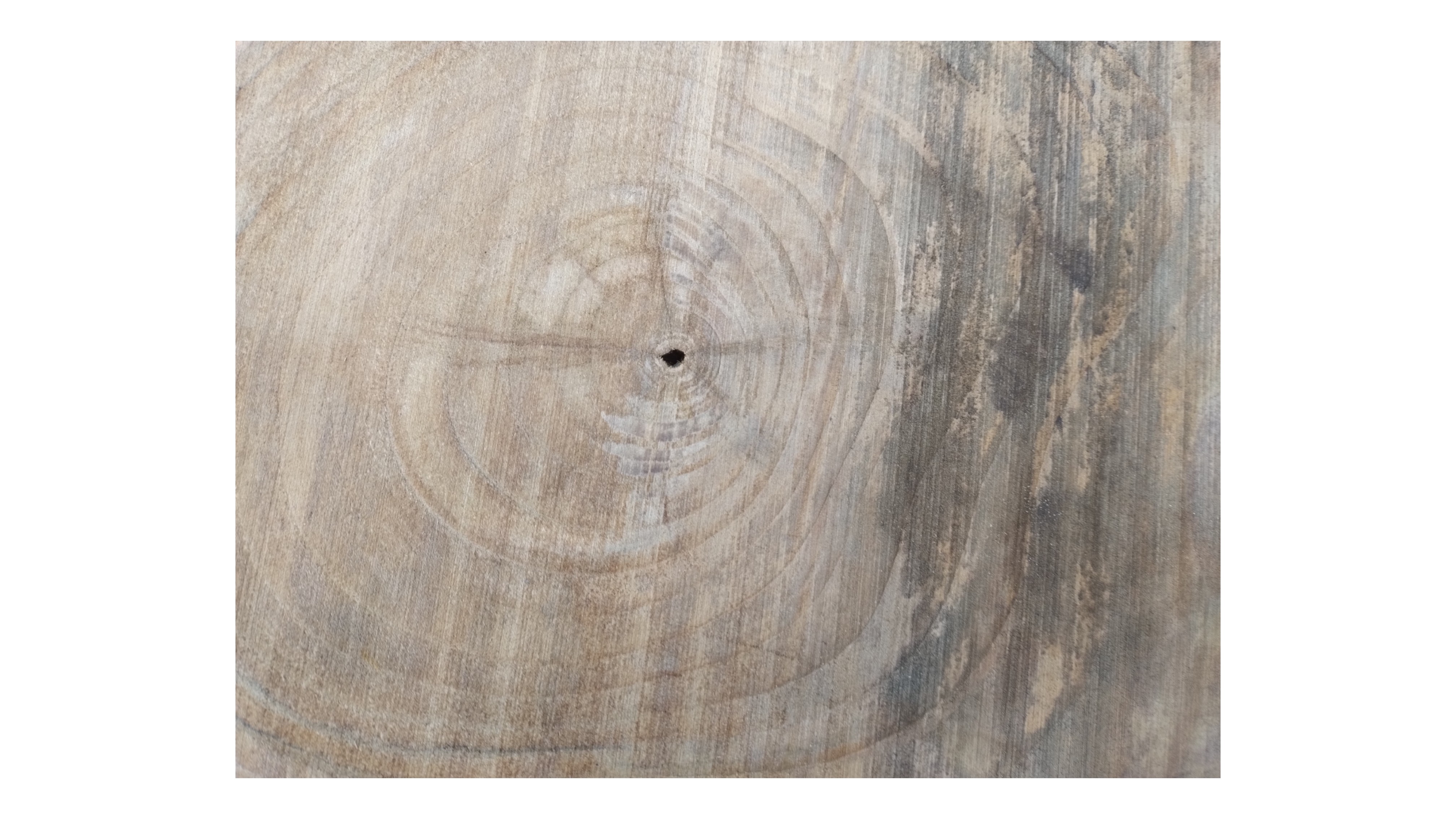 Zdjęcia robimy od razu po przecięciu, żeby jak najlepiej pokazać w jaki sposób można wyprowadzić plaster i podkreślić jego strukturę. W procesie suszenia naturalną rzeczą są pęknięcia materiału powstałe w skutek oddawania wilgoci oraz powierzchowna zmiana barwy. Zdjęcie nr 2 w galerii przedstawia stan plastra z maja 2025 – wtedy została zmierzona podana wilgotność.