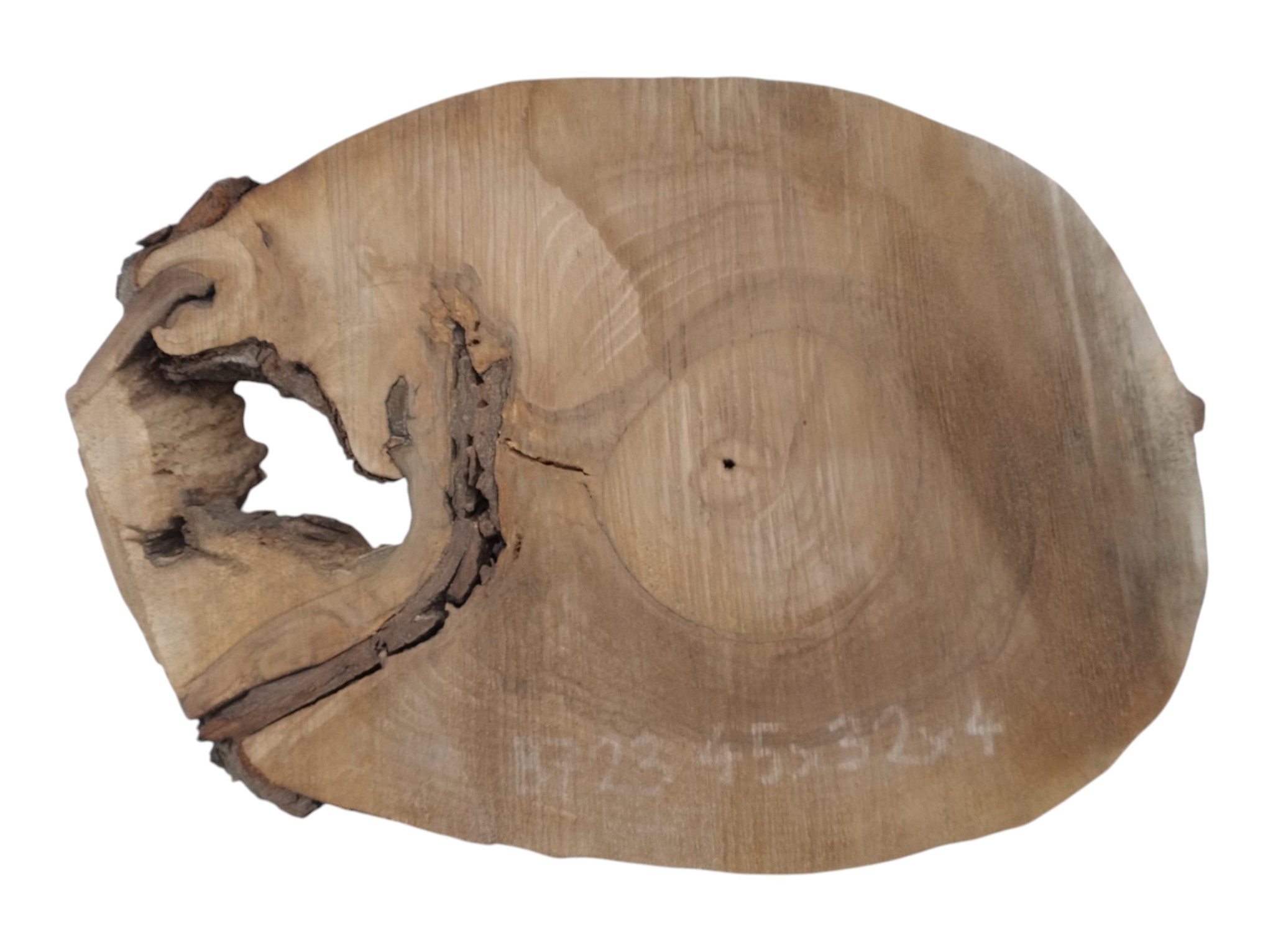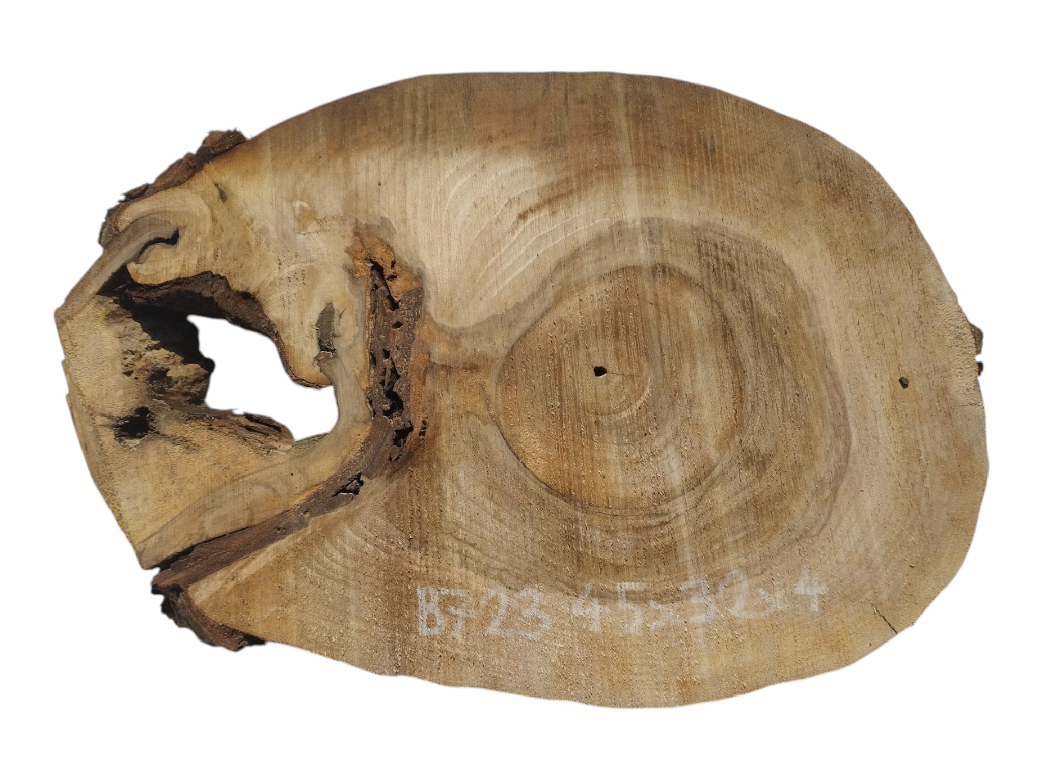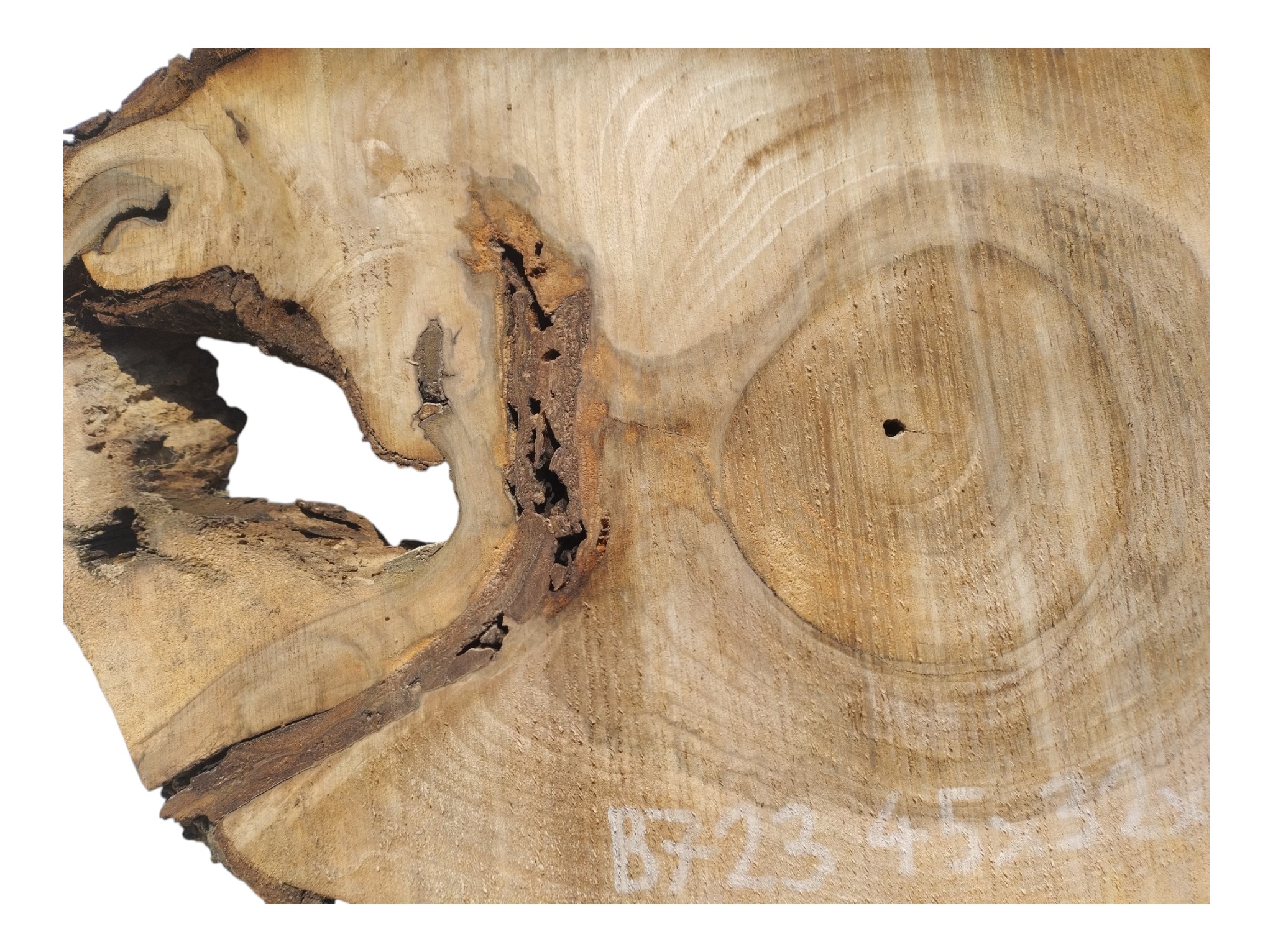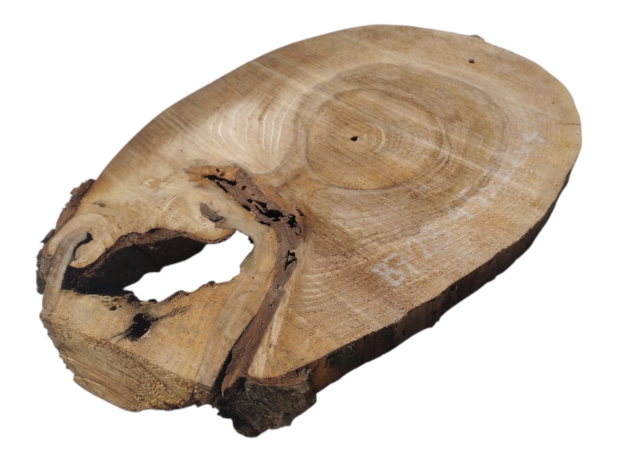 Zdjęcia robimy od razu po przecięciu, żeby jak najlepiej pokazać w jaki sposób można wyprowadzić plaster i podkreślić jego strukturę. W procesie suszenia naturalną rzeczą są pęknięcia materiału powstałe w skutek oddawania wilgoci oraz powierzchowna zmiana barwy. Zdjęcie nr 2 w galerii przedstawia stan plastra z kwietnia 2026 – wtedy została zmierzona podana wilgotność.