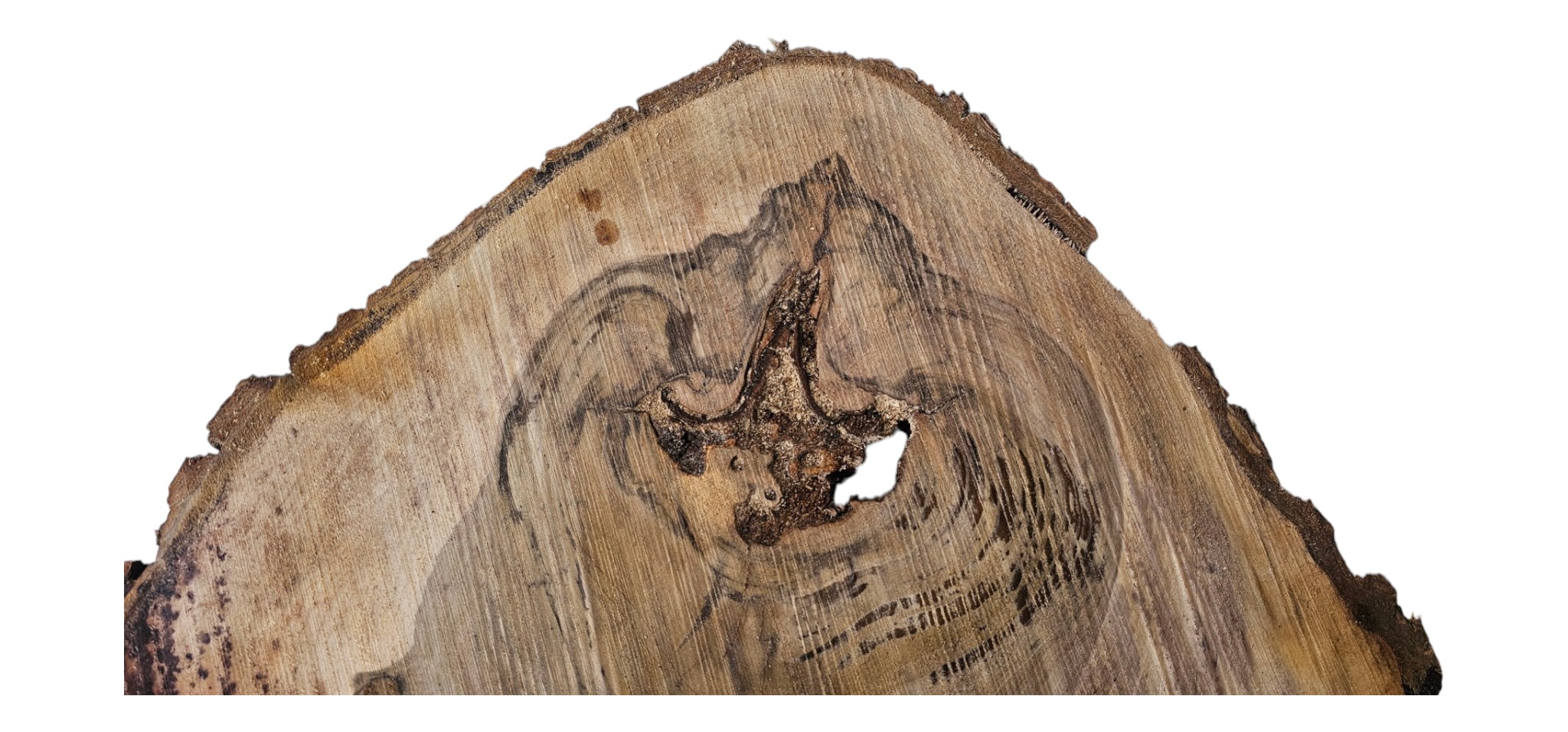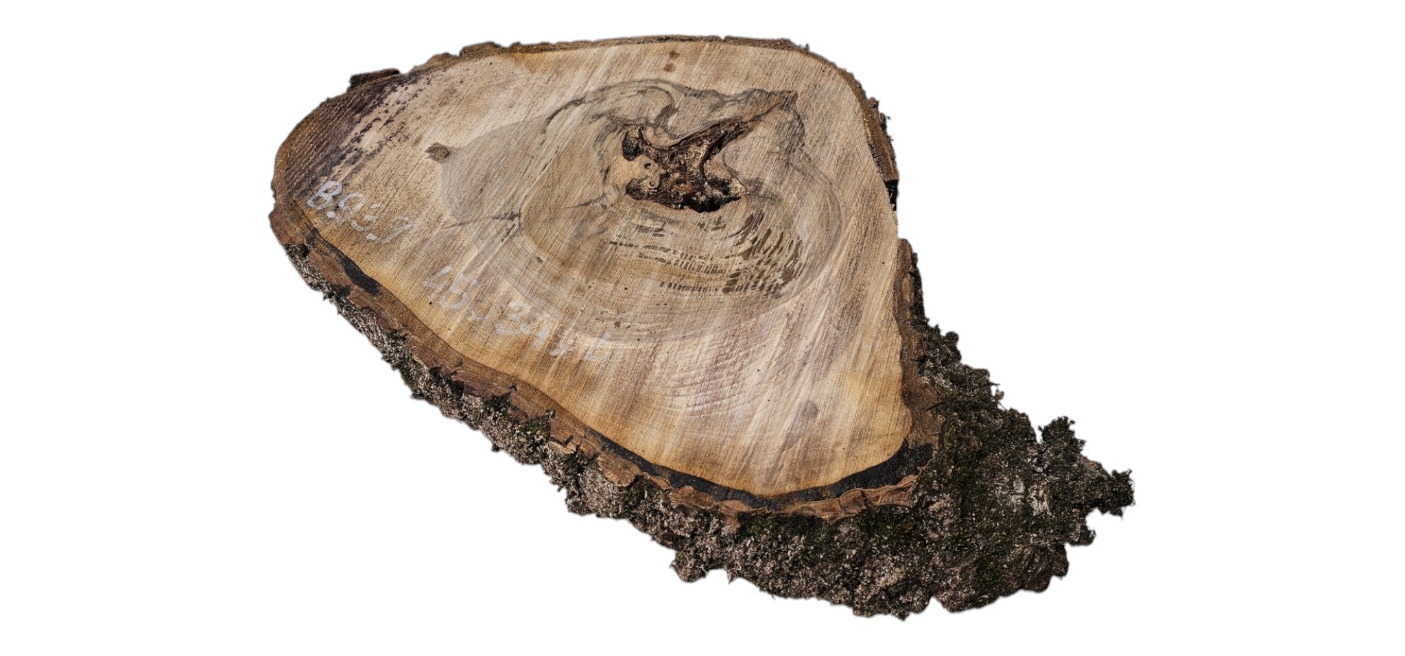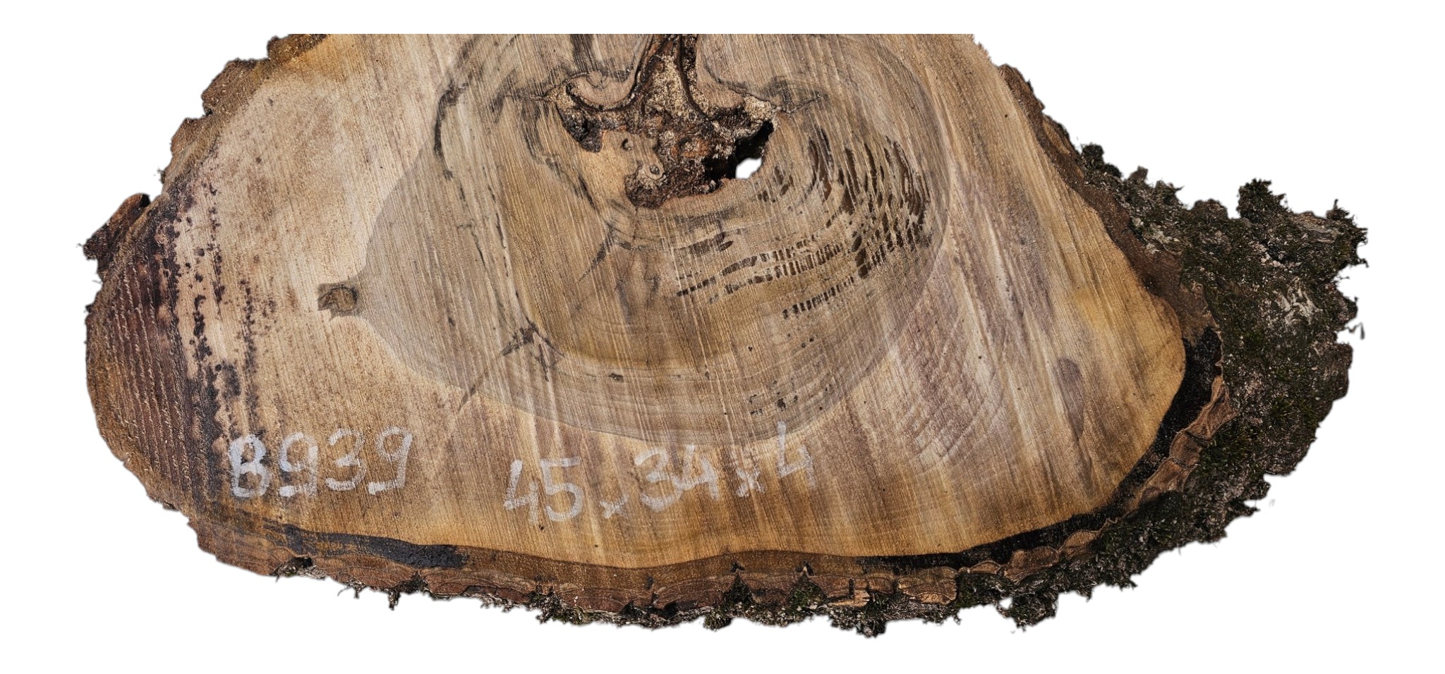 Zdjęcia robimy od razu po przecięciu, żeby jak najlepiej pokazać w jaki sposób można wyprowadzić plaster i podkreślić jego strukturę. W procesie suszenia naturalną rzeczą są pęknięcia materiału powstałe w skutek oddawania wilgoci oraz powierzchowna zmiana barwy. Zdjęcie nr 2 w galerii przedstawia stan plastra z kwietnia 2026 – wtedy została zmierzona podana wilgotność.