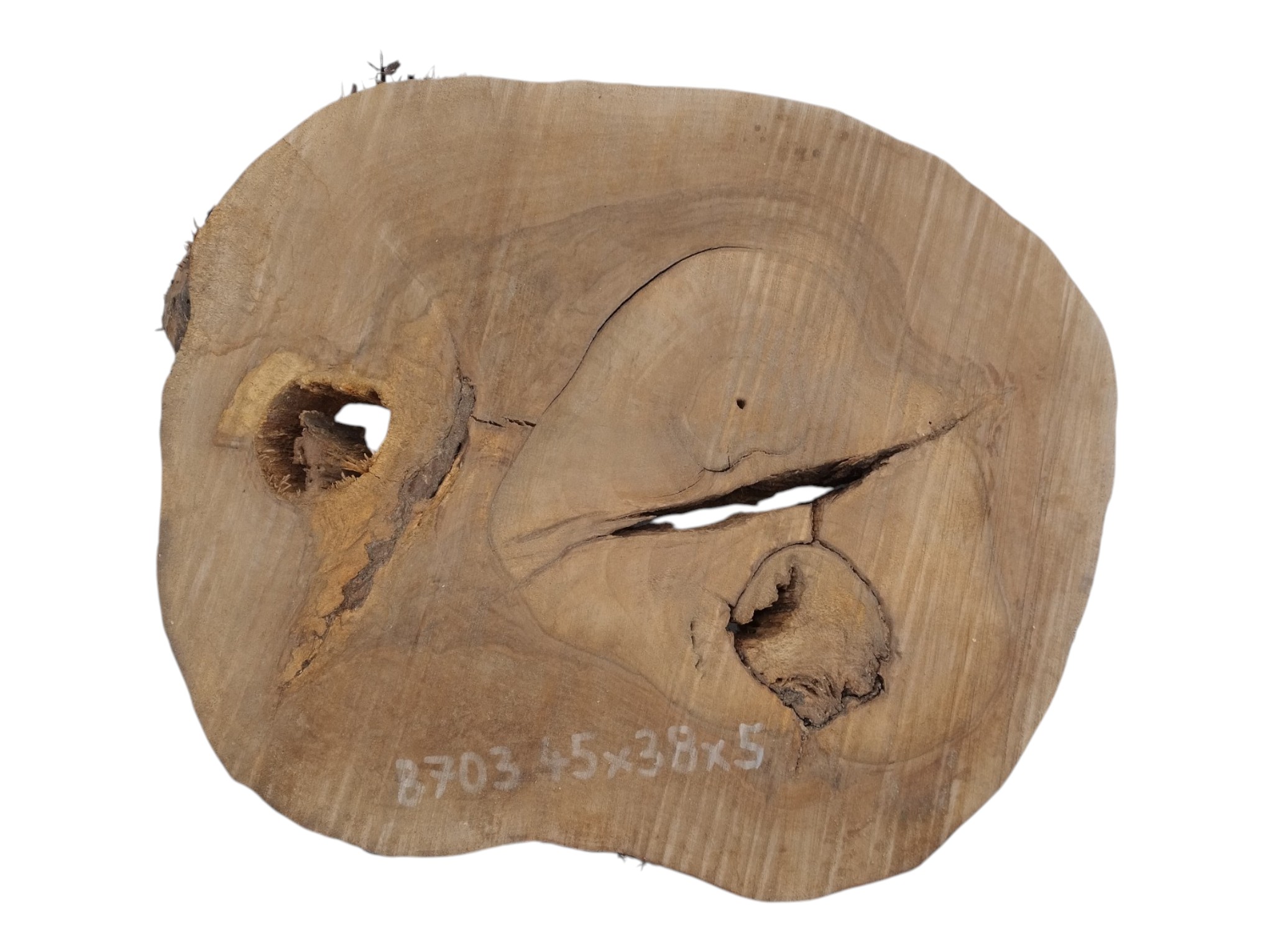 Zdjęcia robimy od razu po przecięciu, żeby jak najlepiej pokazać w jaki sposób można wyprowadzić plaster i podkreślić jego strukturę. W procesie suszenia naturalną rzeczą są pęknięcia materiału powstałe w skutek oddawania wilgoci oraz powierzchowna zmiana barwy. Zdjęcie nr 2 w galerii przedstawia stan plastra z kwietnia 2026 – wtedy została zmierzona podana wilgotność.