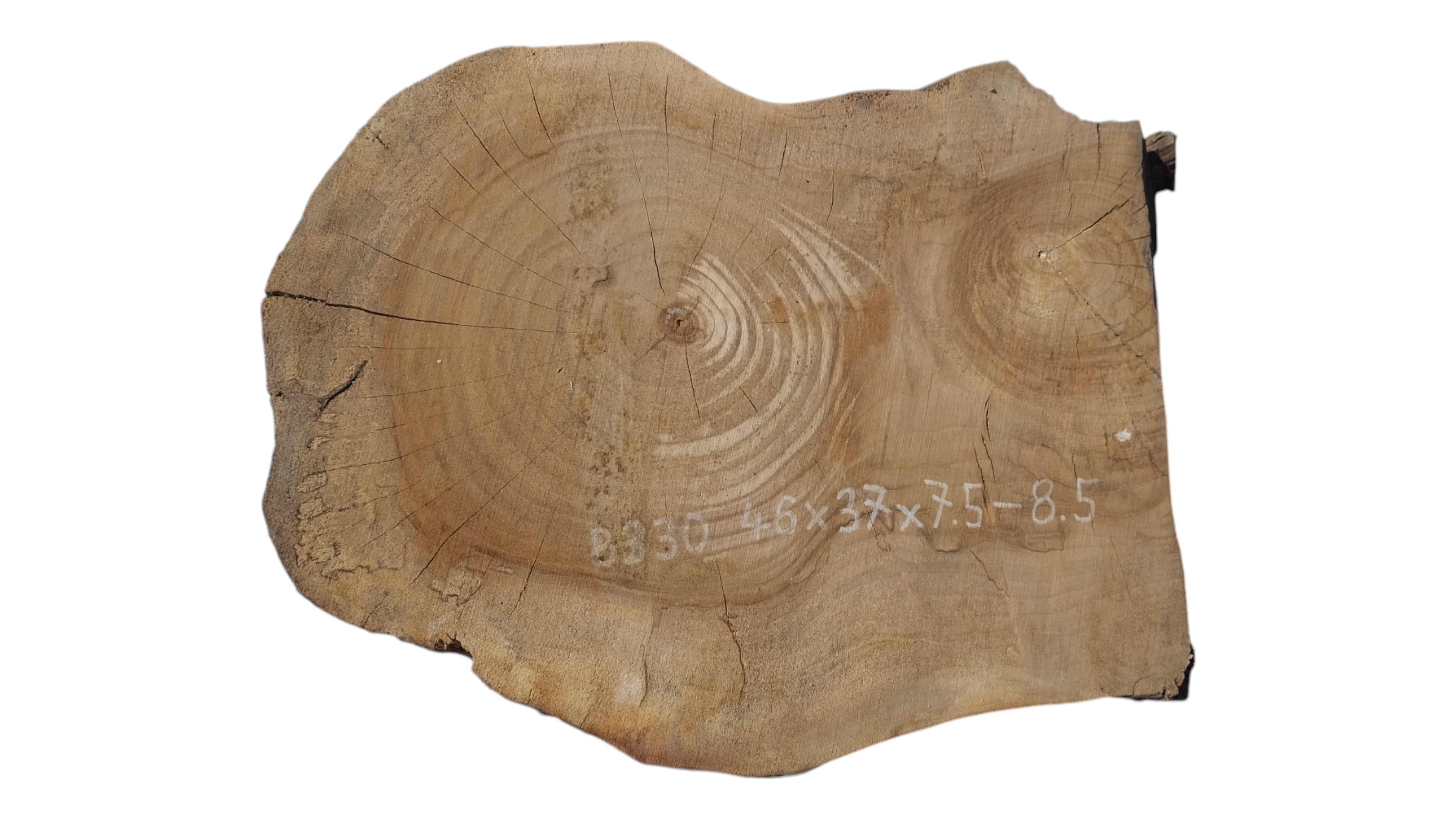 Zdjęcia robimy od razu po przecięciu, żeby jak najlepiej pokazać w jaki sposób można wyprowadzić plaster i podkreślić jego strukturę. W procesie suszenia naturalną rzeczą są pęknięcia materiału powstałe w skutek oddawania wilgoci oraz powierzchowna zmiana barwy. Zdjęcie nr 2 w galerii przedstawia stan plastra z kwietnia 2025 – wtedy została zmierzona podana wilgotność.