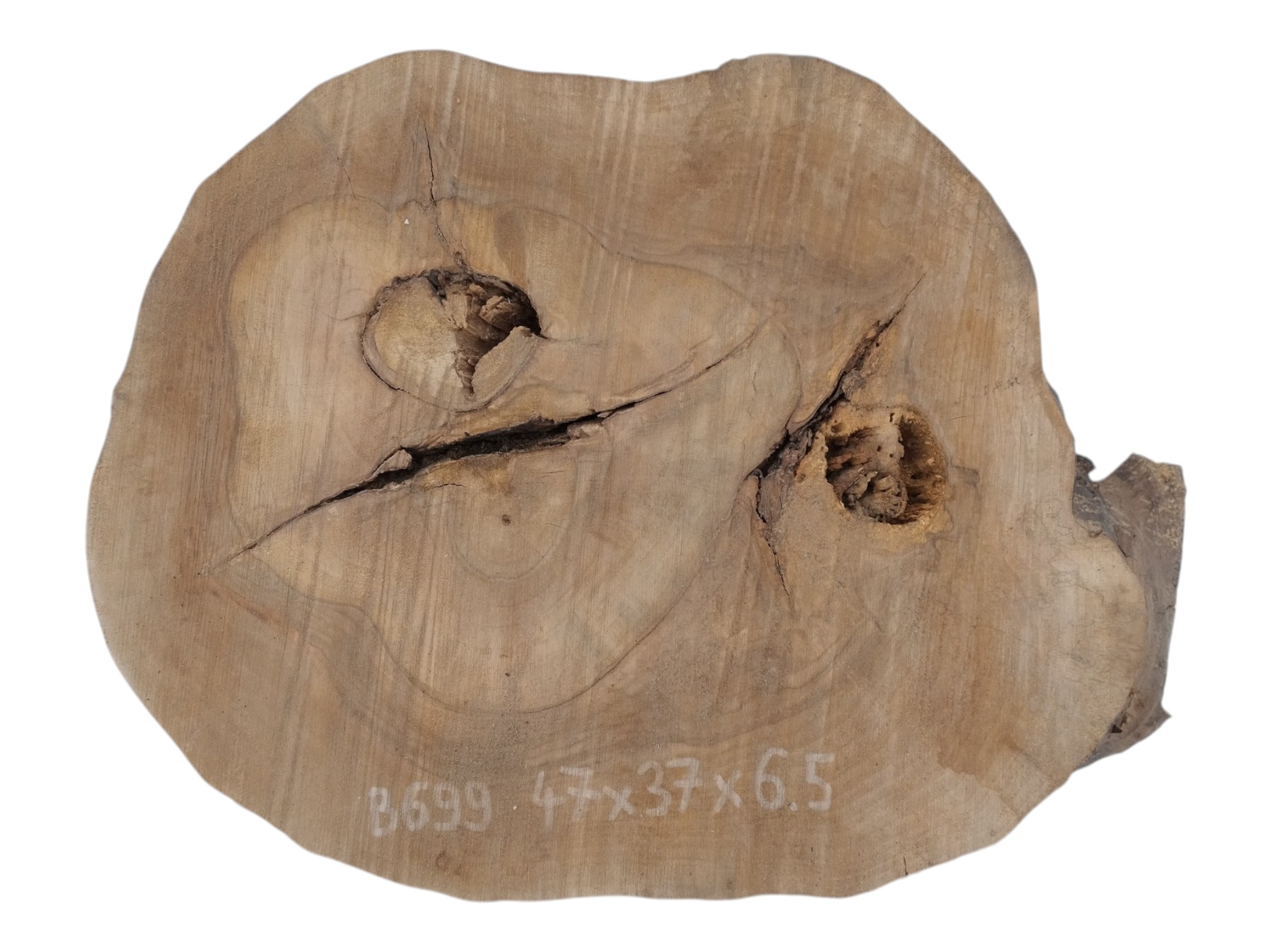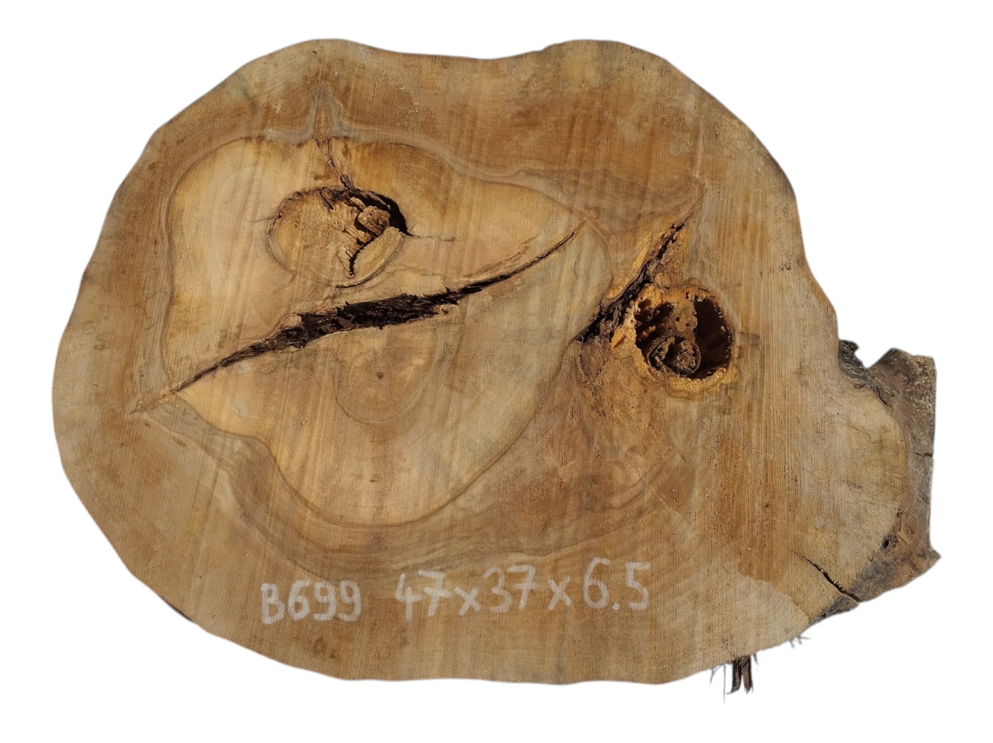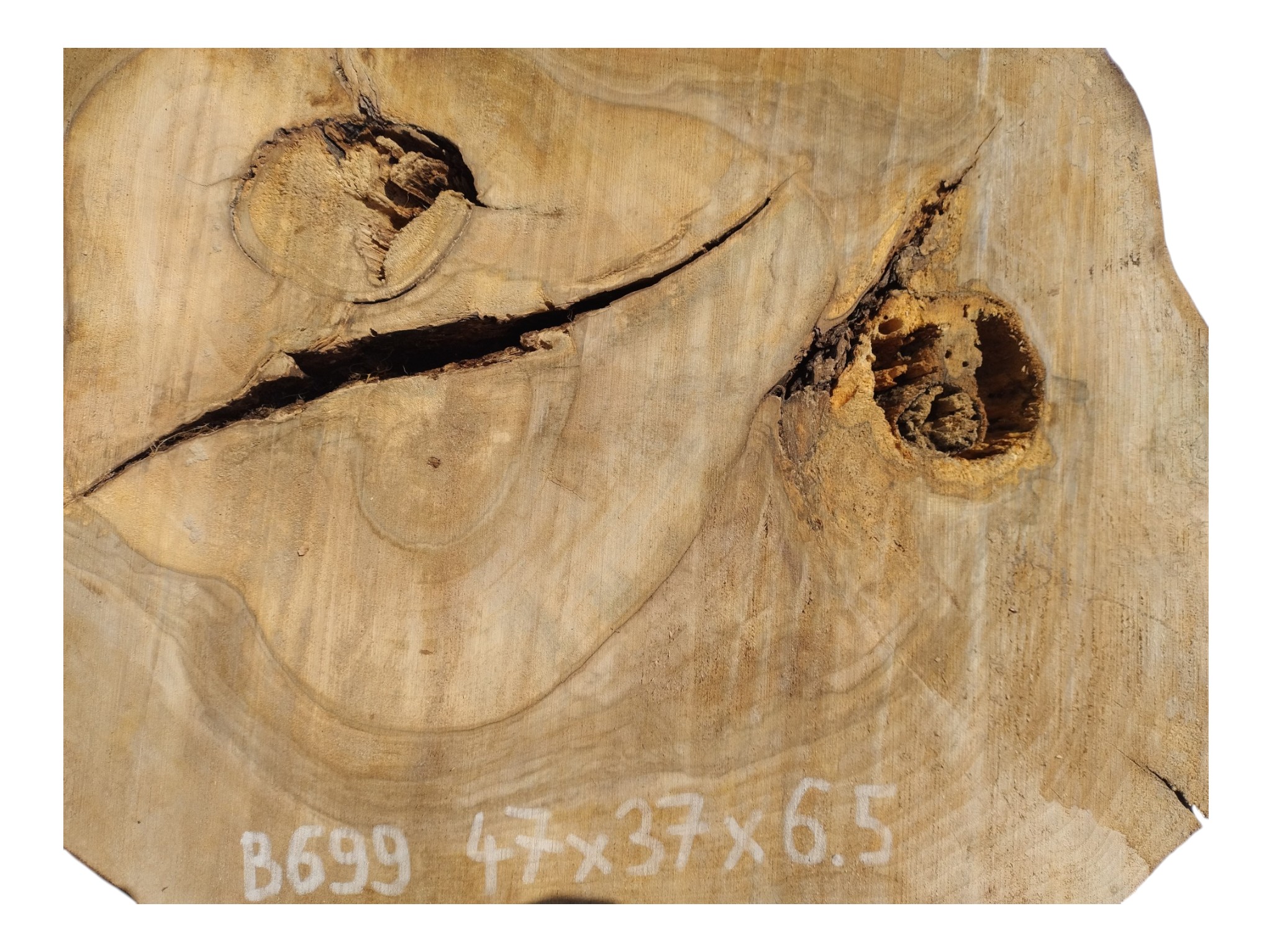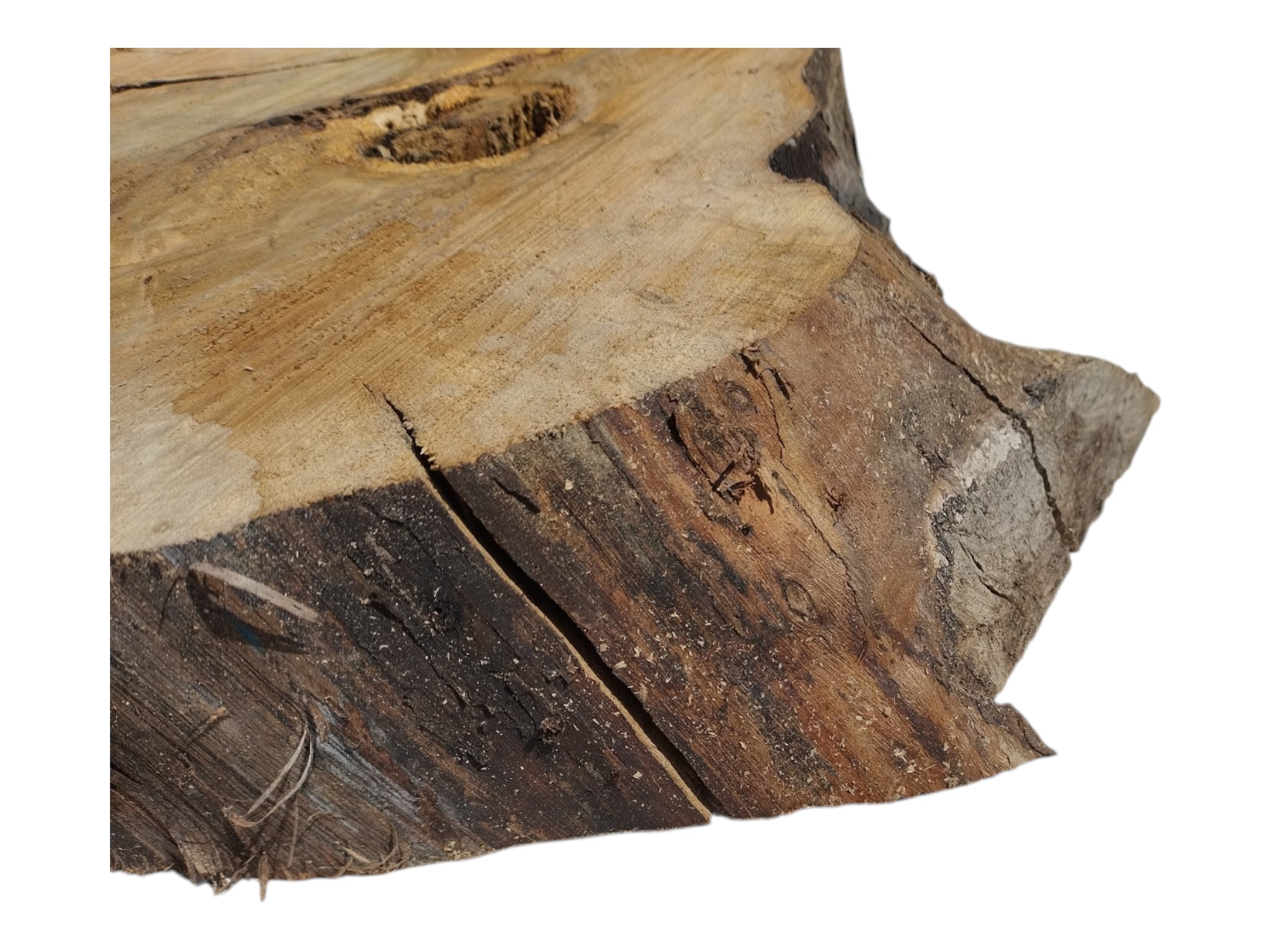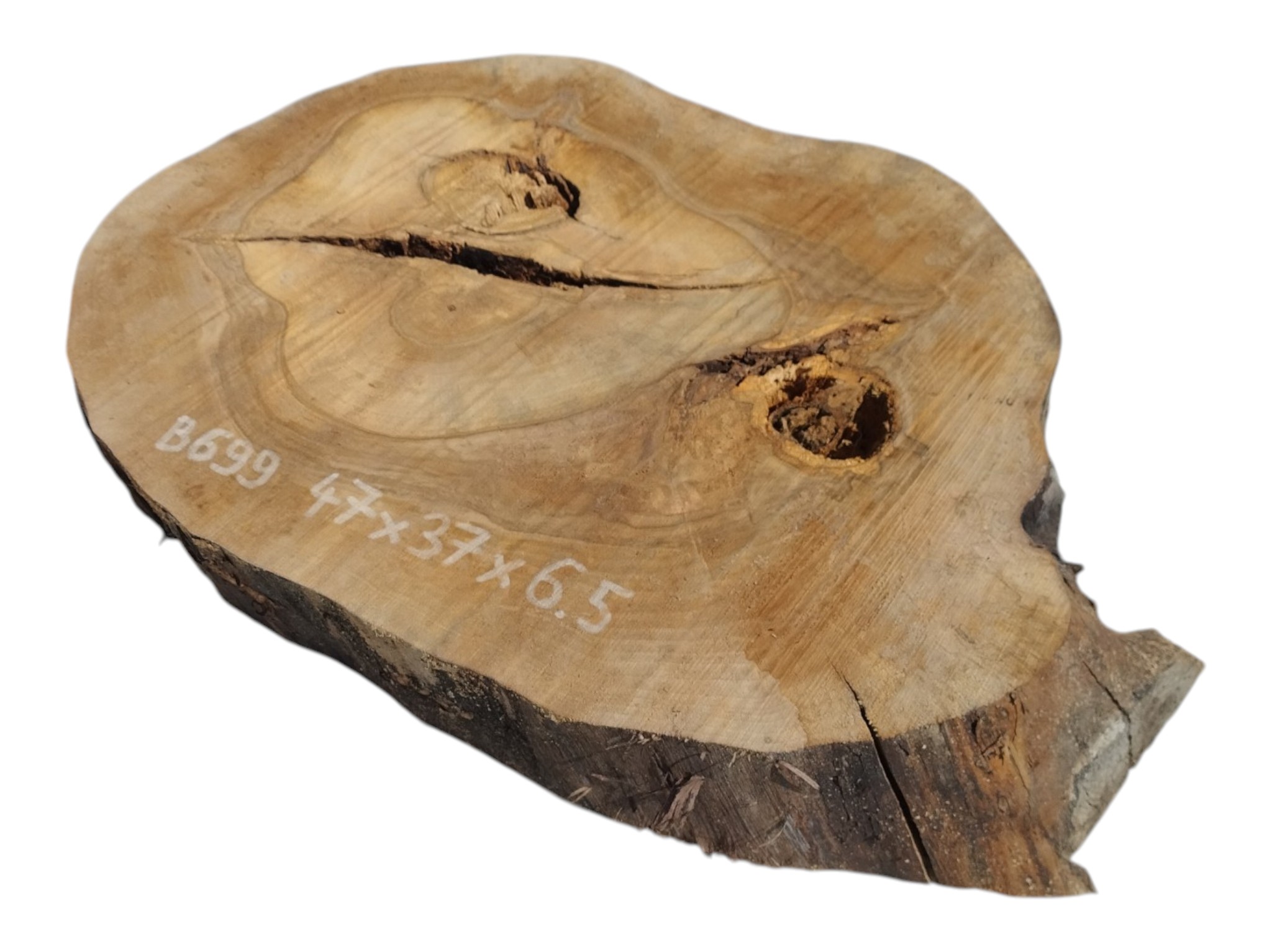 Zdjęcia robimy od razu po przecięciu, żeby jak najlepiej pokazać w jaki sposób można wyprowadzić plaster i podkreślić jego strukturę. W procesie suszenia naturalną rzeczą są pęknięcia materiału powstałe w skutek oddawania wilgoci oraz powierzchowna zmiana barwy. Zdjęcie nr 2 w galerii przedstawia stan plastra z kwietnia 2026 – wtedy została zmierzona podana wilgotność.