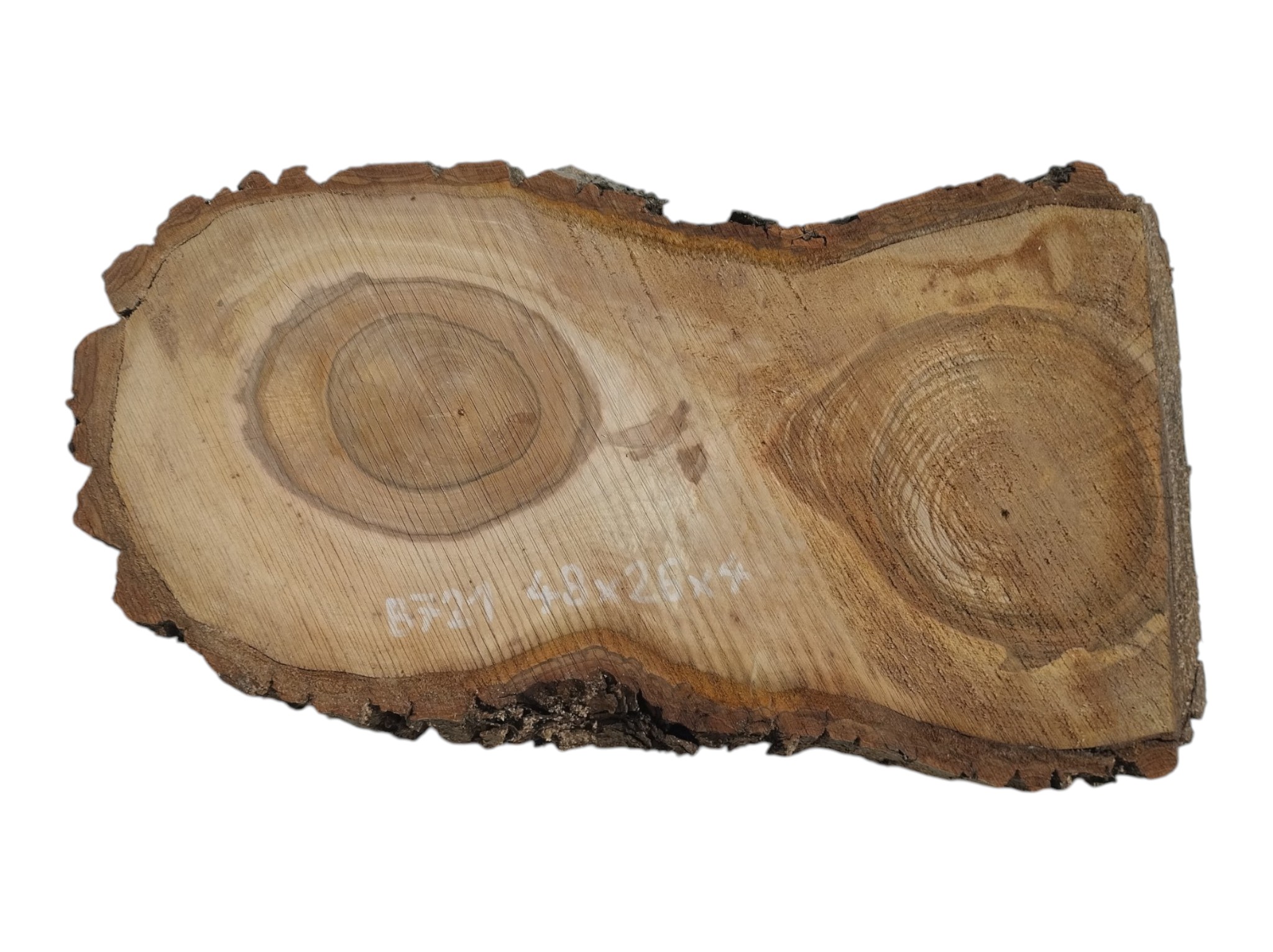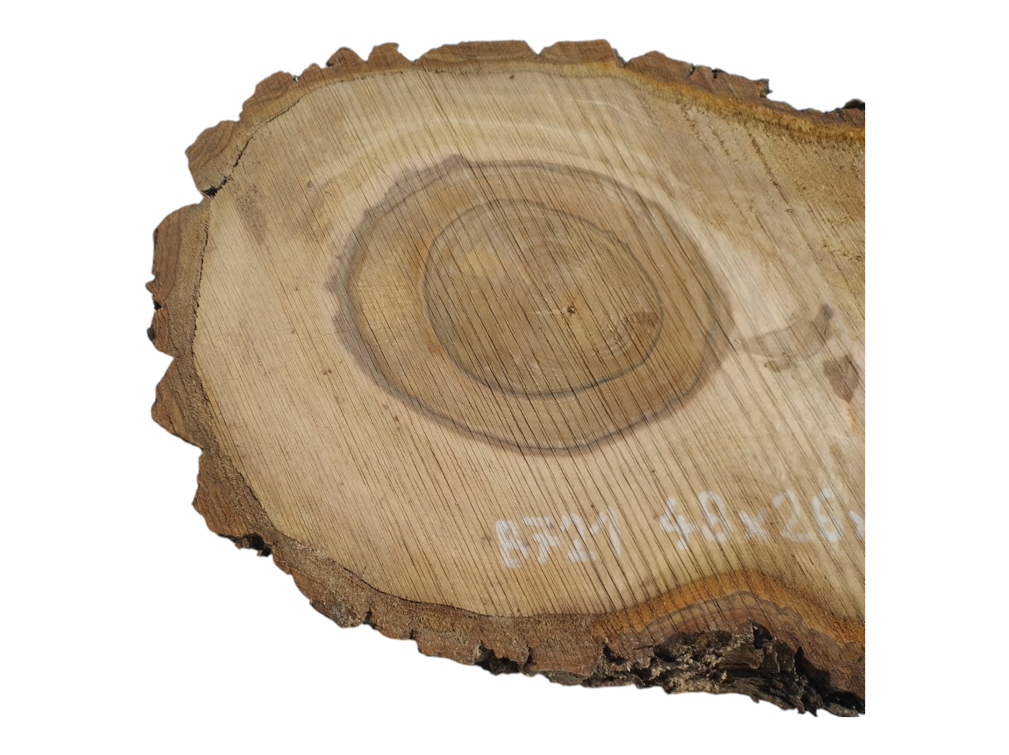 Zdjęcia robimy od razu po przecięciu, żeby jak najlepiej pokazać w jaki sposób można wyprowadzić plaster i podkreślić jego strukturę. W procesie suszenia naturalną rzeczą są pęknięcia materiału powstałe w skutek oddawania wilgoci oraz powierzchowna zmiana barwy. Zdjęcie nr 2 w galerii przedstawia stan plastra z kwietnia 2026 – wtedy została zmierzona podana wilgotność.