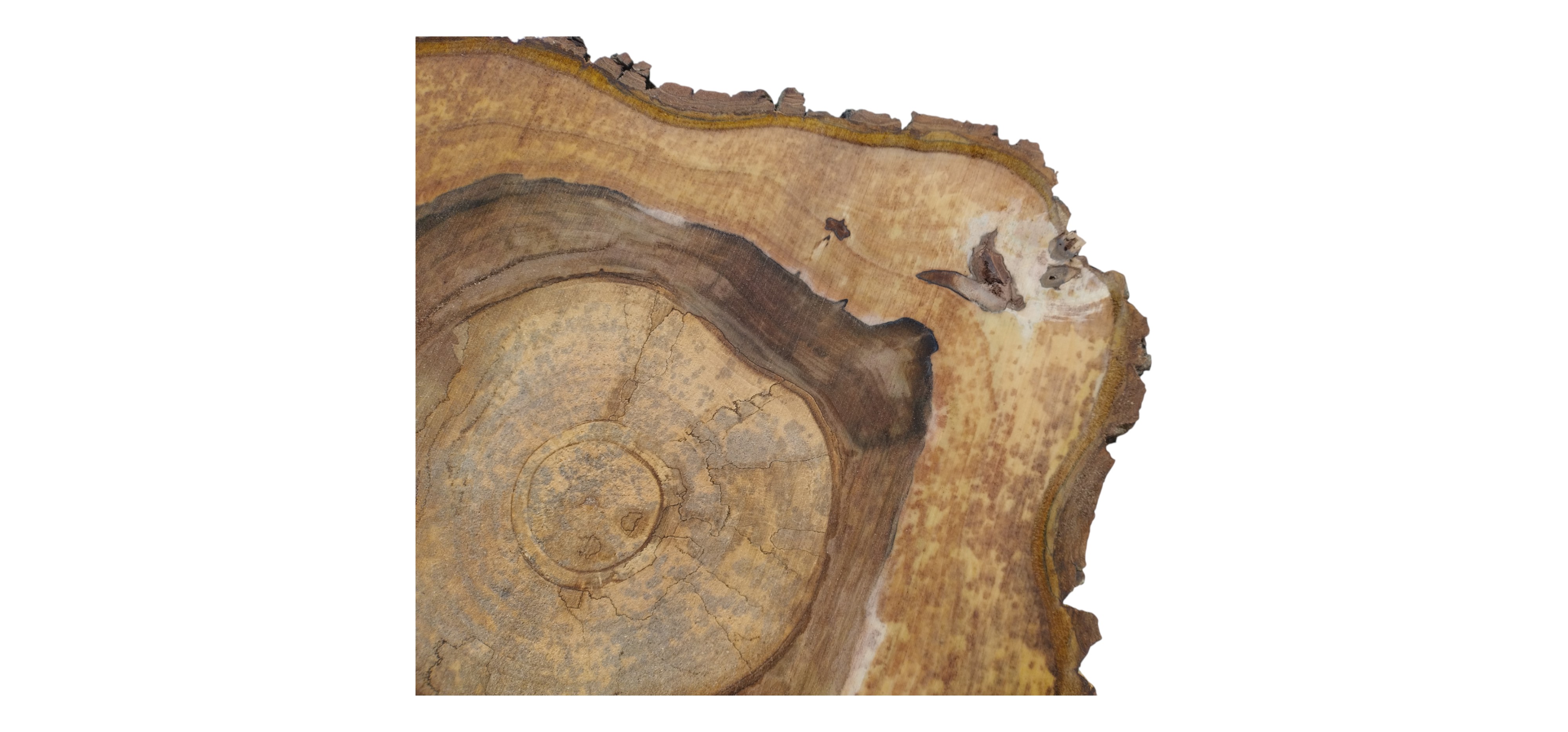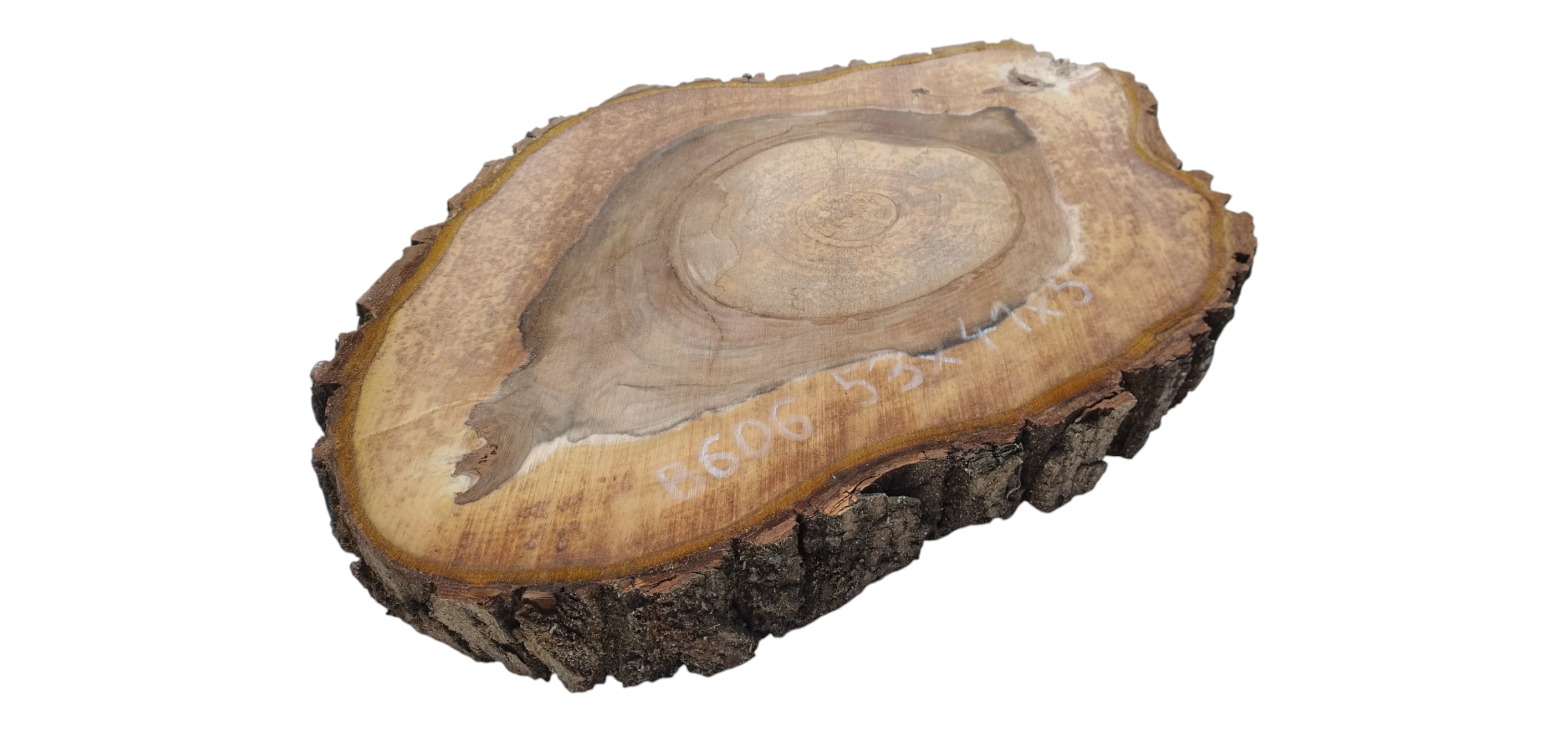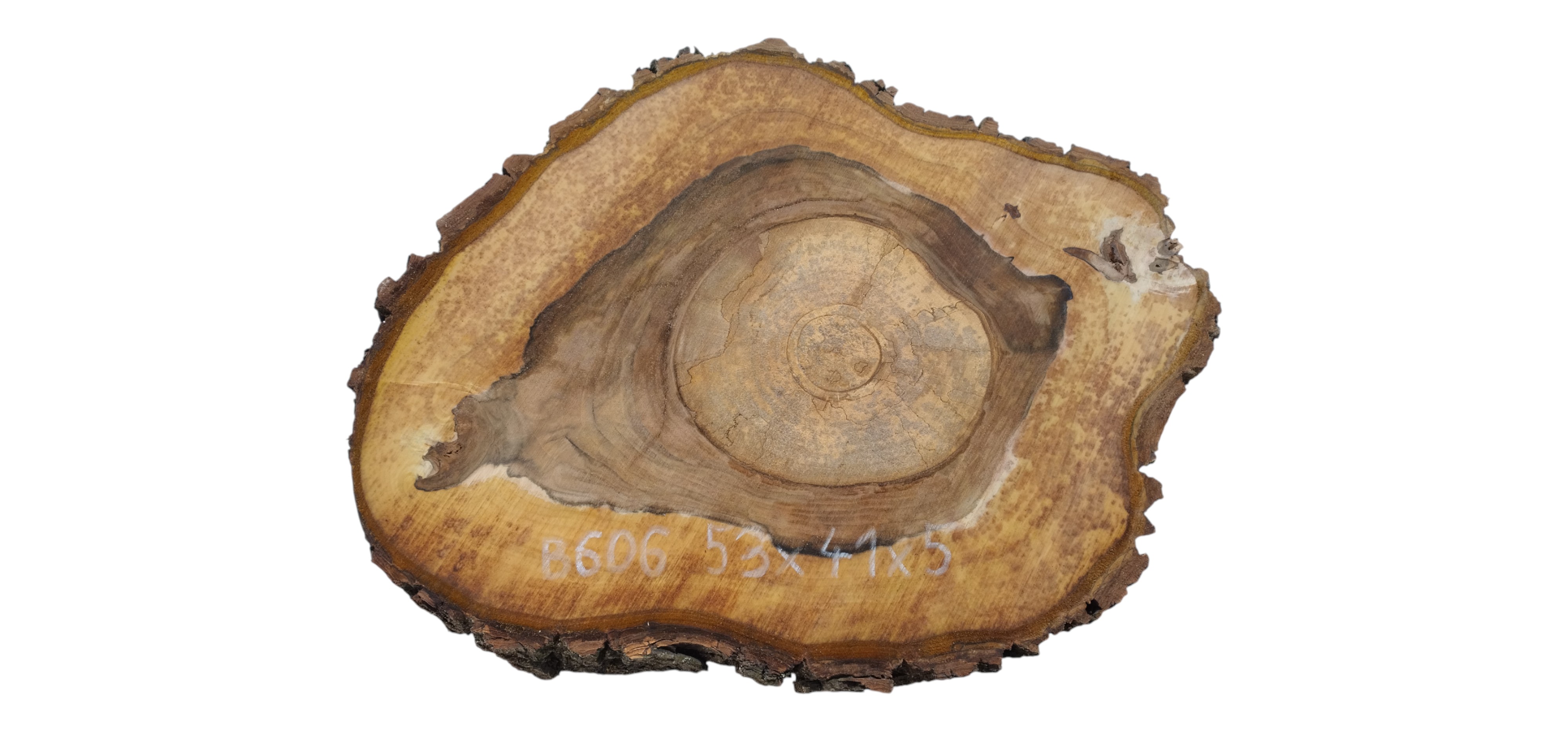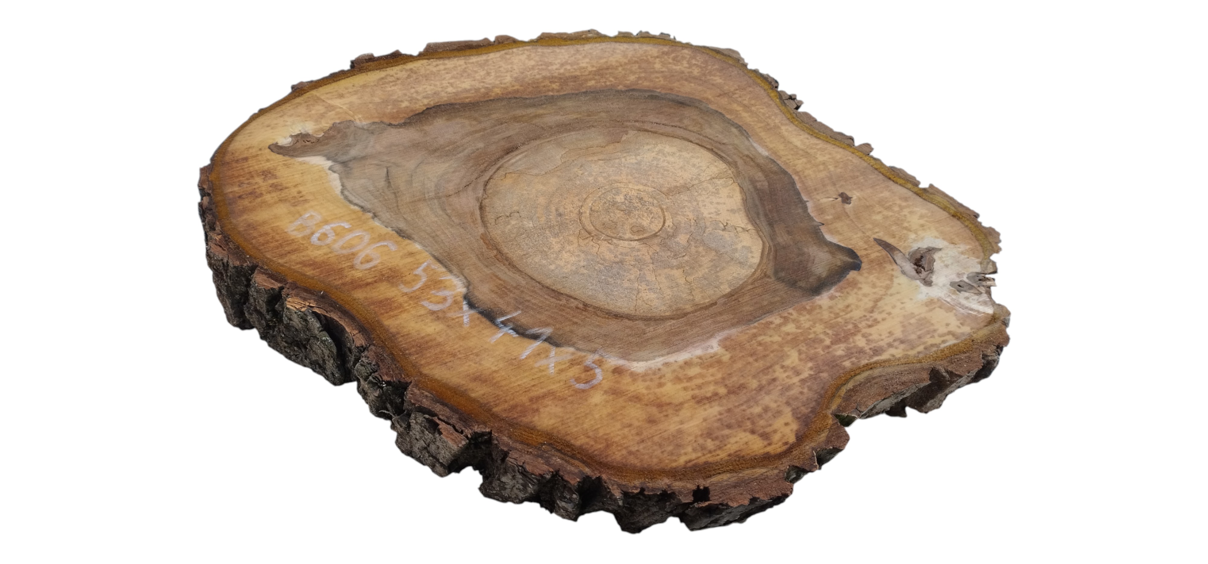 Zdjęcia robimy od razu po przecięciu, żeby jak najlepiej pokazać w jaki sposób można wyprowadzić plaster i podkreślić jego strukturę. W procesie suszenia naturalną rzeczą są pęknięcia materiału powstałe w skutek oddawania wilgoci oraz powierzchowna zmiana barwy. Zdjęcie nr 2 w galerii przedstawia stan plastra z grudnia 2025 – wtedy została zmierzona podana wilgotność.