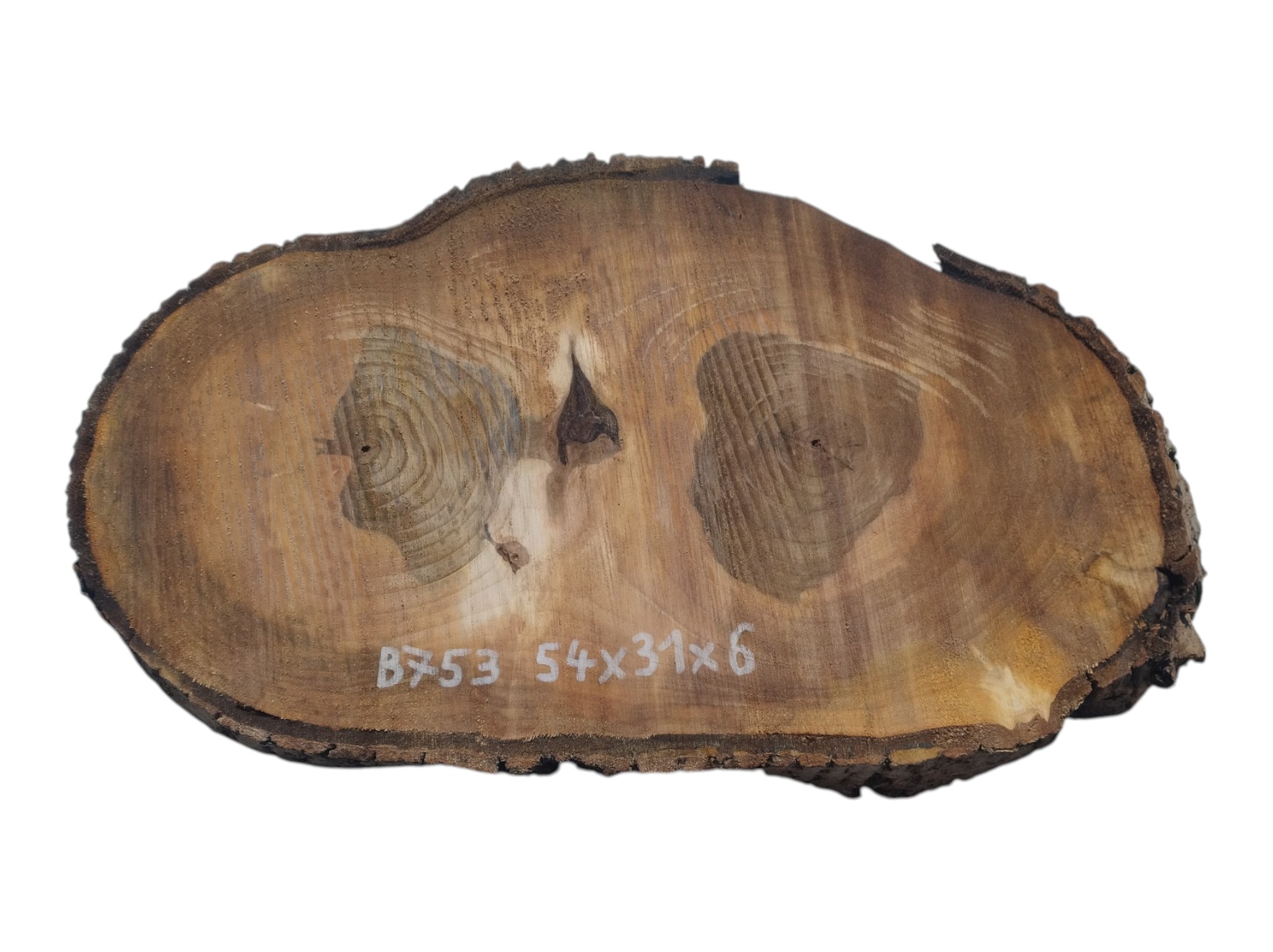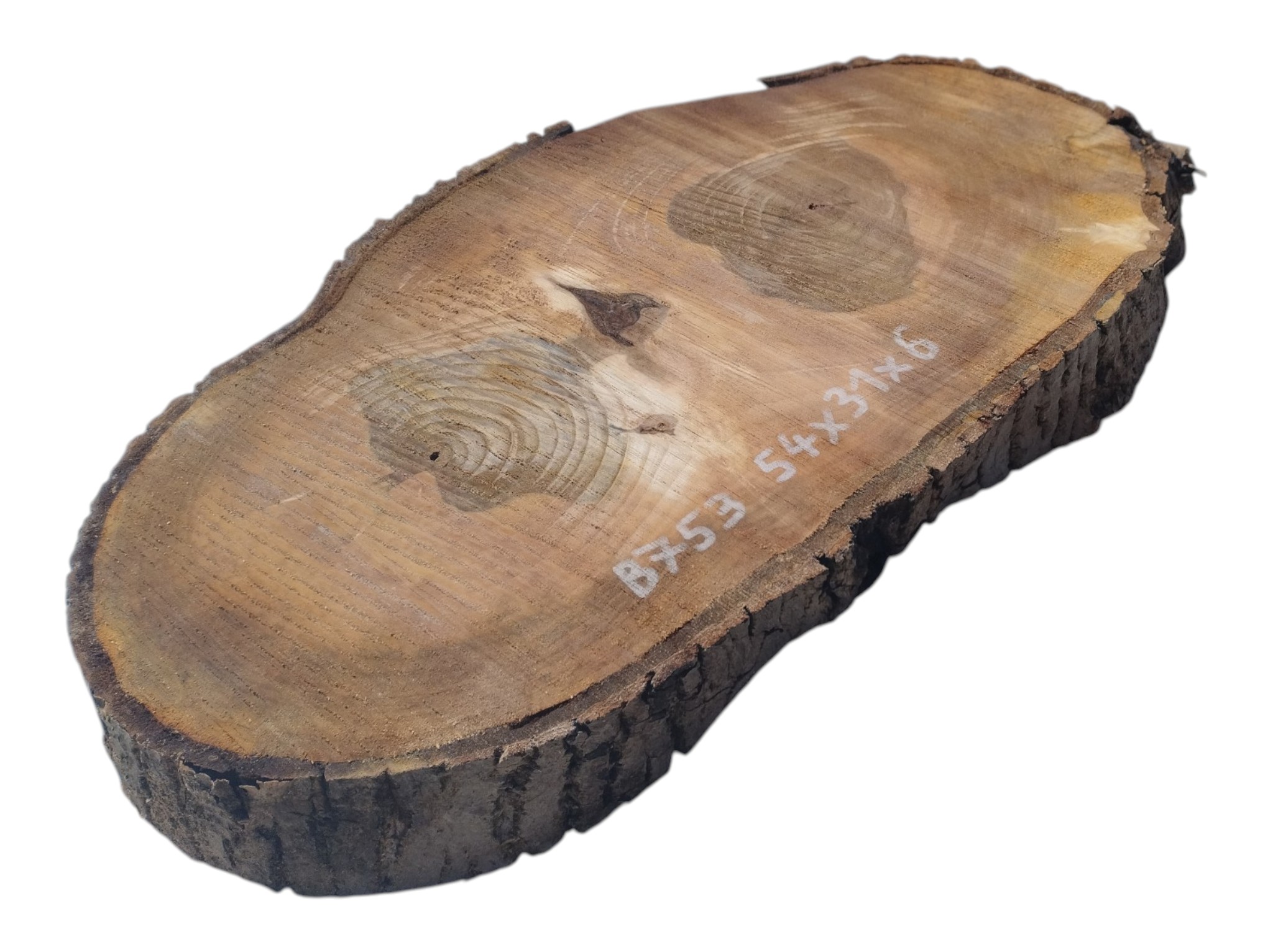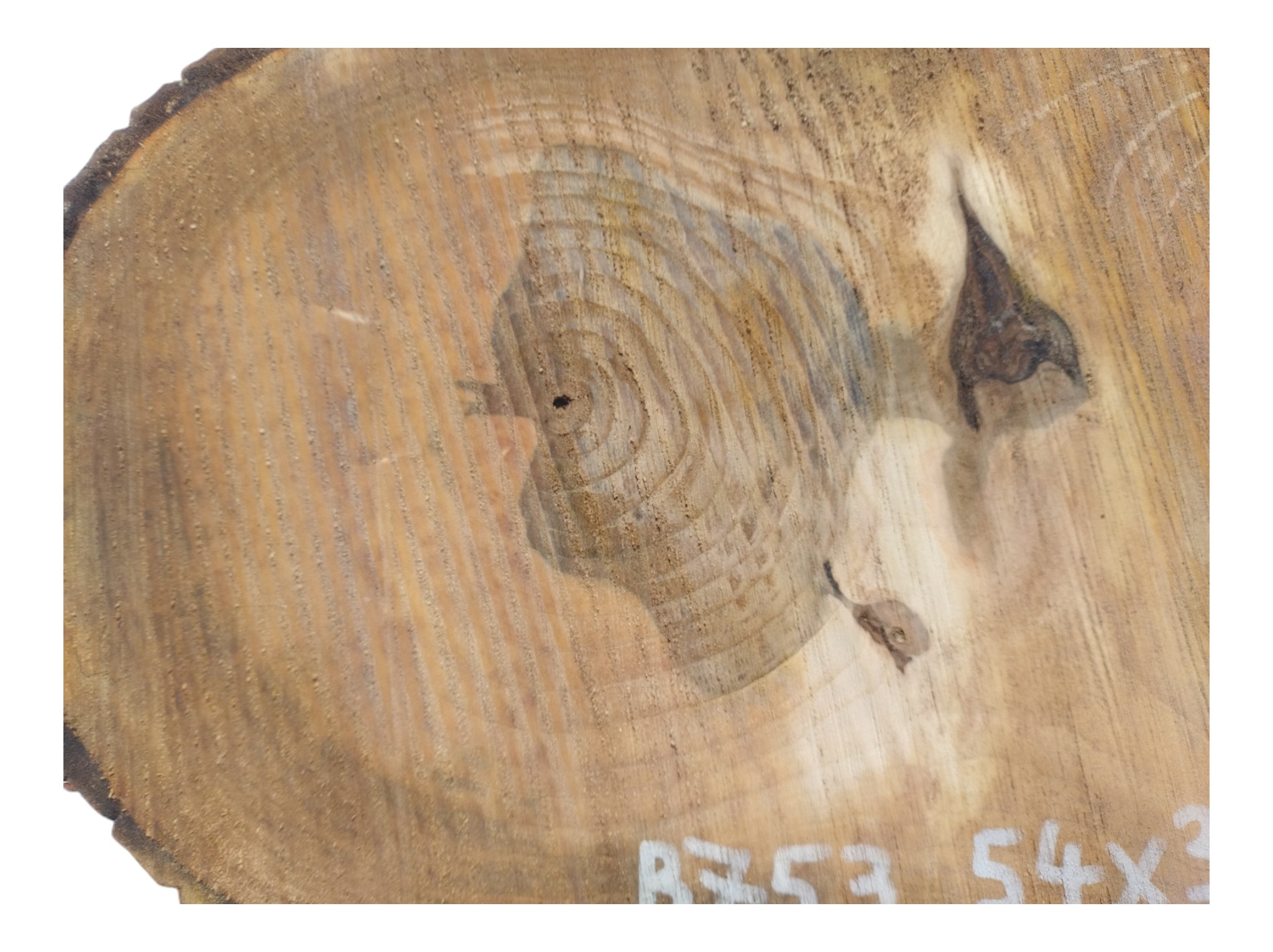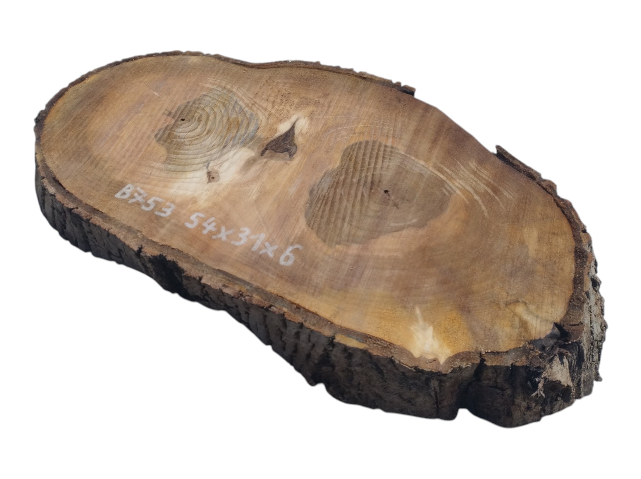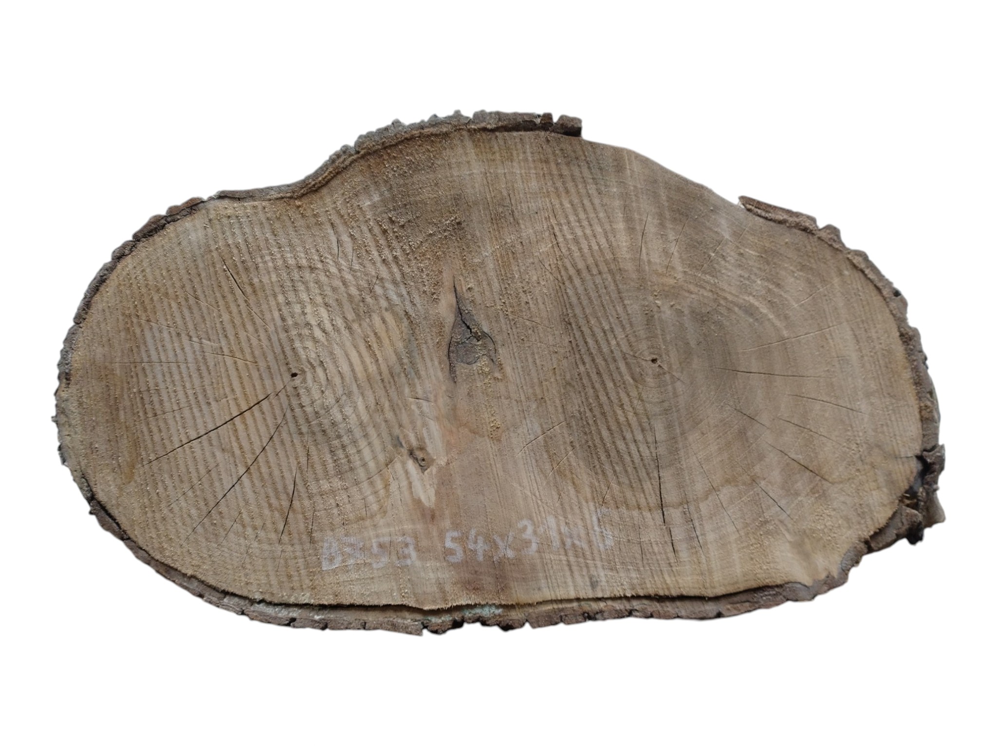 Zdjęcia robimy od razu po przecięciu, żeby jak najlepiej pokazać w jaki sposób można wyprowadzić plaster i podkreślić jego strukturę. W procesie suszenia naturalną rzeczą są pęknięcia materiału powstałe w skutek oddawania wilgoci oraz powierzchowna zmiana barwy. Zdjęcie nr 2 w galerii przedstawia stan plastra z kwietnia 2026 – wtedy została zmierzona podana wilgotność.