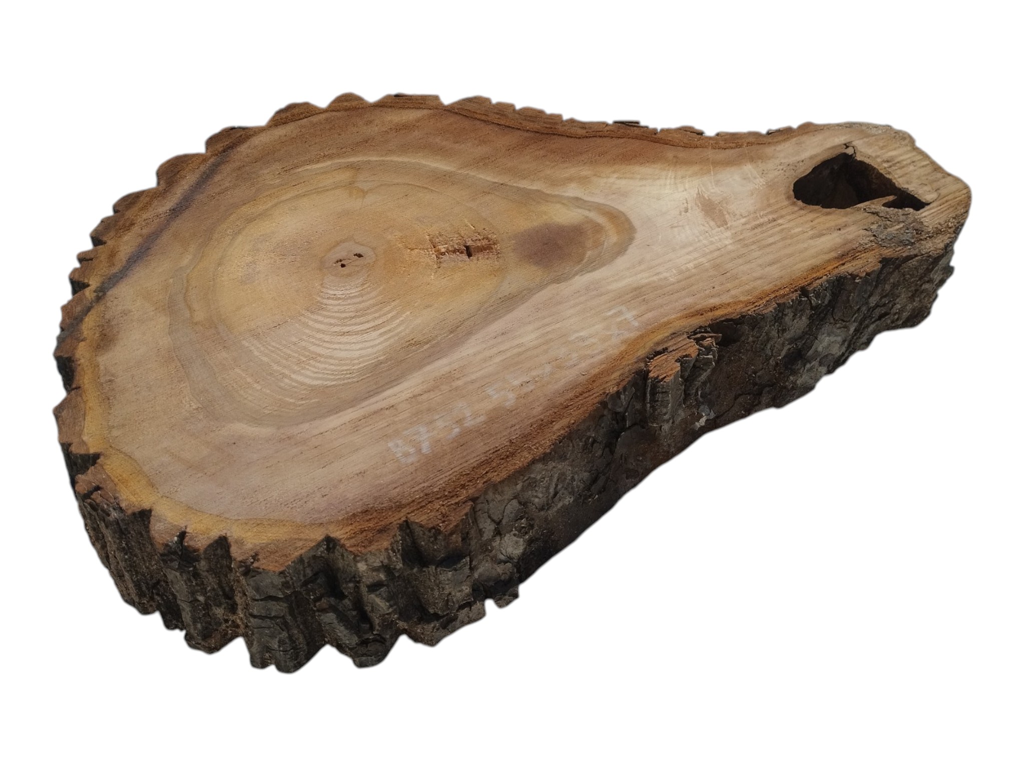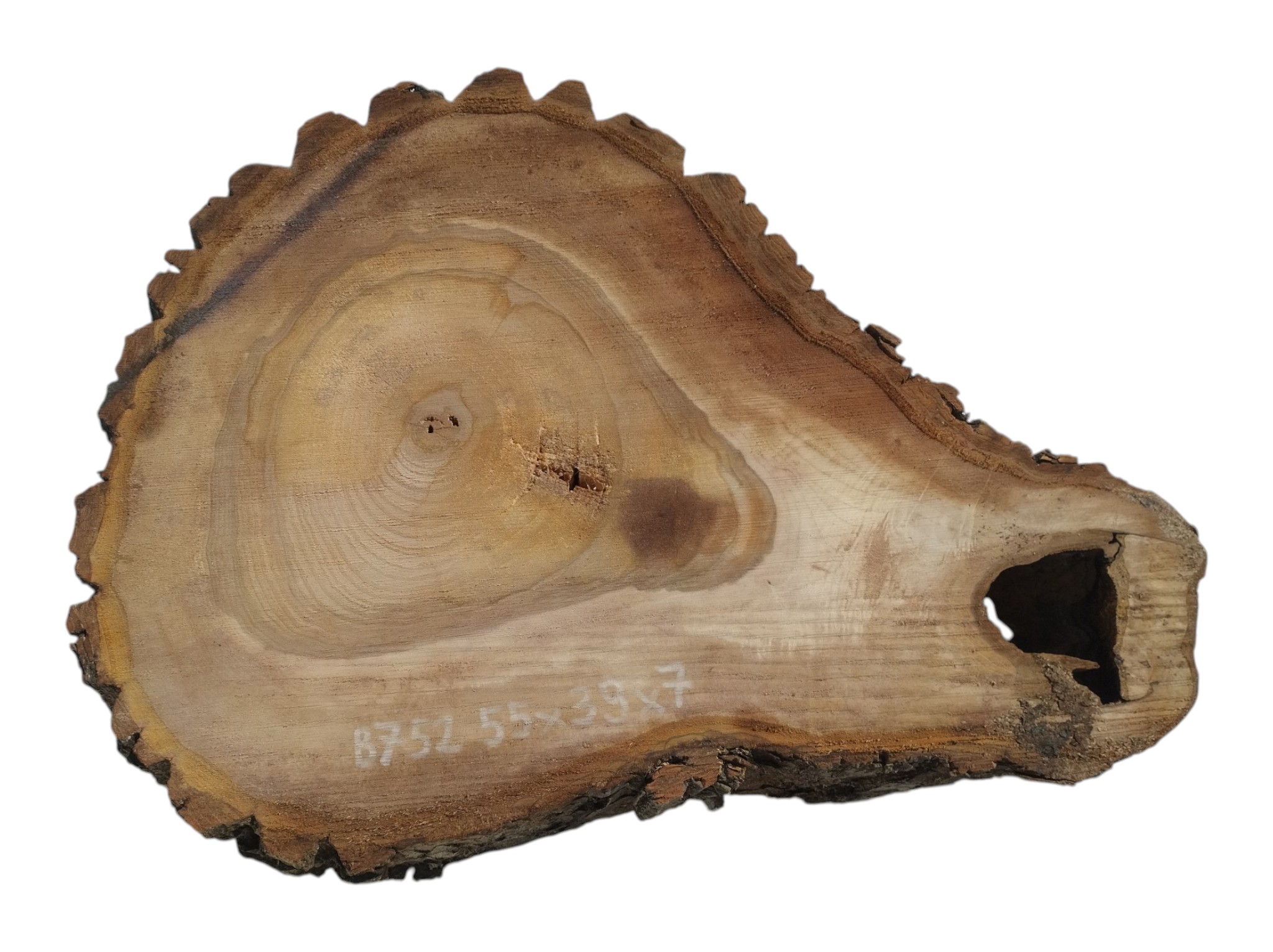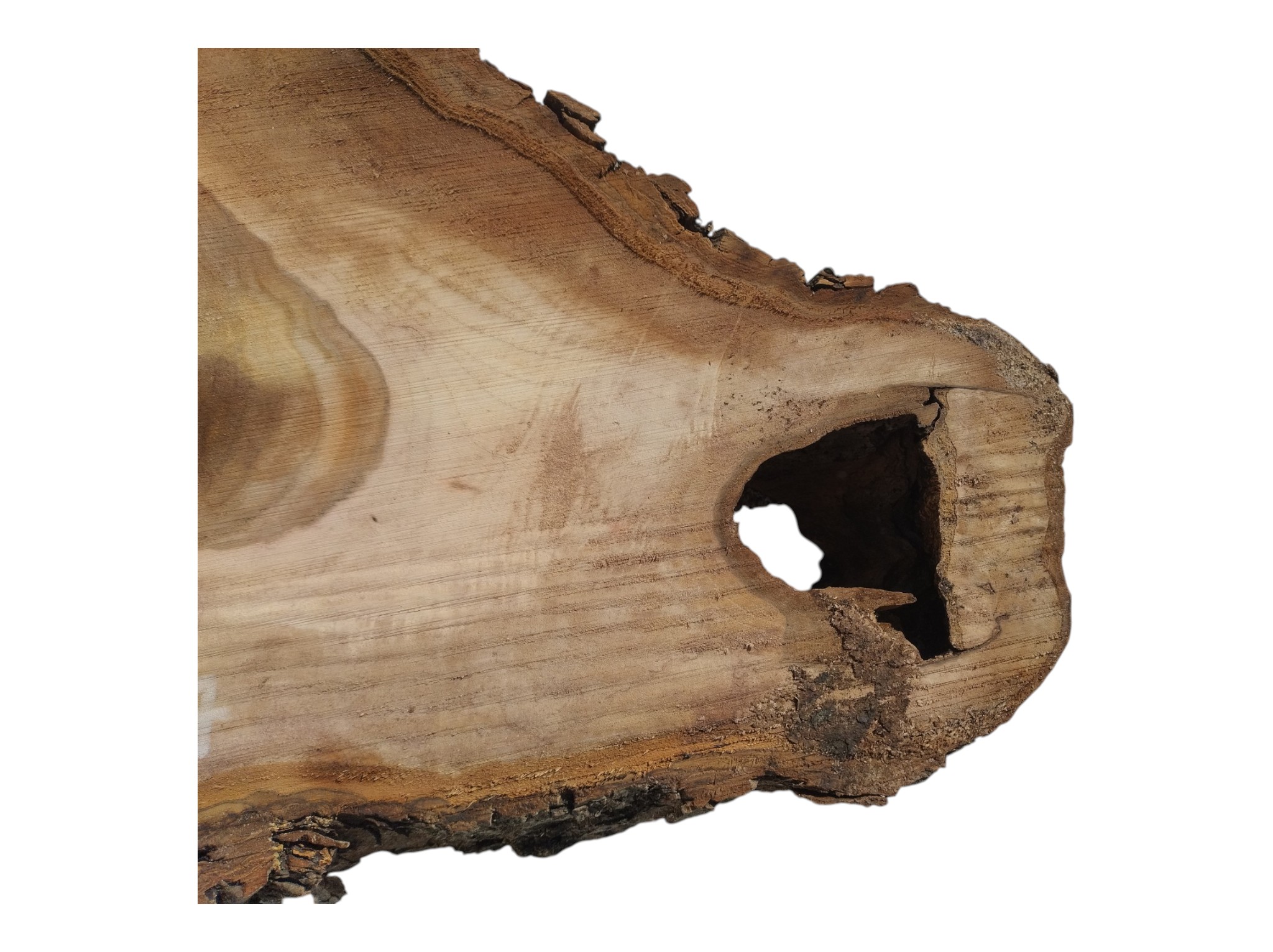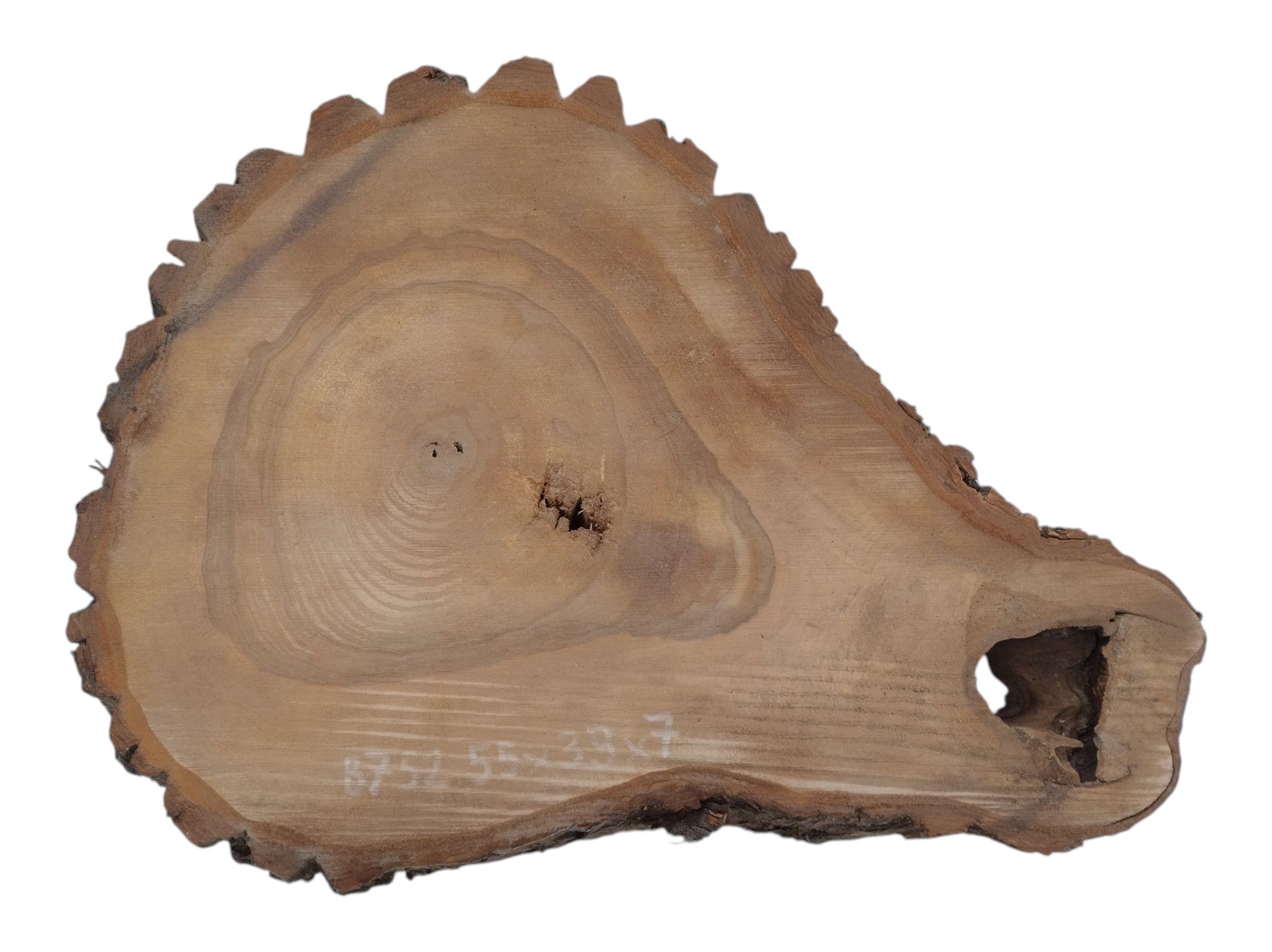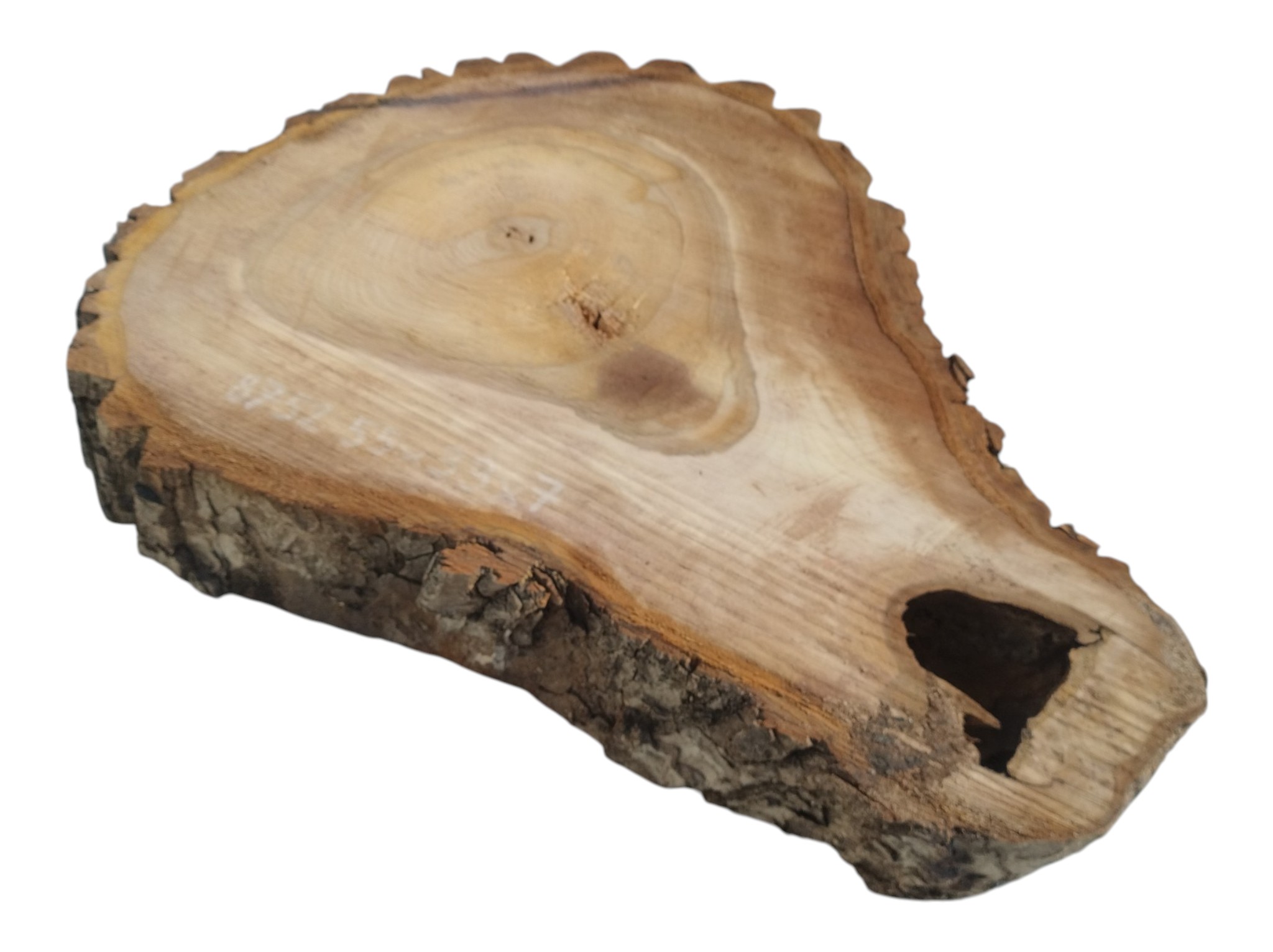 Zdjęcia robimy od razu po przecięciu, żeby jak najlepiej pokazać w jaki sposób można wyprowadzić plaster i podkreślić jego strukturę. W procesie suszenia naturalną rzeczą są pęknięcia materiału powstałe w skutek oddawania wilgoci oraz powierzchowna zmiana barwy. Zdjęcie nr 2 w galerii przedstawia stan plastra z kwietnia 2026 – wtedy została zmierzona podana wilgotność.