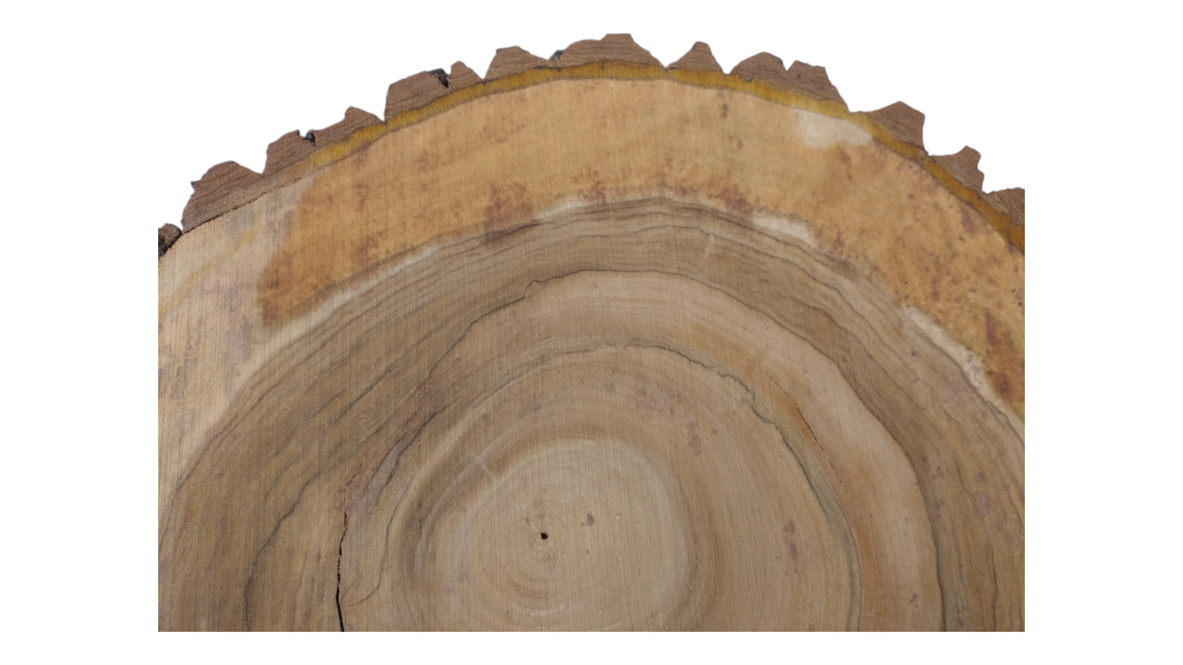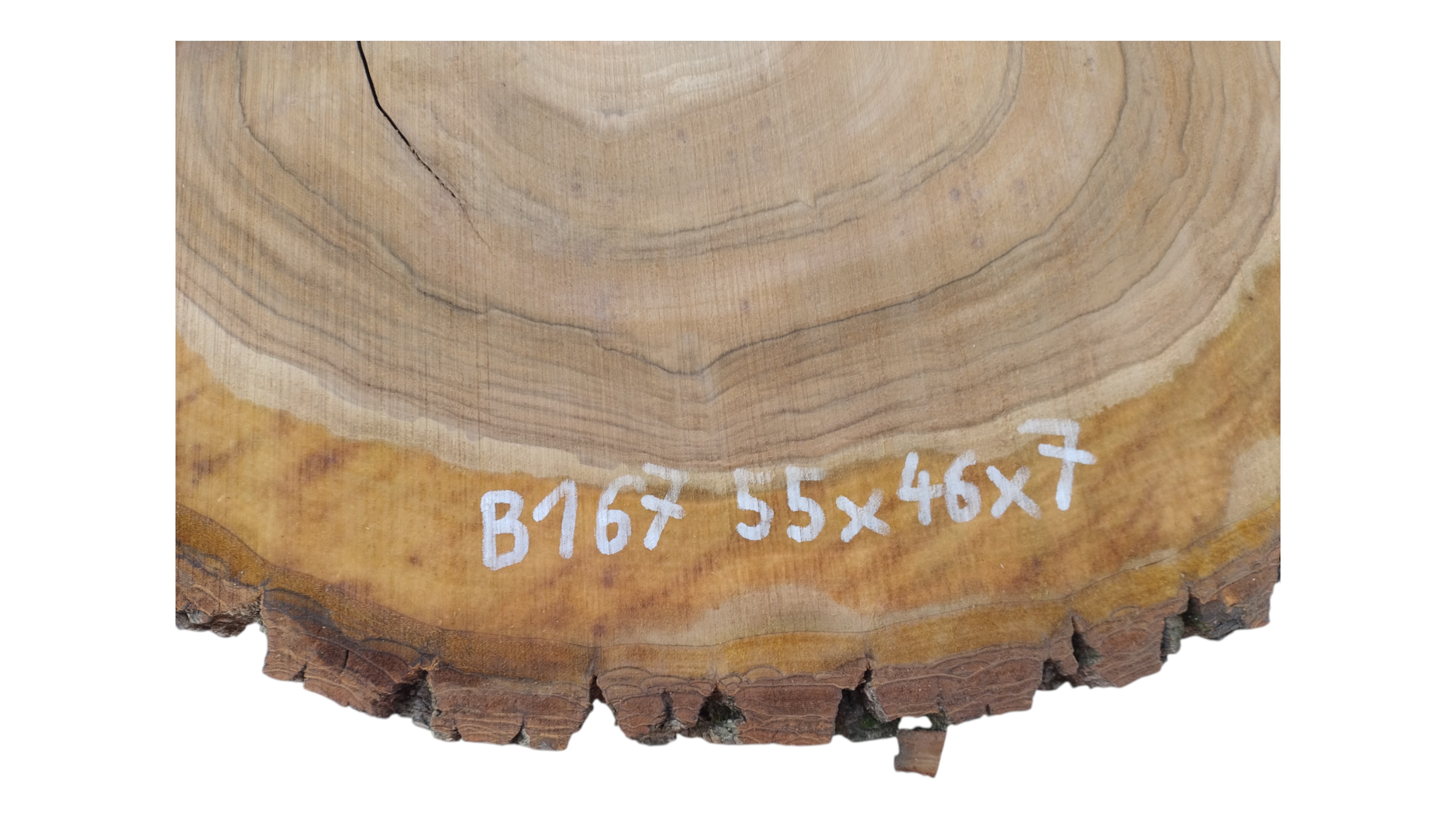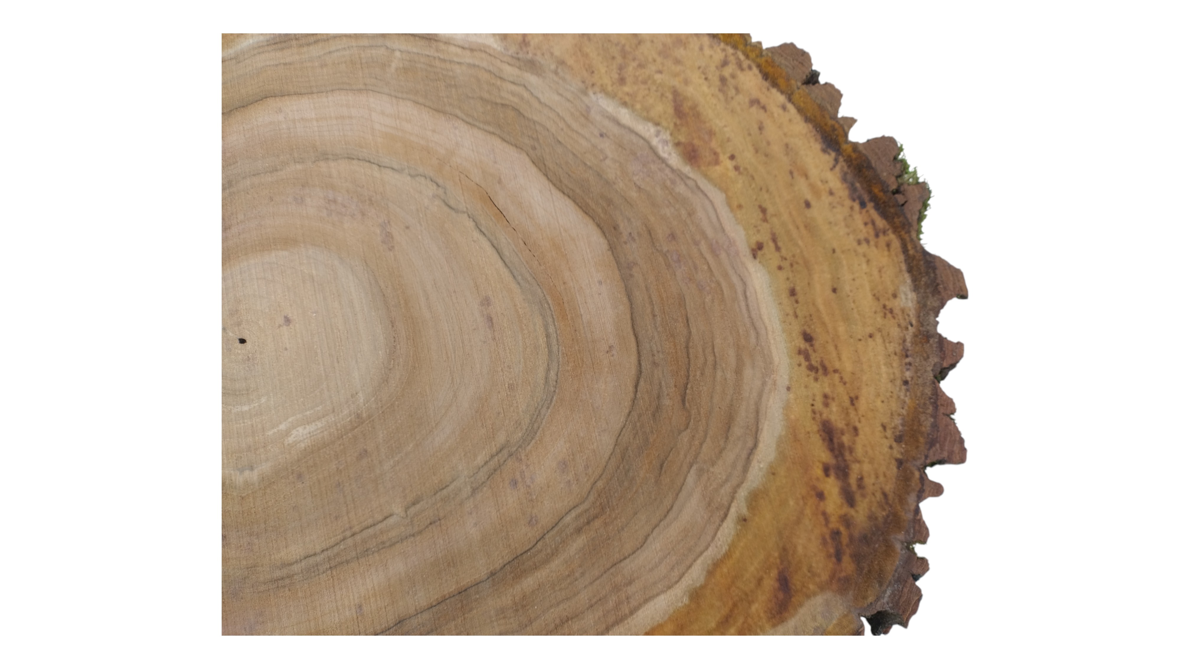 Zdjęcia robimy od razu po przecięciu, żeby jak najlepiej pokazać w jaki sposób można wyprowadzić plaster i podkreślić jego strukturę. W procesie suszenia naturalną rzeczą są pęknięcia materiału powstałe w skutek oddawania wilgoci oraz powierzchowna zmiana barwy. Zdjęcie nr 2 w galerii przedstawia stan plastra z maja 2025 – wtedy została zmierzona podana wilgotność.