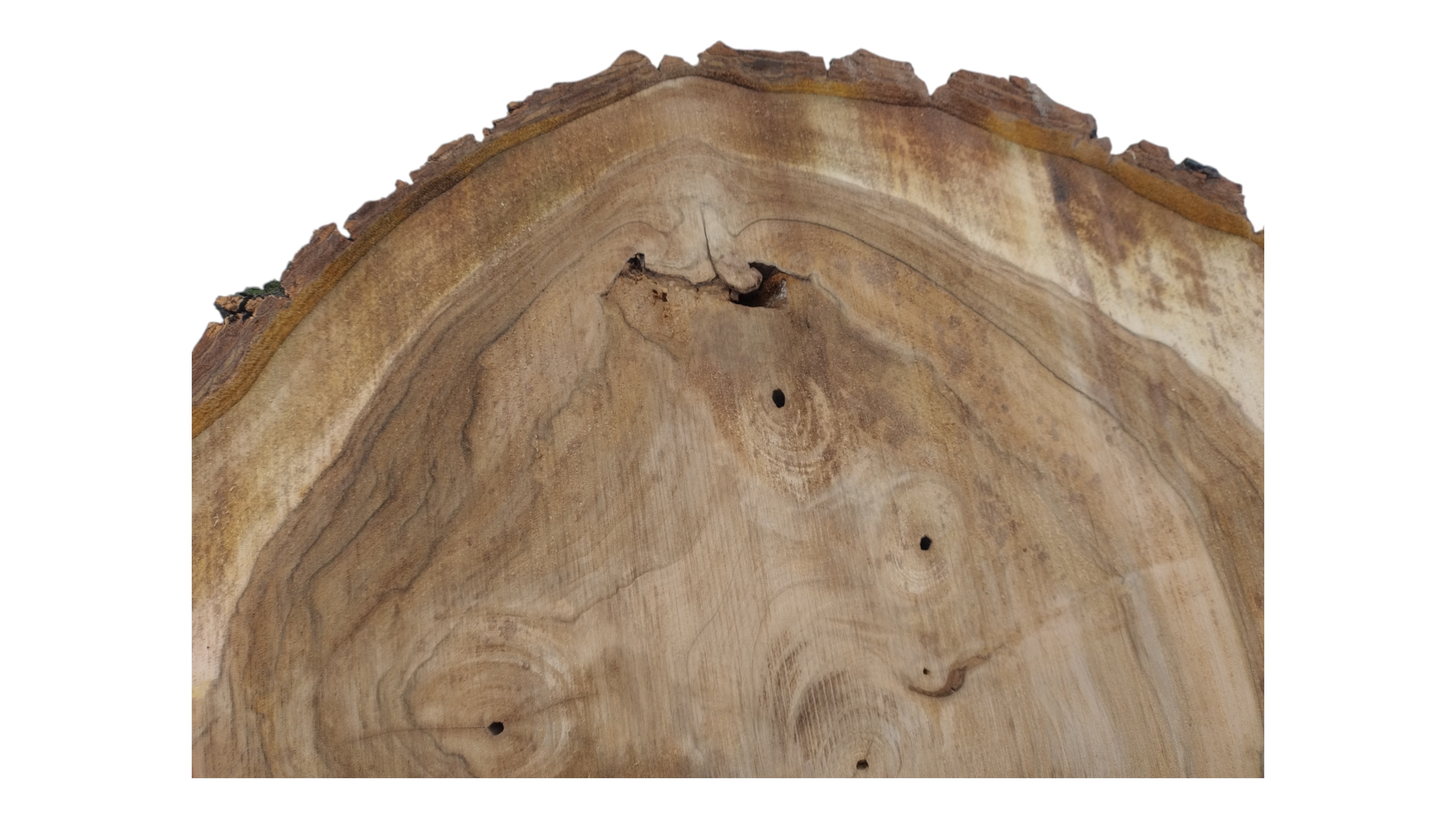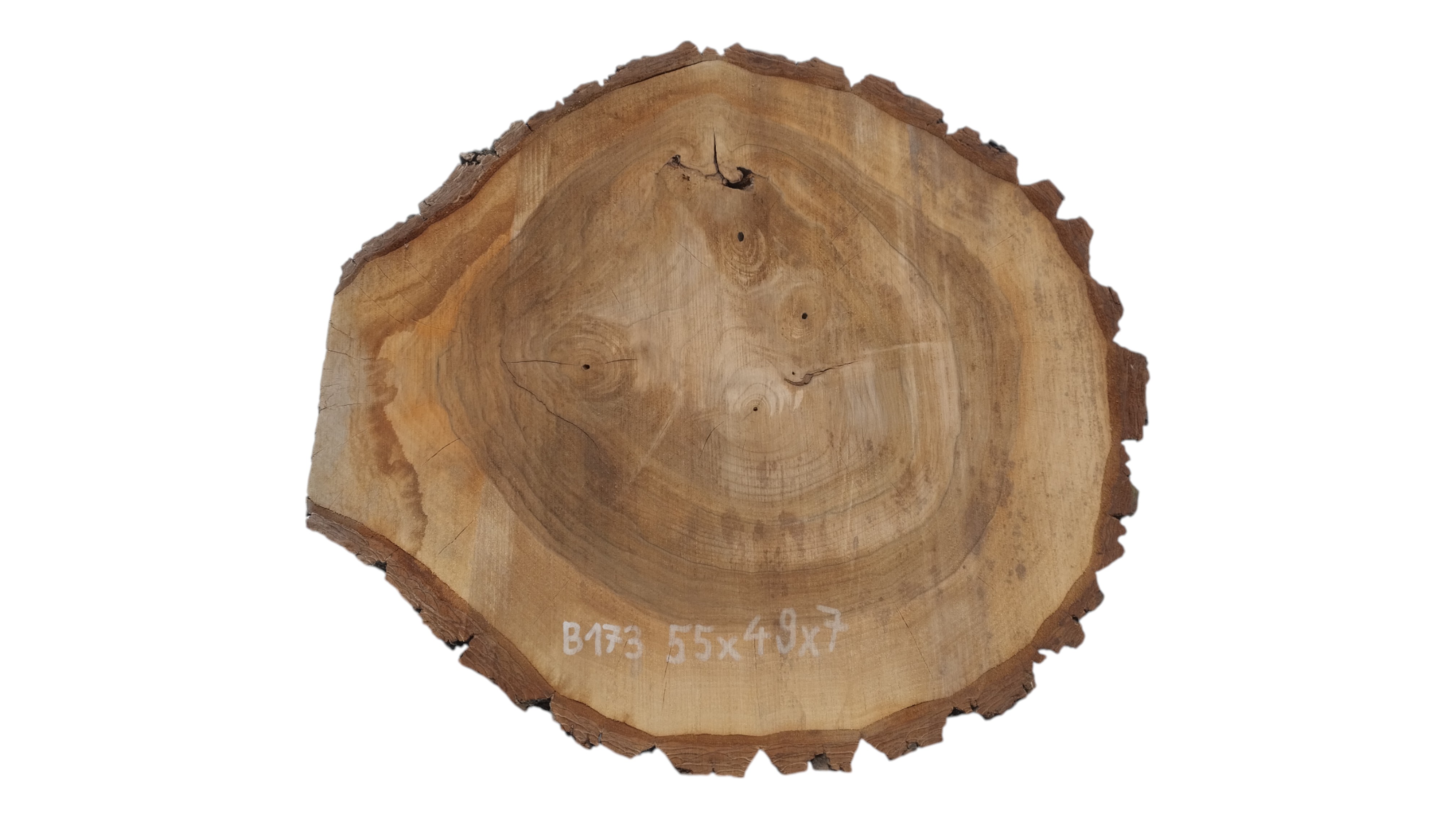 Zdjęcia robimy od razu po przecięciu, żeby jak najlepiej pokazać w jaki sposób można wyprowadzić plaster i podkreślić jego strukturę. W procesie suszenia naturalną rzeczą są pęknięcia materiału powstałe w skutek oddawania wilgoci oraz powierzchowna zmiana barwy. Zdjęcie nr 2 w galerii przedstawia stan plastra z maja 2025 – wtedy została zmierzona podana wilgotność.